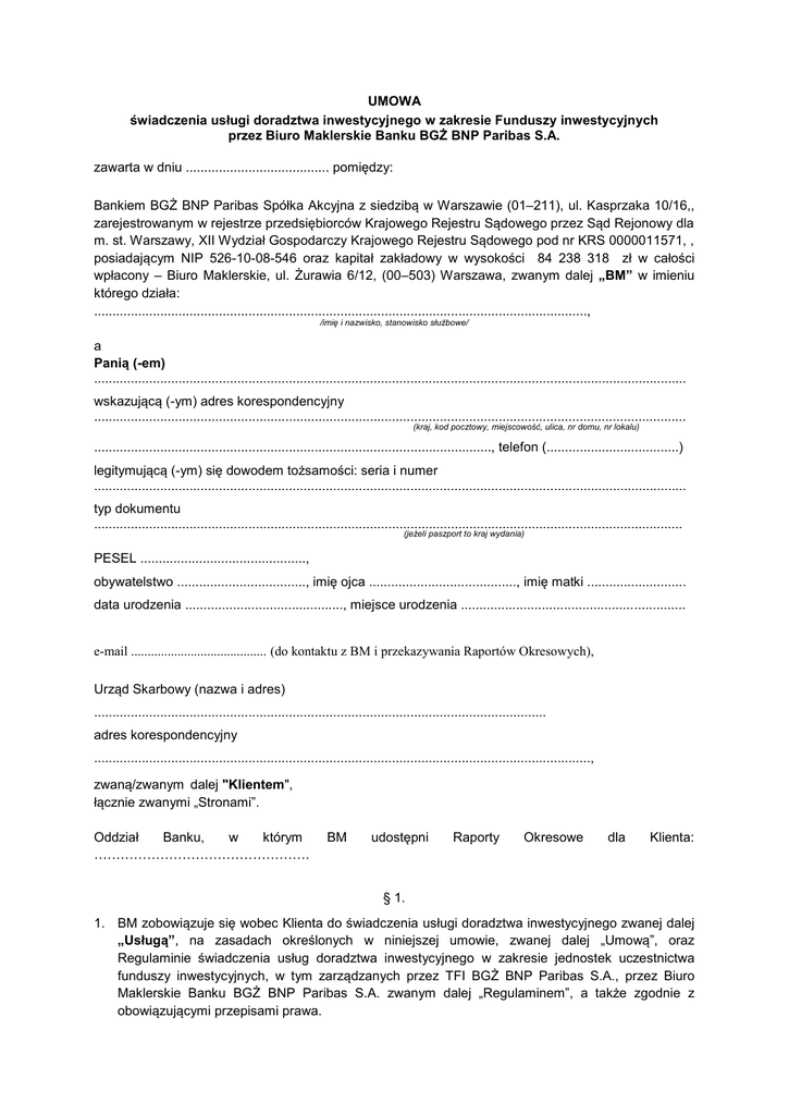 UMOWA świadczenia usługi doradztwa inwestycyjnego w zakresie Funduszy inwestycyjnych przez Biuro Maklerskie Banku BGŻ BNP Paribas S.A. zawarta w dniu ....................................... pomiędzy: Bankiem BGŻ BNP Paribas Spółka Akcyjna z siedzibą w Warszawie (01–211), ul. Kasprzaka 10/16,, zarejestrowanym w rejestrze przedsiębiorców Krajowego Rejestru Sądowego przez Sąd Rejonowy dla m. st. Warszawy, XII Wydział Gospodarczy Krajowego Rejestru Sądowego pod nr KRS 0000011571, , posiadającym NIP 526-10-08-546 oraz kapitał zakładowy w wysokości 84 238 318 zł w całości wpłacony – Biuro Maklerskie, ul. Żurawia 6/12, (00–503) Warszawa, zwanym dalej „BM” w imieniu którego działa: ......................................................................................................................................, /imię i nazwisko, stanowisko służbowe/ a Panią (-em) ................................................................................................................................................................. wskazującą (-ym) adres korespondencyjny ................................................................................................................................................................. (kraj, kod pocztowy, miejscowość, ulica, nr domu, nr lokalu) ............................................................................................................, telefon (....................................) legitymującą (-ym) się dowodem tożsamości: seria i numer ................................................................................................................................................................. typ dokumentu ................................................................................................................................................................ (jeżeli paszport to kraj wydania) PESEL ............................................., obywatelstwo ..................................., imię ojca ........................................, imię matki ........................... data urodzenia ..........................................., miejsce urodzenia ............................................................. e-mail ......................................... (do kontaktu z BM i przekazywania Raportów Okresowych), Urząd Skarbowy (nazwa i adres) ........................................................................................................................... adres korespondencyjny ......................................................................................................................................., zwaną/zwanym dalej "Klientem", łącznie zwanymi „Stronami”. Oddział Banku, w którym …………………………………………. BM udostępni Raporty Okresowe dla Klienta: § 1. 1. BM zobowiązuje się wobec Klienta do świadczenia usługi doradztwa inwestycyjnego zwanej dalej „Usługą”, na zasadach określonych w niniejszej umowie, zwanej dalej „Umową”, oraz Regulaminie świadczenia usług doradztwa inwestycyjnego w zakresie jednostek uczestnictwa funduszy inwestycyjnych, w tym zarządzanych przez TFI BGŻ BNP Paribas S.A., przez Biuro Maklerskie Banku BGŻ BNP Paribas S.A. zwanym dalej „Regulaminem”, a także zgodnie z obowiązującymi przepisami prawa. 2. Występujące w Umowie określenia, niezdefiniowane bezpośrednio w jej treści, mają znaczenie nadane im w Regulaminie. 3. Usługa polega na udzielaniu rekomendacji przez BM na rzecz Klienta, w oparciu o jego potrzeby inwestycyjne, preferencje i sytuację indywidualną, a także jego wiedzę, doświadczenie w zakresie inwestowania w Fundusze inwestycyjne, sytuację finansową oraz cele inwestycyjne (Profil inwestycyjny), w zakresie kupna, sprzedaży, subskrypcji, wymiany, wykonania lub wykupu Funduszy inwestycyjnych albo powstrzymania się od zawarcia transakcji dotyczącej tych instrumentów, poprzez przedstawienie składu Portfela modelowego, w sposób wskazany w ust. 4. 4. Skład Portfela modelowego będzie przedstawiony na ściśle zdefiniowanych grupach aktywów (w ramach Funduszy inwestycyjnych) dostępnych w BM lub w systemie bankowości internetowej Banku, wraz z informacją o przykładowym portfelu zbudowanym wyłącznie z Funduszy inwestycyjnych zarządzanych przez TFI BGŻ BNP Paribas S.A. Portfel modelowy będzie elementem Raportu okresowego. 5. BM świadczy Usługę od dnia zawarcia niniejszej umowy. 6. Raport okresowy, o którym mowa w ust. 4 będzie wysyłany na wskazany w niniejszej umowie adres e-mail w terminie określonym w Regulaminie oraz będzie dostępny dla klienta w Oddziale Banku BGŻ BNP Paribas S.A., wskazanym w niniejszej Umowie. 7. Profil inwestycyjny klienta, o którym mowa w ust. 3 został określony na podstawie dokonanej oceny , o której mowa w § 3 pkt 1 i w dniu zawarcia umowy został określony jako ……………………………….. 7. Profil inwestycyjny klienta może ulegać zmianie, w przypadku zmiany sytuacji indywidualnej (w tym finansowej) Klienta lub jego celów inwestycyjnych. W takim wypadku Raport okresowy będzie przygotowany w oparciu o Profil inwestycyjny określony na podstawie ostatniej dokonanej oceny, o której mowa w § 3 pkt. 1. 8. Czynności składające się na Usługę wykonują wyłącznie upoważnieni przez BM pracownicy posiadający wymagane uprawnienia. § 2. W wyniku procedury klasyfikacji klientów, BM kwalifikuje Klienta jako klienta detalicznego, to jest podmiot niebędący klientem profesjonalnym, o którym mowa w art. 3 pkt 39b) Ustawy z dnia 29 lipca 2005 roku o obrocie instrumentami finansowymi (Dz. U. z 2014 r. poz. 94, z późn. zm.). § 3. BM informuje, że: 1) informacje pozyskane od klienta przez zawarciem Umowy, a dotyczące jego poziomu wiedzy o inwestowaniu w zakresie instrumentów finansowych, doświadczenia inwestycyjnego, sytuacji finansowej oraz celów inwestycyjnych były niezbę