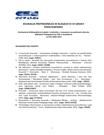 EDUKACJA PRZYRODNICZA W KLASACH IV-VI SZKOŁY PODSTAWOWEJ Zestawienie bibliograficzne książek i artykułów z czasopism na podstawie zbiorów Biblioteki Pedagogicznej CEN w Suwałkach za lata 2005-2015 WYDAWNICTWA ZWARTE: 1. E-nauczyciel przyrody : innowacyjna strategia nauczania i uczenia się przedmiotów przyrodniczych z wykorzystaniem multimediów / Anna Basińska [et al.]. - Poznań : UAM, 2013. (sygn. 55831) 2. GIS w szkole : poradnik dla nauczycieli przedmiotów przyrodniczych / [teksty Piotr Mikołajczyk, Monika Rusztecka, Elżbieta Wołoszyńska]. – Warszawa : Centrum EP/GRID, 2011. (sygn. 54187, 54188) 3. Jak odkrywać i rozwijać uzdolnienia przyrodnicze uczniów w szkole podstawowej, gimnazjum i szkole ponadgimnazjalnej / Urszula Grygier, Beata Jancarz-Łanczkowska, Krzysztof T. Piotrowski. - Wyd. 2. - Warszawa : Ośrodek Rozwoju Edukacji, 2013. (sygn. 56152, 55153) 4. Nauczanie przyrody : wybrane zagadnienia : praca zbiorowa / pod red. Ewy Arciszewskiej i Stanisława Dylaka ; [aut. Ewa Arciszewska i in.]. - Warszawa : Wydawnictwa Centralnego Ośrodka Doskonalenia Nauczycieli, 2005. (sygn. 50347) 5. Orlik, ptak jakich mało : scenariusze zajęć o biologii i ochronie orlika grubodziobego / [aut. Agnieszka Henel, Ewa Wiatr]. - [Goniądz] : Ptaki Polskie, 2010. (sygn. 55066,55067) 6. Przyroda : scenariusze lekcji terenowych dla klas IV-VI szkoły podstawowej / aut. tekstów i prezentacji multimedialnych Karolina Archacka [et al.] ; red. i korekta Ewa Kral i Ligia Tuszyńska. - Warszawa : Wydział Biologii Uniwersytetu Warszawskiego, 2010. (sygn. czyt. 37.016:5) 7. Rozważania o nauczaniu przyrody / Władysław Błasiak. - Kraków : Wydawnictwo Naukowe Uniwersytetu Pedagogicznego, 2011. (sygn. 54127,54128) 8. Technologie informacyjne w poznawaniu wiedzy matematyczno-przyrodniczej / pod red. Marii Kozielskiej. - Toruń : Wydawnictwo Adam Marszałek, 2010. (sygn. 53649) 1 ARTYKUŁY Z CZASOPISM: 9. Bocian biały – charakterystyczny ptak polskiej wsi : wspólny konspekt lekcji przyrody z rozbiciem na klasy IV, V i VI / Wojciech Jeszka // Biologia w Szkole. – 2012, nr 2, s.42-54 10. Co piszczy w trawie? : świat przyrody pod lupą : program edukacyjny w świetlicy / Natalia Brehmer // Świetlica w Szkole. - 2014, nr 2, s. 23-24 11. Co ukrywają meksykańskie jaskinie? / Katarzyna Nowosad // Świetlica w Szkole. 2014, nr 3, s. 5-6 12. Czy jesteśmy w puszczy? / Dominik Marszał // Biologia w Szkole. - 2007, nr 5, s. 31--34 13. Domy w różnych częściach świata : propozycja zajęć pozalekcyjnych dla uczniów szkół podstawowych / Bogna Piechura // Geografia w Szkole. – 2015, nr 1, s.33-35 14. Doświadczenia w nauczaniu przyrody / Urszula Grygier // Biologia w Szkole. - 2005, nr 2, s. 32-36 15. E-learning jako forma wspomagania kształcenia w zakresie przedmiotów przyrodniczych / Małgorzata Bartoszewicz // Nowa Szkoła. – 2014, nr 3, s. 32-38 16. Fizyka w przyrodzie / Władysław Błasiak // Biologia w Szkole. - 2005, nr 4, s. 25-28 17. Im dalej w las, tym więcej drzew – zajęcia terenowe dla kl. V szk. podst. / Katarzyna Kubaś // Biologia w Szkole. – 2014, nr 2, s.32-39 18. Jak ciekawie mówić o drzewach, aby uczniowie słuchali? / Łukasz Tyburski // Biologia w Szkole. - 2015, nr 4, s. 43-44 19. Jak lepiej aktywizować do uczenia się o przyrodzie? / Julian Piotr Sawiński // Fizyka w Szkole. - 2015, nr 3, s. 41-44 20. Jak lepiej uczyć przyrody? / Julian Piotr Sawiński // Geografia w Szkole. - 2013, nr 6, s. 34-35 21. Jak zainteresować uczniów zagadnieniami przyrodniczymi na zajęciach dodatkowych i nie tylko / Bogna Piechura // Geografia w Szkole. – 2014, nr 4, s.28-30 22. Krajobraz tundry : materiał do lekcji przyrody w klasie VI w ramach cyklu lekcji "Krajobrazy Świata" / Dominik Marszał // Biologia w Szkole. - 2007, nr 3, s. 36-43 23. Lekcje przyrody od nowa / Centrum Nauki Kopernik // Biologia w Szkole. – 2015, nr 5, s.41-43 24. Mądre zakupy, czyli nasz wkład w ochronę środowiska : praca wyróżniona w konkursie / Renata Dzierzkiewicz-Hermann // Biologia w Szkole. - 2005, nr 6, s. 39-42 25. Moje spotkania z przyrodą : zajęcia przyrodnicze w świetlicy / Agnieszka Radomyska // Świetlica w Szkole. - 2014, nr 3, s. 23-24 26. Nauczyciele o nauczaniu przyrody w szkole podstawowej / Mariola Tracz, Agnieszka Świętek // Geografia w Szkole. - 2012, nr 4, s. 15-19 27. Niepojęty świat zwierząt – dlaczego zwierzęta różnią się od siebie : scenariusz lekcji przyrody dla klas IV-VI / Kinga Prejbisz-Wala // Biologia w Szkole. – 2012, nr 1, s.38-42 28. Nowa podstawa programowa z przyrody : opinia o projekcie / Bożena Sienkiewicz // Geografia w Szkole. - 2005, nr 5, s. 28—31 29. Ochrona wód (2) :poznawanie przez działanie czyli wspieranie twórczej aktywności uczniów w samodzielnym działaniu / Elżbieta Tyralska-Wojtycza // Aura. – 2014, nr 3, Dodatek Ekologiczny dla Szkół, nr 234, s. 6-7 2 30. Ochrona wód (3) :poznawanie przez działanie czyli wspieranie twórczej aktywności uczniów w samodzielnym działaniu / Elżbieta Tyralska-Wojtycza // Aura. – 2014, nr 4, Dodatek Ekologiczny dla Szkół, nr 235 s. 6-7 31. Ochrona wód (4) :poznawanie przez działanie czyli wspieranie twórczej aktywności uczniów w samodzielnym działaniu / Elżbieta Tyralska-Wojtycza // Aura. – 2014, nr 5, Dodatek Ekologiczny dla Szkół, nr 236, s. 7-8 32. Ochrona wód (5) :poznawanie przez działanie czyli wspieranie twórczej aktywności uczniów w samodzielnym działaniu / Elżbieta Tyralska-Wojtycza // Aura. – 2014, nr 6, Dodatek Ekologiczny dla Szkół, nr 237, s. 6-7 33. Ochrona wód (6) :poznawanie przez działanie czyli wspieranie twórczej aktywności uczniów w samodzielnym działaniu / Elżbieta Tyralska-Wojtycza // Aura. – 2014, nr 7, Dodatek Ekologiczny dla Szkół, nr 238, s. 4-6 34. Okolica jako ojczyzna : mała ojczyzna - miejsce magiczne : scenariusz terenowej lekcji przyrody / Wojciech Jeszka // Biologia w Szkole. - 2007, nr