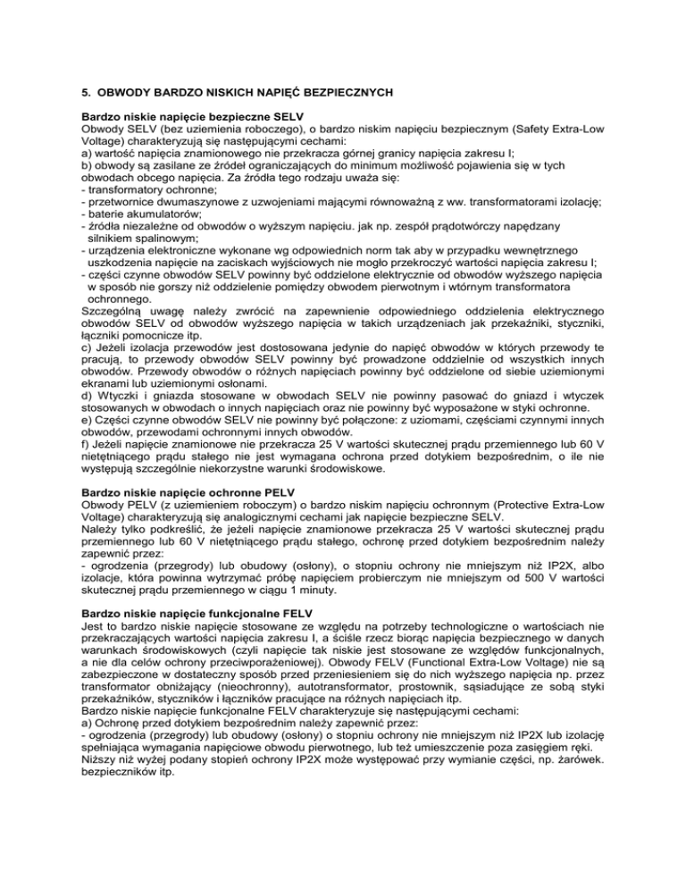 5. OBWODY BARDZO NISKICH NAPIĘĆ BEZPIECZNYCH Bardzo niskie napięcie bezpieczne SELV Obwody SELV (bez uziemienia roboczego), o bardzo niskim napięciu bezpiecznym (Safety Extra-Low Voltage) charakteryzują się następującymi cechami: a) wartość napięcia znamionowego nie przekracza górnej granicy napięcia zakresu I; b) obwody są zasilane ze źródeł ograniczających do minimum możliwość pojawienia się w tych obwodach obcego napięcia. Za źródła tego rodzaju uważa się: - transformatory ochronne; - przetwornice dwumaszynowe z uzwojeniami mającymi równoważną z ww. transformatorami izolację; - baterie akumulatorów; - źródła niezależne od obwodów o wyższym napięciu. jak np. zespół prądotwórczy napędzany silnikiem spalinowym; - urządzenia elektroniczne wykonane wg odpowiednich norm tak aby w przypadku wewnętrznego uszkodzenia napięcie na zaciskach wyjściowych nie mogło przekroczyć wartości napięcia zakresu I; - części czynne obwodów SELV powinny być oddzielone elektrycznie od obwodów wyższego napięcia w sposób nie gorszy niż oddzielenie pomiędzy obwodem pierwotnym i wtórnym transformatora ochronnego. Szczególną uwagę należy zwrócić na zapewnienie odpowiedniego oddzielenia elektrycznego obwodów SELV od obwodów wyższego napięcia w takich urządzeniach jak przekaźniki, styczniki, łączniki pomocnicze itp. c) Jeżeli izolacja przewodów jest dostosowana jedynie do napięć obwodów w których przewody te pracują, to przewody obwodów SELV powinny być prowadzone oddzielnie od wszystkich innych obwodów. Przewody obwodów o różnych napięciach powinny być oddzielone od siebie uziemionymi ekranami lub uziemionymi osłonami. d) Wtyczki i gniazda stosowane w obwodach SELV nie powinny pasować do gniazd i wtyczek stosowanych w obwodach o innych napięciach oraz nie powinny być wyposażone w styki ochronne. e) Części czynne obwodów SELV nie powinny być połączone: z uziomami, częściami czynnymi innych obwodów, przewodami ochronnymi innych obwodów. f) Jeżeli napięcie znamionowe nie przekracza 25 V wartości skutecznej prądu przemiennego lub 60 V nietętniącego prądu stałego nie jest wymagana ochrona przed dotykiem bezpośrednim, o ile nie występują szczególnie niekorzystne warunki środowiskowe. Bardzo niskie napięcie ochronne PELV Obwody PELV (z uziemieniem roboczym) o bardzo niskim napięciu ochronnym (Protective Extra-Low Voltage) charakteryzują się analogicznymi cechami jak napięcie bezpieczne SELV. Należy tylko podkreślić, że jeżeli napięcie znamionowe przekracza 25 V wartości skutecznej prądu przemiennego lub 60 V nietętniącego prądu stałego, ochronę przed dotykiem bezpośrednim należy zapewnić przez: - ogrodzenia (przegrody) lub obudowy (osłony), o stopniu ochrony nie mniejszym niż IP2X, albo izolacje, która powinna wytrzymać próbę napięciem probierczym nie mniejszym od 500 V wartości skutecznej prądu przemiennego w ciągu 1 minuty. Bardzo niskie napięcie funkcjonalne FELV Jest to bardzo niskie napięcie stosowane ze względu na potrzeby technologiczne o wartościach nie przekraczających wartości napięcia zakresu I, a ściśle rzecz biorąc napięcia bezpiecznego w danych warunkach środowiskowych (czyli napięcie tak niskie jest stosowane ze względów funkcjonalnych, a nie dla celów ochrony przeciwporażeniowej). Obwody FELV (Functional Extra-Low Voltage) nie są zabezpieczone w dostateczny sposób przed przeniesieniem się do nich wyższego napięcia np. przez transformator obniżający (nieochronny), autotransformator, prostownik, sąsiadujące ze sobą styki przekaźników, styczników i łączników pracujące na różnych napięciach itp. Bardzo niskie napięcie funkcjonalne FELV charakteryzuje się następującymi cechami: a) Ochronę przed dotykiem bezpośrednim należy zapewnić przez: - ogrodzenia (przegrody) lub obudowy (osłony) o stopniu ochrony nie mniejszym niż IP2X lub izolację spełniająca wymagania napięciowe obwodu pierwotnego, lub też umieszczenie poza zasięgiem ręki. Niższy niż wyżej podany stopień ochrony IP2X może występować przy wymianie części, np. żarówek. bezpieczników itp. Jeżeli izolacja urządzenia wchodzącego w skład obwodu FELV nie wytrzymuje próby napięciowej wymaganej dla obwodu pierwotnego, to należy ją wzmocnić podczas montażu (instalowania) tak, aby mogła wytrzymać próbę: - napięciem probierczym 1500 V wartości skutecznej prądu przemiennego w ciągu 1 minuty, - napięciem o innej wartości zgodnie z normami - jeśli wymaga tego koordynacja izolacji. b) Ochronę przed dotykiem pośrednim należy zapewnić przez: - połączenie części przewodzących dostępnych urządzeń obwodu FELV z przewodem ochronnym obwodu pierwotnego. Chodzi tu o obwody pierwotne pracujące w układach sieciowych TN, TT i IT, lub: - połączenie części przewodzących dostępnych urządzeń obwodu FELV z nieuziemionym przewodem polaczenia wyrównawczego obwodu pierwotnego, jeżeli ochrona przed dotykiem pośrednim tego obwodu pierwotnego jest wykonana przez zastosowanie separacji elektrycznej. c) Wtyczki gniazda stosowane w obwodach FELV nie powinny pasować do gniazd i wtyczek stosowanych w obwodach o innych napięciach. Tabela 7. Zakresy napięć Schemat podziału wyżej wymienionych napięć jest następujący: a) napięcia zakresu I: - bardzo niskie napięcie SELV; - bardzo niskie napięcie PELV; - bardzo niskie napięcie funkcjonalne FELV. b) napięcia zakresu II: - napięcie w układzie sieci TN; - napięcie w układzie sieci TT; - napięcie w układzie sieci IT; - napięcie separowane. Rys. 5. Obwody zasilane bardzo niskim napięciem: SELV, PELV, FELV