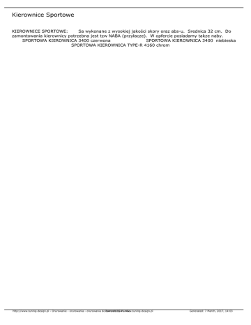 Kierownice Sportowe KIEROWNICE SPORTOWE: Sa wykonane z wysokiej jakości skory oraz abs-u. Srednica 32 cm. Do zamontowania kierownicy potrzebna jest tzw NABA (przyłacze). W opfercie posiadamy takze naby. SPORTOWA KIEROWNICA 3400 czerwona SPORTOWA KIEROWNICA 3400 niebieska SPORTOWA KIEROWNICA TYPE-R 4160 chrom http://www.tuning-design.pl - Orurowanie - orurowania - orurowania do Powered samochodów by Mambo - www.tuning-design.pl Generated: 7 March, 2017, 14:03