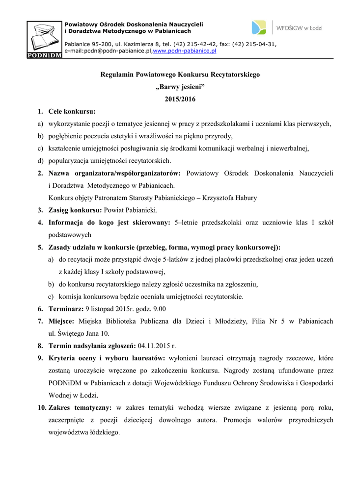 Powiatowy Ośrodek Doskonalenia Nauczycieli i Doradztwa Metodycznego w Pabianicach Pabianice 95-200, ul. Kazimierza 8, tel. (42) 215-42-42, fax: (42) 215-04-31, e-mail:[email protected],www.podn-pabianice.pl Regulamin Powiatowego Konkursu Recytatorskiego „Barwy jesieni” 2015/2016 1. Cele konkursu: a) wykorzystanie poezji o tematyce jesiennej w pracy z przedszkolakami i uczniami klas pierwszych, b) pogłębienie poczucia estetyki i wrażliwości na piękno przyrody, c) kształcenie umiejętności posługiwania się środkami komunikacji werbalnej i niewerbalnej, d) popularyzacja umiejętności recytatorskich. 2. Nazwa organizatora/współorganizatorów: Powiatowy Ośrodek Doskonalenia Nauczycieli i Doradztwa Metodycznego w Pabianicach. Konkurs objęty Patronatem Starosty Pabianickiego – Krzysztofa Habury 3. Zasięg konkursu: Powiat Pabianicki. 4. Informacja do kogo jest skierowany: 5–letnie przedszkolaki oraz uczniowie klas I szkół podstawowych 5. Zasady udziału w konkursie (przebieg, forma, wymogi pracy konkursowej): a) do recytacji może przystąpić dwoje 5-latków z jednej placówki przedszkolnej oraz jeden uczeń z każdej klasy I szkoły podstawowej, b) do konkursu recytatorskiego należy zgłosić uczestnika na zgłoszeniu, c) komisja konkursowa będzie oceniała umiejętności recytatorskie. 6. Terminarz: 9 listopad 2015r. godz. 9.00 7. Miejsce: Miejska Biblioteka Publiczna dla Dzieci i Młodzieży, Filia Nr 5 w Pabianicach ul. Świętego Jana 10. 8. Termin nadsyłania zgłoszeń: 04.11.2015 r. 9. Kryteria oceny i wyboru laureatów: wyłonieni laureaci otrzymają nagrody rzeczowe, które zostaną uroczyście wręczone po zakończeniu konkursu. Nagrody zostaną ufundowane przez PODNiDM w Pabianicach z dotacji Wojewódzkiego Funduszu Ochrony Środowiska i Gospodarki Wodnej w Łodzi. 10. Zakres tematyczny: w zakres tematyki wchodzą wiersze związane z jesienną porą roku, zaczerpnięte z poezji dziecięcej dowolnego autora. Promocja walorów przyrodniczych województwa łódzkiego. Powiatowy Ośrodek Doskonalenia Nauczycieli i Doradztwa Metodycznego w Pabianicach Pabianice 95-200, ul. Kazimierza 8, tel. (42) 215-42-42, fax: (42) 215-04-31, e-mail:[email protected],www.podn-pabianice.pl 11. Osoby odpowiedzialne za przeprowadzenie konkursu: Aldona Biegańska, doradca metodyczny edukacji wczesnoszkolnej Małgorzata Gmosińska, doradca metodyczny wychowania przedszkolnego Mariola Jóźwik, doradca metodyczny wychowania przedszkolnego Halina Grochowalska, kierownik Miejskiej Biblioteki Publicznej dla Dzieci i Młodzieży, Filia Nr 5 w Pabianicach