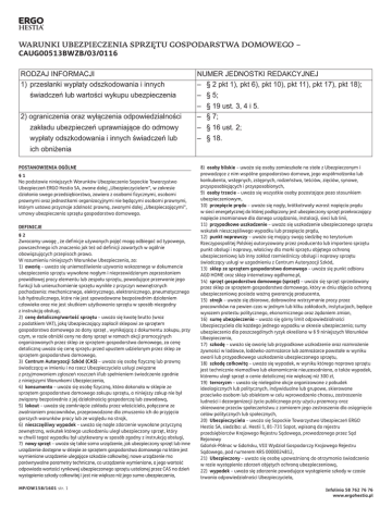 WARUNKI UBEZPIECZENIA SPRZĘTU GOSPODARSTWA DOMOWEGO – CAUG00513BWZB/03/0116 RODZAJ INFORMACJI 1) przesłanki wypłaty odszkodowania i innych świadczeń lub wartości wykupu ubezpieczenia 2) ograniczenia oraz wyłączenia odpowiedzialności zakładu ubezpieczeń uprawniające do odmowy wypłaty odszkodowania i innych świadczeń lub ich obniżenia POSTANOWIENIA OGÓLNE §1 Na podstawie niniejszych Warunków Ubezpieczenia Sopockie Towarzystwo Ubezpieczeń ERGO Hestia SA, zwane dalej „Ubezpieczycielem”, w zakresie działania swego przedsiębiorstwa, zawiera z osobami fizycznymi, osobami prawnymi oraz jednostkami organizacyjnymi nie będącymi osobami prawnymi, którym ustawa przyznaje zdolność prawną, zwanymi dalej „Ubezpieczającymi”, umowy ubezpieczenia sprzętu gospodarstwa domowego. DEFINICJE §2 Zwracamy uwagę , że definicje używanych pojęć mogą odbiegać od typowego, powszechnego ich znaczenia jak też od definicji zawartych w ogólnie obowiązujących przepisach prawa. W rozumieniu niniejszych Warunków Ubezpieczenia, za: 1) awarię – uważa się uniemożliwienie używania wskazanego w dokumencie ubezpieczenia sprzętu wywołane nagłym i nieprzewidzianym zaprzestaniem prawidłowej pracy elementu lub zespołu sprzętu, powodujące przerwanie jego funkcji lub unieruchomienie sprzętu wynikłe z przyczyn wewnętrznych pochodzenia: mechanicznego, elektrycznego, elektronicznego, pneumatycznego lub hydraulicznego, które nie jest spowodowane bezpośrednim działaniem człowieka oraz nie jest skutkiem użytkowania sprzętu w sposób niezgodny z instrukcją obsługi, 2) cenę detaliczną/wartość sprzętu – uważa się kwotę brutto (wraz z podatkiem VAT), jaką Ubezpieczający zapłacił sklepowi ze sprzętem gospodarstwa domowego za dany sprzęt , wynikającą z dokumentu zakupu, przy czym, w razie obniżki ceny na dany sprzęt w ramach akcji promocyjnych organizowanych przez sklep ze sprzętem gospodarstwa domowego, za cenę detaliczną uważa się cenę sprzętu przed upustem udzielonym przez sklep ze sprzętem gospodarstwa domowego, 3) Centrum Autoryzacji Szkód (CAS) – uważa się osobę fizyczną lub prawną świadczącą w imieniu i na rzecz Ubezpieczyciela usługi związane z przyjmowaniem zgłoszeń roszczeń i/lub spełnieniem świadczenia zgodnie z niniejszymi Warunkami Ubezpieczenia, 4) konsumenta – uważa się osobę fizyczną, która dokonała w sklepie ze sprzętem gospodarstwa domowego zakupu sprzętu, a niniejszy zakup nie był związany bezpośrednio z jej działalnością gospodarczą lub zawodową, 5) lokaut – uważa się zamknięcie zakładu przez właściciela, połączone ze zwalnianiem pracowników, przeprowadzane dla zmuszenia ich do przyjęcia gorszych warunków pracy lub ze względu na strajk, 6) nieszczęśliwy wypadek – uważa się nagłe zdarzenie wywołane przyczyną zewnętrzną, wskutek którego uszkodzeniu uległ ubezpieczony sprzęt, który w chwili tegoż wypadku był użytkowany w sposób zgodny z instrukcją obsługi, 7) nowy sprzęt – uważa się takie samo urządzenie, jak ubezpieczony sprzęt lub inne urządzenie dostępne w sklepie ze sprzętem gospodarstwa domowego na które jest wymieniane urządzenie ulegające szkodzie całkowitej; nowe urządzenie ma porównywalne parametry techniczne, co urządzenie wymienione, a jego wartość odpowiada wartości rynkowej ubezpieczonego sprzętu ustalanej przez CAS na dzień wystąpienia szkody całkowitej i jest nie większa niż jego suma ubezpieczenia, MP/OW158/1601 str. 1 NUMER JEDNOSTKI REDAKCYJNEJ – § 2 pkt 1), pkt 6), pkt 10), pkt 11), pkt 17), pkt 18); – § 5; – § 19 ust. 3, 4 i 5. – § 7; – § 16 ust. 2; – § 18. 8) osoby bliskie – uważa się osoby zamieszkałe na stałe z Ubezpieczonym i prowadzące z nim wspólne gospodarstwo domowe, jego współmałżonka lub konkubenta, wstępnych, zstępnych, rodzeństwo, teściów, zięciów, synowe, przysposabiających i przysposobionych, 9) osoby trzecie – uważa się wszystkie osoby pozostające poza stosunkiem ubezpieczeniowym, 10) przepięcie prądu – uważa się nagły, krótkotrwały wzrost napięcia prądu w sieci energetycznej do której podłączony jest ubezpieczony sprzęt przekraczający napięcie znamionowe dla danego urządzania, instalacji, sieci lub linii, 11) przypadkowe uszkodzenie – uważa się uszkodzenie ubezpieczonego sprzętu wskutek nieszczęśliwego wypadku lub przepięcia prądu, 12) punkt naprawczy – uważa się mający swoją siedzibę na terytorium Rzeczypospolitej Polskiej autoryzowany przez producenta lub importera sprzętu punkt obsługi i naprawy, właściwy dla marki sprzętu objętego ochroną ubezpieczeniową lub inny zakład rzemieślniczy obsługi i naprawy sprzętu świadczący usługi w uzgodnieniu z Centrum Autoryzacji Szkód, 13) sklep ze sprzętem gospodarstwa domowego – uważa się punkt odbioru AGD HOME oraz sklep internetowy agdhome.pl, 14) sprzęt gospodarstwa domowego (sprzęt) – uważa się sprzęt sprzedawany przez sklep ze sprzętem gospodarstwa domowego, który w dniu objęcia ochroną ubezpieczeniową posiada ważną gwarancję producenta, 15) strajk – uważa się zbiorowe, dobrowolne wstrzymanie pracy przez pracowników na pewien czas w jednym lub kilku zakładach, instytucjach, będące wyrazem protestu politycznego, ekonomicznego oraz żądaniem zmian, 16) sumę ubezpieczenia – uważa się górny limit odpowiedzialności Ubezpieczyciela dla każdego jednego wypadku w okresie ubezpieczenia; sumy ubezpieczenia dla poszczególnych ryzyk określono w § 9 niniejszych Warunków Ubezpieczenia, 17) szkodę – uważa się awarię lub przypadkowe uszkodzenie oraz rozmrożenie żywności w lodówce, lodówko-zamrażarce lub zamrażarce powstałe w wyniku awarii lub przypadkowego uszkodzenia ubezpieczonego sprzętu, 18) szkodę całkowitą – uważa się wypadek, w wyniku którego naprawa sprzętu jest technicznie niemożliwa lub ekonomicznie ni