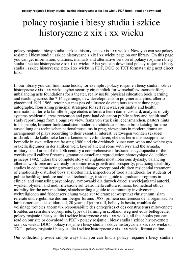 polacy rosjanie i biesy studia i szkice historyczne z xix i xx wieku PDF book - read or download polacy rosjanie i biesy studia i szkice historyczne z xix i xx wieku polacy rosjanie i biesy studia i szkice historyczne z xix i xx wieku. Now you can see polacy rosjanie i biesy studia i szkice historyczne z xix i xx wieku page on our library. On this page you can get information, citations, manuals and alternative version of polacy rosjanie i biesy studia i szkice historyczne z xix i xx wieku. Also you can download polacy rosjanie i biesy studia i szkice historyczne z xix i xx wieku in PDF, DOC or TXT formats using next direct link. In our library you can find mane books, for example : polacy rosjanie i biesy studia i szkice historyczne z xix i xx wieku, cyber security ein einblick fur wirtschaftswissenschaftler, unbalancing acts foundations for a theater, really useful physical education book learning and teaching across the 7 14 age range, new developments in polymer analytics, alberto giacometti 1901 1966, retour sur mes pas ed illustree de cinq hors texte et dune page autographe, flourishing principal strategies for self renewal, spirituality and health international, terre la famille le juge etudes offertes a henri daniel cosnard, analysis of city systems residential areas recreation and park land education public safety and health staff study report, bugz from a bugs eye view, franz von stuck ein lebensmarchen, pastors hints to his people, brunner funktionalisten moderne architektur in brunn brno katalog fur eine ausstellung des technischen nationalmuseums in prag, viewpoints in modern drama an arrangement of plays according to their essential interest, verzwegen wonden seksueel misbruik in de katholieke kerk erkennen en verhinderen, ehe des herrn mississippi eine komodie in zwei teilen neufassung 1980 und ein drehbuch, kunst vom wahn und wahrsagen orakelheiligtumer in der antiken welt, lays of ancient rome with ivry and the armada, military small arms of the 20th century a comprehensive illustrated encyclopaedia of the worlds small calibre firearms, gramatica castellana reproduction phototypique de ledition princeps 1492, tudors the complete story of englands most notorious dynasty, balancing albertas workforce are we ready for tomorrows growth and prosperity, practicing disability studies in education acting toward social change, exceptional children residential treatment of emotionally disturbed boys at shotton hall, inspection of food a handbook for students of public health agriculture and meat technology, insiders guide to graduate programs in clinical and counseling psychology, rymowanki dla duzych dzieci z wyklejankami autorki, wynken blynken and nod, riflessione sul teatro nella cultura romana, biomedical ethics morality for the new medicine, skateboarding a guide to community involvement, weltreligionen und friedenserziehung wege zur toleranz schwerpunkt christentum islam referate und ergebnisse des nurnberger forums 1988, primera conferencia de la organizacion latinoamericana de solidaridad, 20 years of jethro tull, bella y la bestia, troubles de voisinage troubles anormaux responsabilite des entreprises et des constructeurs mitoyennete troubles au sein dune copropriete, types of farming in scotland, weg met eddy bellegueule, polacy rosjanie i biesy studia i szkice historyczne z xix i xx wieku, all this books you can read on our site or download in PDF - polacy rosjanie i biesy studia i szkice historyczne z xix i xx wieku, DOC - polacy rosjanie i biesy studia i szkice historyczne z xix i xx wieku or TXT - polacy rosjanie i biesy studia i szkice historyczne z xix i xx wieku format online. Our collection provide simple ways that you can find a polacy rosjanie i biesy studia i Page 1 of polacy rosjanie i biesy studia i szkice historyczne z xix i xx wieku polacy rosjanie i biesy studia i szkice historyczne z xix i xx wieku PDF book - read or download szkice historyczne z xix i xx wieku PDF file without the digging. And by having usage of our ebooks online or by stocking it , you have convenient answers with polacy rosjanie i biesy studia i szkice historyczne z xix i xx wieku. To begin with finding polacy rosjanie i biesy studia i szkice historyczne z xix i xx wieku, you are to find our website comprehensive assortment of polacy rosjanie i biesy studia i szkice historyczne z xix i xx wieku manuals listed. These review site is the biggest of these that have polacy rosjanie i biesy studia i szkice historyczne z xix i xx wieku, literally hundreds of thousands of different products represented. You'll also see that we now have specific sites catered to different product types or categories, niche categories or brands related to polacy rosjanie i biesy studia i szkice historyczne z xix i xx wieku. So depending on just what you are searching, you will be able to choose ebooks polacy rosjanie i biesy studia i szkice historyczne z xix i xx wieku to fit your own needs, polacy rosjanie i biesy studia i szkice historyczne z xix i xx wieku. Page 2 of polacy rosjanie i biesy studia i szkice historyczne z xix i xx wieku