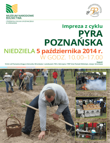 Impreza z cyklu XIII JARMARK ZAPROSZENIE NA XIII PYRA XIIIJARMARK JARMARK WIELKANOCNY WIELKANOCNY WIELKANOCNY POZNAŃSKA SOBOTA I NIEDZIELA 12–13 KWIETNIA 2014 r. W GODZ. 1000 –1700 SOBOTA I NIEDZIELA 12–13 KWIETNIA 2014 r. niedziela 5 października W GODZ.2014 10 –17 r. W GODZ. 10.00–17.00 00 00 Dojazd: 16 km od Poznania drogą w kierunku Wrocławia / autobusem 703 z Górczyna / PKP linia Poznań-Wolsztyn, stacja: Szreniawa ie_50.indd 1 2014-03-24 13:08:45 Ludowa malowanka wielkanocna - proj. graf. Kazimierz Mann Patronat medialny: Ludowa malowanka wielkanocna - proj. graf. Kazimierz Mann ulotka_projekty.indd 1 www.muzeum-szreniawa.pl 2014-03-25 09:22:10 PROGRAM IMPREZY • ręczny zbiór ziemniaków z pola • degustacja pyrek z gzikiem z parownika • występzespołufolklorystycznego„Wielkopolanie” • prezentacja transportu ziemniaków w zaprzęgu konnym i wolim • konkurs na najlepszego bambrzoka • ozdobićmazurkiibabeczki interaktywne • stanowiska muzealne, w tym: miary i wagi, laboratorium wykonaćwielkanocnekartkiświąteczne ziemniaczane•itp. • liczne stanowiska dla dzieci z konkursami, w tym wykonywanie kopytek oraz cukierków marcepanowych z ziemniaka • występy artystyczne Występy • Przedstawieniedladzieciotematycewielkanocnej •artystyczne wystawa maszyn rolniczych do zbioru ziemniaków wwykonaniugrupy„DobryTeatr” nascenie • pokaz kopca ziemniaczanego • koncertduetuwokalno-instrumentalnego„BlueVoice” Muzealne Nastanowiskachbędziemożnasamodzielnie: • stanowiska tradycyjny wypiek chleba • ozdobićpisankiróżnymitechnikami interaktywne • stanowisko wycinania figur z dyni • wykonaćpalemkiistroikiwielkanocne Otwarcie wystawy czasowej Wystawapt.„PROWINCJAWCENTRUM.Wielkopolskawieś naszklanychnegatywachzezbiorówFundacjiTRES Dodatkowe atrakcje: zeZbąszynia”,pawilon8,godz.1100 Inne atrakcje • –Pokazpieczeniachlebaiwędzeniakiełbas • niespodzianka występ znanej gwiazdy przygotowaneprzez • Pokazwiosennychpracpolowychimaszyn Muzeum napolumuzealnym • Pokazpractwórcówludowychpołączonyzmożliwością zakupuichwyrobu • Pokazgotowaniaorazdegustacjażurku • Licznestanowiskagastronomiczneihandlowe SERDECZNIE ZAPRASZAMY SERDECZNIE ZAPRASZAMY Patronathonorowy: medialny: Patronat Patronat medialny: Partner: