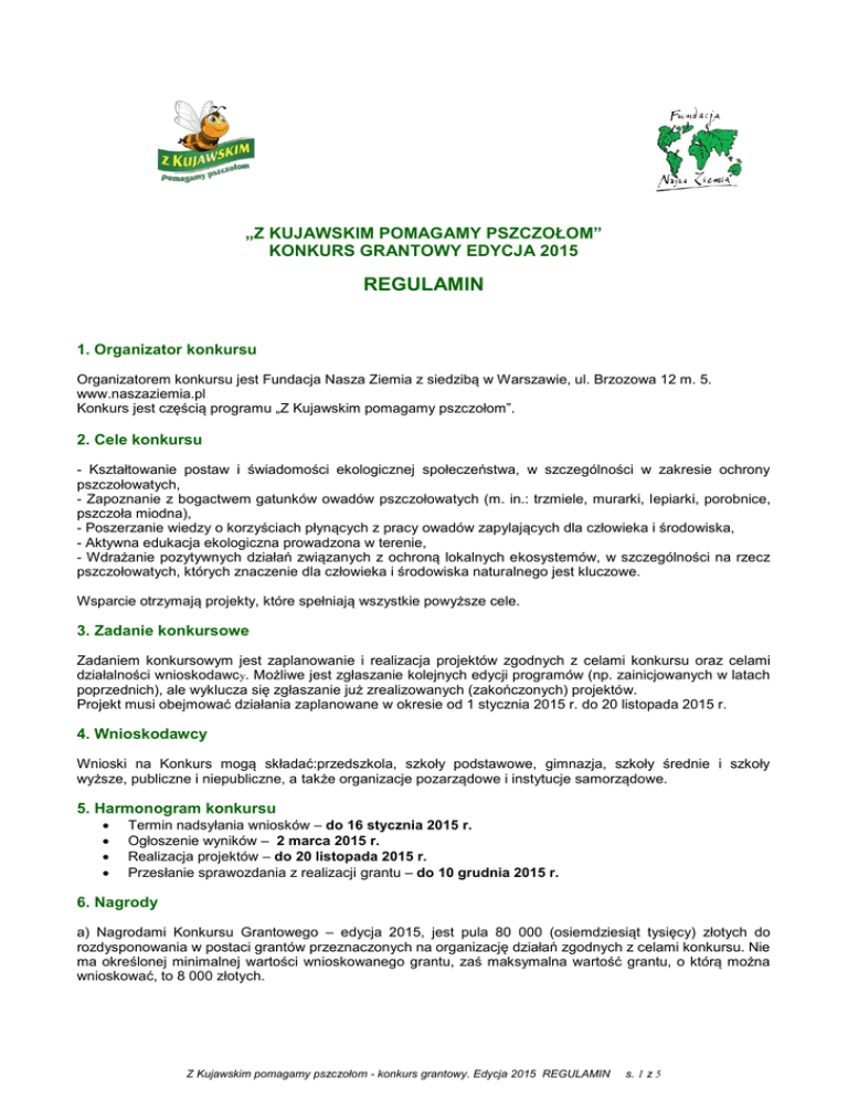 „Z KUJAWSKIM POMAGAMY PSZCZOŁOM” KONKURS GRANTOWY EDYCJA 2015 REGULAMIN 1. Organizator konkursu Organizatorem konkursu jest Fundacja Nasza Ziemia z siedzibą w Warszawie, ul. Brzozowa 12 m. 5. www.naszaziemia.pl Konkurs jest częścią programu „Z Kujawskim pomagamy pszczołom”. 2. Cele konkursu - Kształtowanie postaw i świadomości ekologicznej społeczeństwa, w szczególności w zakresie ochrony pszczołowatych, - Zapoznanie z bogactwem gatunków owadów pszczołowatych (m. in.: trzmiele, murarki, lepiarki, porobnice, pszczoła miodna), - Poszerzanie wiedzy o korzyściach płynących z pracy owadów zapylających dla człowieka i środowiska, - Aktywna edukacja ekologiczna prowadzona w terenie, - Wdrażanie pozytywnych działań związanych z ochroną lokalnych ekosystemów, w szczególności na rzecz pszczołowatych, których znaczenie dla człowieka i środowiska naturalnego jest kluczowe. Wsparcie otrzymają projekty, które spełniają wszystkie powyższe cele. 3. Zadanie konkursowe Zadaniem konkursowym jest zaplanowanie i realizacja projektów zgodnych z celami konkursu oraz celami działalności wnioskodawc y. Możliwe jest zgłaszanie kolejnych edycji programów (np. zainicjowanych w latach poprzednich), ale wyklucza się zgłaszanie już zrealizowanych (zakończonych) projektów. Projekt musi obejmować działania zaplanowane w okresie od 1 stycznia 2015 r. do 20 listopada 2015 r. 4. Wnioskodawcy Wnioski na Konkurs mogą składać:przedszkola, szkoły podstawowe, gimnazja, szkoły średnie i szkoły wyższe, publiczne i niepubliczne, a także organizacje pozarządowe i instytucje samorządowe. 5. Harmonogram konkursu Termin nadsyłania wniosków – do 16 stycznia 2015 r. Ogłoszenie wyników – 2 marca 2015 r. Realizacja projektów – do 20 listopada 2015 r. Przesłanie sprawozdania z realizacji grantu – do 10 grudnia 2015 r. 6. Nagrody a) Nagrodami Konkursu Grantowego – edycja 2015, jest pula 80 000 (osiemdziesiąt tysięcy) złotych do rozdysponowania w postaci grantów przeznaczonych na organizację działań zgodnych z celami konkursu. Nie ma określonej minimalnej wartości wnioskowanego grantu, zaś maksymalna wartość grantu, o którą można wnioskować, to 8 000 złotych. Z Kujawskim pomagamy pszczołom - konkurs grantowy. Edycja 2015 REGULAMIN s. 1 z 5 b) Nagrody-granty będzie można wykorzystać zgodnie z budżetem i harmonogramem działań ustalonym we wniosku. Na wszelkie zmiany, jakie wnioskodawca chciałby poczynić w przyjętym harmonogramie działań lub w harmonogramie budżetowym, należy uzyskać najpierw pisemną akceptację Organizatora. c) Grant można przeznaczyć na dofinansowanie działań (kosztów) realizowanych (ponoszonych) nie wcześniej niż 2 marca 2015 r. i nie później niż do 20 listopada 2015 r. d) Nie ma obowiązku wnoszenia finansowego wkładu własnego. e) Fundatorem grantów jest firma Zakłady Tłuszczowe „Kruszwica” S.A. z siedzibą w Kruszwicy, producent Oleju Kujawskiego. 7. Koszty kwalifikowane Z grantu można pokryć realne, uzasadnione w opisie projektu koszty. Koszty finansowane w ograniczonym zakresie: a) wynagrodzenia na koordynację i księgowość mogą stanowić maksymalnie 20% wartości wnioskowanej kwoty grantu. Wynagrodzenia eksperckie (np. prowadzenie warsztatów terenowych, zajęć, prelekcji, itp.) nie są objęte tym ograniczeniem, b) wartość zakupionego sprzętu przeznaczonego do obsługi wnioskowanego projektu, takiego jak: laptopy, rzutniki, projektory, telewizory, ekrany, aparaty fotograficzne, kamery, urządzenia nagrywające i odtwarzające dźwięk, nie może sumarycznie przekroczyć 30% wartości wnioskowanej kwoty grantu. Możliwy jest zakup środków i materiałów dydaktycznych (takich jak: mikroskopy, zestawy badawcze, odczynniki, tablice edukacyjne, itp.) bez ograniczeń. Koszty, które nie będą finansowane: a) koszty niezwiązane bezpośrednio z projektem, b) gadżety promocyjne, c) zakup budynków, lokali, gruntów, d) koszty utrzymania biura wnioskodawcy, e) działalność gospodarcza wnioskodawcy, f) działalność polityczna i religijna, g) kary, grzywny, mandaty. 8. Zgłoszenie do konkursu - wnioskowanie o dotację a) Wnioski należy składać w oparciu o formularz obejmujący część informacyjną o wnioskodawcy, opis programu, harmonogram działań i budżet. b) Wzór formularza dostępny jest w biurze Organizatora oraz na stronie www.pomagamypszczolom.pl c) Kompletne wnioski (wypełniony formularz i wymagane załączniki) należy w formie papierowej przesłać pocztą tradycyjną na adres: Fundacja Nasza Ziemia ul. Hoża 3 m.5 00-528 Warszawa z dopiskiem „Z Kujawskim pomagamy pszczołom – konkurs grantowy” d) O przyjęciu wniosku decyduje data stempla pocztowego. Nie będą przyjmowane wnioski wysłane faksem. Wnioski należy składać w jednym egzemplarzu. e) Jako załączniki należy rozumieć: 2 rekomendacje: dotyczące działalności wnioskodawcy lub projektu. Rekomendacje mogą wystawić podmioty, instytucje, które współpracowały z wnioskodawcą, np. gmina, nadleśnictwo, organizacja pozarządowa, placówka oświatowa, potwierdzenie źródeł finansowania własnego (wkładu własnego), o ile planowane są dodatkowe źródła finansowania projektu (patrz pkt. 6.d.), zgody i pozwolenia niezbędne do realizacji inwestycji, o ile projekt zakłada takie działania (np. w przypadku zakładania ogrodu – zgoda właściciela terenu na założenie ogrodu, itp.), Z Kujawskim pomagamy pszczołom - konkurs grantowy. Edycja 2015 REGULAMIN s. 2 z 5 szczegółowy plan zagospodarowania terenu pod inwestycję, o ile projekt ją zakłada (np. plan zagospodarowania ogrodu, klombu, plan ścieżki dydaktycznej, umiejscowienie tablic dydaktycznych, itp.), potwierdzenia od partnerów o nawiązaniu współpracy z zaznaczeniem, w jaki sposób i na jakim etapie partner zostanie zaangażowany w projekt, o ile jest to planowane. f) Jeśli w projekcie zaplanowano inwestycję (np