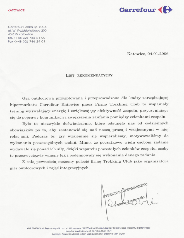Carrefour KATOWICE ~& Carrefaur Polska Sp. z 0.0. al. W. Rozdzienskiego 200 40-315 Katowice Tel. (+4832) 78621 00 Fax (+48 32) 78624 Ol Katowice, LIST REKOMENDACYJNY Gra outdoorowa przygotowana hipermarketu Carrefour trening wyzwalajacy 04.01.2006 Katowice i przeprowadzona przez Firme energie i zwiekszajacy dla kadry zarzadzajacej Trekking Club to wspanialy efektywnosc zespolu, przyczyniajacy sie do poprawy komunikacji i zwiekszenia zaufania pomiedzy czlonkami zespolu. Bylo to niezwykle doswiadczenie, obowiazków po to, aby zastanowic relacjami. Podczas wykonania poszczególnych które odsunelo nas od codziennych sie nad nasza praca i wzajemnymi tej gry wzajemnie sie wspieralismy, w nIeJ motywowalismy do zadan. Mimo, ze poczatkowo wielu osobom zadanie wydawalo sie ponad ich sily, dzieki wsparciu pozostalych czlonków zespolu, osoby te przezwyciezyly wlasny lek i podejmowaly sie wykonania Z cala pewnoscia mozemy polecic firme Trekking danego zadania. Club jako organizatora gier outdoorowych i zajec integracyjnych. '. KRS50850 Sad Rejonowy dla m. st. Warszawy, XXWydzial Gospodarczy Krajowego Kapital zakladowy: 3 197 806 000 PLN Zarzad: Alain Souiliard, Albin Jacquemont, Etienne van Dyck Rejestru Sadowego