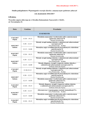 Data aktualizacji: 14.02.2017 r. Studia podyplomowe Wspomaganie rozwoju dziecka z autystycznym spektrum zaburzeń rok akademicki 2016/2017 UWAGA: Wszystkie zajęcia odbywają się w Ośrodku Doskonalenia Nauczycieli w CKZiU, ul. Nowomiejska 25. Data Godzina Przedmiot II SEMESTR 17.02.2017 Piątek 15.30 – 19.15 8.30 – 12.15 18.02.2017 Sobota 12.15 – 16.00 03.03.2017 Piątek 15.30 – 19.15 8.30 – 12.15 04.03.2017 Sobota 12.15 – 16.00 17.03.2017 Piątek 15.30-19.15 8.30 – 12.15 18.03.2017 Sobota 12.15 – 16.00 31.03.2017 Piątek 15.30 – 19.15 8.30 – 12.15 01.04.2017 Sobota 21.04.2017 Piątek 12.15 – 16.00 15.30 – 19.15 Metodyka nauczania i wychowania osób z autystycznym spektrum zaburzeń W Dorota Grzybowska Metody terapii małego dziecka z całościowymi zaburzeniami rozwojowymi W Ewa Piotrowska – Kołata Metodyka zajęć rewalidacyjnych prowadzonych z dzieckiem autystycznym W Dorota Grzybowska Metodyka nauczania i wychowania osób z autystycznym spektrum zaburzeń W Dorota Grzybowska Metody terapii małego dziecka z całościowymi zaburzeniami rozwojowymi W Ewa Piotrowska – Kołata Metody diagnozy, terapii i wsparcia rodziny dziecka z całościowymi zaburzeniami rozwojowymi Ćw. Elżbieta Sobczak-Nęcka Metody terapii małego dziecka z całościowymi zaburzeniami rozwojowymi Ćw. Ewa Piotrowska – Kołata Metodyka zajęć rewalidacyjnych prowadzonych z dzieckiem autystycznym W Dorota Grzybowska Metodyka nauczania i wychowania osób z autystycznym spektrum zaburzeń Ćw. Dorota Grzybowska Metody diagnozy, terapii i wsparcia rodziny dziecka z całościowymi zaburzeniami rozwojowymi Ćw. Elżbieta Sobczak-Nęcka Alternatywne i wspomagające metody komunikacji Ćw. Ewa Piotrowska – Kołata Metodyka nauczania i wychowania osób z autystycznym spektrum zaburzeń Ćw. Dorota Grzybowska Metodyka zajęć rewalidacyjnych prowadzonych z dzieckiem autystycznym Ćw. Dorota Grzybowska Data aktualizacji: 14.02.2017 r. 8.30 – 12.15 22.04.2017 Sobota 12.15 – 16.00 12.05.2017 Piątek 15.30 – 19.15 8.30 – 12.15 13.05.2017 Sobota 12.15 – 16.00 26.05.2017 Piątek 15.30 – 19.15 8.30 – 12.15 27.05.2017 Sobota 03.06.2017 Sobota Wczesne wspomaganie rozwoju dziecka z całościowymi zaburzeniami rozwojowymi Ćw. Barbara Klimczak Metody terapii małego dziecka z całościowymi zaburzeniami rozwojowymi Ćw. Ewa Piotrowska – Kołata Metodyka zajęć rewalidacyjnych prowadzonych z dzieckiem autystycznym Ćw. Dorota Grzybowska Konstruowanie Indywidualnych Programów EdukacyjnoTerapeutycznych i ich ewaluacja Ćw. Jarosław Hupało Metody diagnozy, terapii i wsparcia rodziny dziecka z całościowymi zaburzeniami rozwojowymi Ćw. Elżbieta Sobczak-Nęcka Wczesne wspomaganie rozwoju dziecka z całościowymi zaburzeniami rozwojowymi Ćw. Barbara Klimczak Konstruowanie Indywidualnych Programów EdukacyjnoTerapeutycznych i ich ewaluacja Ćw. Jarosław Hupało 12.15 – 16.00 Alternatywne i wspomagające metody komunikacji Ćw. Ewa Piotrowska – Kołata 8.30 – 12.15 Alternatywne i wspomagające metody komunikacji Ćw. Ewa Piotrowska – Kołata 12.15 – 16.00 Konstruowanie Indywidualnych Programów EdukacyjnoTerapeutycznych i ich ewaluacja Ćw. Jarosław Hupało