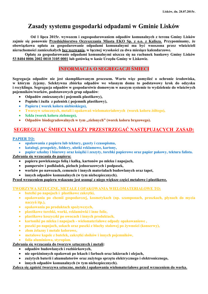 Lisków, dn. 28.07.2015r. Zasady systemu gospodarki odpadami w Gminie Lisków Od 1 lipca 2015r. wywozem i zagospodarowaniem odpadów komunalnych z terenu Gminy Lisków zajmie się ponownie Przedsiębiorstwo Oczyszczania Miasta EKO Sp. z o.o. z Kalisza. Przypominamy, że obowiązkowa opłata za gospodarowanie odpadami komunalnymi ma być wnoszona przez właścicieli nieruchomości zamieszkałych bez wezwania, w łącznej wysokości za dwa miesiące kalendarzowe. Opłatę za gospodarowanie odpadami komunalnymi uiszcza się na rachunek bankowy Gminy Lisków 53 8404 0006 2002 0010 3105 0001 lub gotówką w kasie Urzędu Gminy w Liskowie. INFORMACJA O SEGREGACJI ŚMIECI Segregacja odpadów nie jest skomplikowanym procesem. Warto więc pomyśleć o ochronie środowiska, w którym żyjemy. Selektywna zbiórka odpadów we własnym domu to podstawowy krok do odzysku i recyklingu. Segregacja odpadów w gospodarstwie domowym w naszym systemie to wydzielenie do właściwych pojemników/worków, podstawowych grup odpadów: Odpadów zmieszanych ( pojemnik plastikowy), Popiołu i żużla z palenisk ( pojemnik plastikowy), Papieru ( worek koloru niebieskiego), Tworzyw sztucznych, metali i opakowań wielomateriałowych (worek koloru żółtego), Szkła (worek koloru zielonego), Odpadów biodegradowalnych w tym „zielonych” (worek koloru brązowego). SEGREGUJĄC ŚMIECI NALEŻY PRZESTRZEGAĆ NASTĘPUJĄCYCH ZASAD: PAPIER TO: opakowania z papieru lub tektury, gazety i czasopisma, katalogi, prospekty, foldery, ulotki reklamowe, kartony, papier szkolny i biurowy oraz książki i zeszyty, torebki papierowe oraz papier pakowy, tektura falista. Zabrania się wrzucania do papieru: papieru powlekanego folią i kalką, kartonów po mleku i napojach, pampersów i podkładek, pieluch jednorazowych i podpasek, worków po nawozach, cemencie i innych materiałach budowlanych oraz tapet, innych odpadów komunalnych (w tym niebezpiecznych). Przed wrzuceniem papieru wskazane jest usunąć z niego większe części metalowe i plastikowe. TWORZYWA SZTUCZNE, METALE I OPAKOWANIA WIELOMATERIAŁOWE TO: butelki po napojach i plastikowe zakrętki, opakowania po chemii gospodarczej, kosmetykach (np. szamponach, proszkach, płynach do mycia naczyń itp.), opakowania po produktach spożywczych, plastikowe torebki, worki, reklamówki i inne folie, plastikowe koszyczki po owocach i innych produktach, kartoniki po mleku i napojach - wielomateriałowe odpady opakowaniowe , puszki po napojach, sokach oraz puszki z blachy stalowej po żywności (konserwy), złom żelazny i metale kolorowe, metalowe kapsle z butelek, zakrętki słoików i innych pojemników, folia aluminiowa, styropian. Zabrania się wrzucania do tworzyw sztucznych i metali: odpadów budowlanych i rozbiórkowych, nie opróżnionych opakowań po lekach i farbach oraz lakierach i olejach, zużytych baterii i akumulatorów oraz zużytego sprzętu elektrycznego i elektronicznego, innych odpadów komunalnych (w tym niebezpiecznych). Zaleca się zgnieść tworzywa sztuczne, metale i opakowania wielomateriałowe przed wrzuceniem do worka. SZKŁO OPAKOWANIOWE TO: butelki i słoiki szklane po napojach i żywności, butelki po napojach alkoholowych, szklane opakowania po kosmetykach. Zabrania się wrzucania do szkła: szkła stołowego – żaroodpornego oraz szkła kryształowego, ceramiki, doniczek, talerzy, zniczy z zawartością wosku, żarówek i świetlówek, reflektorów, nie opróżnionych opakowań po lekach, olejach, rozpuszczalnikach, termometrów, strzykawek, monitorów i lamp telewizyjnych, szyb okiennych i zbrojonych oraz szyb samochodowych, luster i witraży, fajansu i porcelany, innych odpadów komunalnych (w tym niebezpiecznych). Zaleca się wrzucać opakowania opróżnione z produktu, bez zakrętek, starać się nie tłuc szkła. Odpady BIODEGRADOWALNE W TYM „ZIELONE” - roślinne to: gałęzie drzew i krzewów, liście, kwiaty i skoszona trawa, chwasty, trociny i kora drzew, owoce, warzywa, muł i glony z oczka wodnego itp. Zabrania się wrzucania do odpadów „zielonych” - roślinnych: kości zwierząt, mięsa i padliny zwierząt, pozostałości z jedzenia, oleju jadalnego, drewna impregnowanego, płyt wiórowych i MDF, odchodów zwierząt, popiołu z węgla kamiennego, innych odpadów komunalnych (w tym niebezpiecznych). Odpady biodegradowalne w tym „zielone” w zależności od warunków na terenie nieruchomości można kompostować w przydomowym kompostowniku. Pozostałe odpady, po wydzieleniu: papieru, szkła, tworzyw sztucznych, metali oraz opakowań wielomateriałowych a także popiołu i żużla z palenisk domowych należy gromadzić wyłącznie w pojemnikach na odpady zmieszane. ODPADY ZMIESZANE TO: resztki żywności, fusy po kawie i herbacie, skorupki po jajkach i orzechach, zużyte ręczniki papierowe i chusteczki higieniczne, waciki, mokry, zabrudzony papier, fajans, porcelana, opakowania po lakierach do włosów, po dezodorantach, po odświeżaczach powietrza, pampersy, pieluchy jednorazowe, podpaski i podkładki itp. Zabrania się wrzucania do POJEMNIKA NA ODPADY ZMIESZANE: popiołu leków, zużytych baterii akumulatorów, zużytego sprzętu elektrycznego i elektronicznego, puszek i butelek po chemikaliach, odpadów po drobnych remontach, połamanych części mebli, zużytych opon. UWAGA: POPIOŁU NIE NALEŻY GROMADZIĆ W POJEMNIKU NA ODPADY ZMIESZANE, GDYŻ BĘDZIE TO RÓWNOZNACZNE Z BRAKIEM SEGREGACJI I W KONSEKWENCJI ZWIĘKSZENIEM OPŁATY.