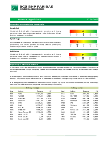Komentarz tygodniowy 12.09.2016 Nasze obecne nastawienie do klas aktywów Rynek akcji W skali od -2 do +2, gdzie -2 oznacza skrajny pesymizm, a +2 skrajny optymizm, nasza obecna ocena perspektyw rynku akcji wynosi 0 (czyli jesteśmy nastawieni neutralnie). Rynek długu W odniesieniu do rynku długu, nasze nastawienie definiujemy określając preferowany czas trwania portfela (duration). Obecnie, preferujemy instrumenty o duration od 1,5 do 3,5 lat. Polski złoty W skali od -2 do +2, gdzie -2 oznacza skrajny pesymizm, a +2 skrajny optymizm, nasze obecne nastawienie do polskiego złotego wynosi 0 (czyli jesteśmy nastawieni neutralnie). Najważniejsze informacje w skrócie • Kluczowym dniem dla oceny obrazu całego tygodnia okazał być się czwartek i decyzja Europejskiego Banku Centralnego w sprawie prowadzonej polityki pieniężnej. Zgodnie z oczekiwaniami stopy procentowe pozostały na swoim dotychczasowym poziomie. • Na nastroje na warszawskim parkiecie, poza globalnymi tendencjami, wpływało oczekiwanie na wieczorną decyzję agencji Moody’s. Ta podała w piątek w komunikacie, że planowany na 9 września przegląd ratingu Polski nie został zaktualizowany. • W bieżącym tygodniu kalendarium makroekonomiczne skupiać się będzie na odczytać sierpniowej inflacji, które mogą okazać się kluczowe dla kolejnej decyzji EBC odnośnie polityki monetarnej. Indeksy - Europa Kraj POL POL POL POL HUN GER FRA GBR EU POL POL POL Indeks WIG WIG 20 mWIG40 sWIG80 BUX DAX CAC 40 FTSE 100 Stoxx Europe 50 Rent. obl. 2 l Rent. obl. 5 l Rent. obl. 10 l Poziom 46484,98 1719,82 3893,94 14007,38 28139,31 10372,07 4406,48 6666,83 2992,06 1,74 2,29 2,89 Indeksy - świat 1W -3,12% -3,81% -2,26% -1,54% -0,95% -2,81% -2,96% -3,09% -2,78% 2,72% 0,70% 0,59% Kraj USA USA USA BRA MEX CHN CHN JPN KOR IND TUR RUS Indeks DJIA S&P 500 NASDAQ Bovespa IPC SHComp HSI Nikkei 225 KOSPI SENSEX ISE 100 RTS Poziom 18085,45 2127,81 4681,54 57999,73 46459,17 3021,98 23290,60 16672,92 1991,48 28353,54 77053,54 972,11 1W -1,81% -1,98% -2,14% -0,41% -2,78% -1,63% -1,52% -2,14% -3,33% -0,63% 0,22% -0,55% Rynek finansowy - Polska i świat WIG Rentowność polskich obligacji 10-letnich Ubiegły tydzień rozpoczął się dość dobrze dla inwestorów. Najwięcej zyskiwały średnie spółki, głównie dzięki silnym wzrostom JSW. Z dużych podmiotów dobrze zachowywała się energetyka, po ogłoszeniu nowej strategii przez Tauron i informacji o mniejszej, niż zapowiadano skali emisji nowych akcji przez PGE. Obroty były niewielkie, z uwagi na Święto Pracy w Stanach Zjednoczonych. Wtorek nie przyniósł wielu zmian w wycenach akcji na warszawskim parkiecie. Środa przyniosła kontynuację wyższych wzrostów na GPW. Katalizatorem były słabe dane ze Stanów Zjednoczonych (ISM dla usług), opublikowane we wtorek po południu, które zostały zinterpretowane przez rynek, jako zmniejszające prawdopodobieństwo podwyżki stóp procentowych przez Fed na wrześniowym posiedzeniu. Na zachowanie rynku pozytywnie wpłynął również brak decyzji odnośnie zmiany stóp procentowych przez Radę Polityki Pieniężnej. Co warto zaznaczyć, przez pierwsze 3 dni tygodnia, krajowe indeksy radziły sobie lepiej od ich zachodnio europejskich odpowiedników. Kluczowym dniem dla oceny obrazu całego tygodnia okazał być się czwartek i decyzja Europejskiego Banku Centralnego w sprawie prowadzonej polityki pieniężnej. Zgodnie z oczekiwaniami stopy procentowe pozostały na swoim dotychczasowym poziomie. Inwestorzy byli natomiast rozczarowani brakiem informacji o odnośnie rozszerzenia obecnego programu skupu aktywów. Podczas ostatniej sesji minionego tygodnia warszawski rynek akcji mocno negatywnie wyróżnił się na tle giełd europejskich. Przyczyną spadków na rynkach w Europie Zachodniej było rozczarowanie po czwartkowej decyzji Europejskiego Banku Centralnego oraz słabe zachowanie się indeksów w Stanach Zjednoczonych. Na nastroje na warszawskim parkiecie, poza globalnymi tendencjami, wpływało oczekiwanie na wieczorną decyzję agencji Moody’s. Ta podała w piątek w komunikacie, że planowany na 9 września przegląd ratingu Polski nie został zaktualizowany. Podczas ostatniego przeglądu opublikowanego 14 maja agencja utrzymała rating Polski na poziomie A-2, lecz obniżyła perspektywę ratingu ze stabilnej do negatywnej. Oznacza to de facto utrzymanie poprzedniego ratingu i perspektywy negatywnej. Krótkoterminowo może to być dobre dla rynków, ale w dłuższej perspektywie niepewność zostaje utrzymana. Na przestrzeni tygodnia do piątkowej sesji zyskiwała ropa naftowa. Wsparciem były dane o najsilniejszym od 1999 r. spadku zapasów w Stanach Zjednoczonych (-14,5 mln baryłek w ciągu tygodnia). W najbliższych dniach coraz więcej uwagi inwestorzy poświęcać będą odbywającym się w następnym tygodniu posiedzeniu FOMC, na którym Fed może zmienić wysokość stóp procentowych. Informacja o funduszach Ubiegły tydzień przyniósł wzrosty wycen krajowych funduszy akcyjnych. Dostępne dziś wyceny nie uwzględniają jednak ostatnich spadków. Niewielkie dodatnie stopy zwrotu wygenerowały fundusze inwestujące w krajowy dług i na rynku pieniężnym. Podobne wyniki osiągnęły zagraniczne fundusze dłużne. Traciły za to jednostki funduszy inwestujących w akcje na rynkach rozwiniętych. Dobre stopy zwrotu osiągnęły jedynie fundusze akcyjne koncentrujące się na rynkach wschodzących. Analizy Online opublikowały zestawienie napływów do funduszy inwestycyjnych w sierpniu. Aktywa netto zwiększyły się o +3,2 mld zł, czyli +1,2% do 261,2 mld zł. Wartościowo był to najwyższy przyrost od 3 miesięcy. Zwyżki na GPW miały przede wszystkim pozytywny wpływ na wartość środków zgromadzonych w portfelach funduszy akcyjnych. W sierpniu aktywa netto w tym segmencie zwiększyły się aż o +0,7 mld zł, czyli +2,7% do 27,8 mld zł. Napływy zanotowano we wszystkich najważniejszych grupach aktyw