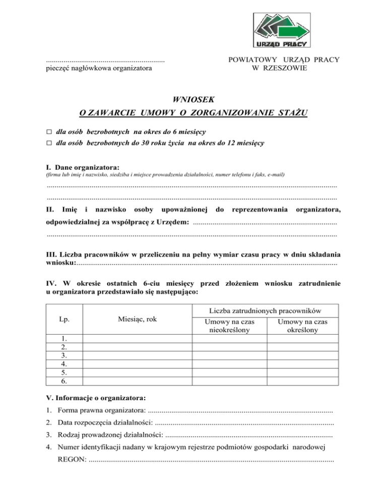 wniosek o zawarcie umowy o zorganizowanie stażu