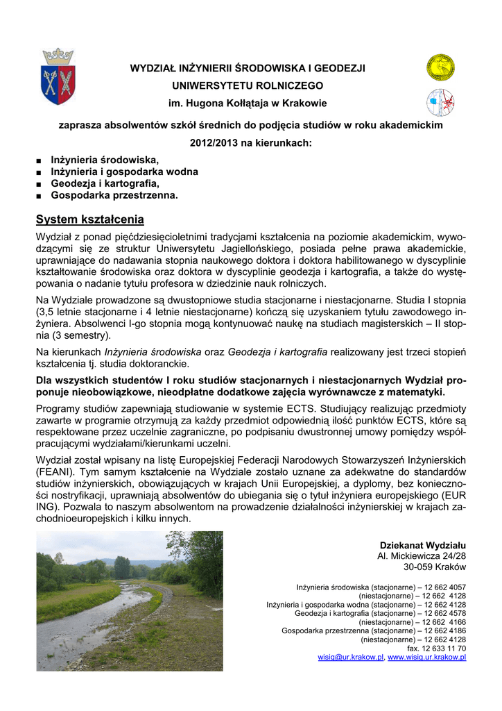 WYDZIAŁ INŻYNIERII ŚRODOWISKA I GEODEZJI UNIWERSYTETU ROLNICZEGO im. Hugona Kołłątaja w Krakowie zaprasza absolwentów szkół średnich do podjęcia studiów w roku akademickim 2012/2013 na kierunkach: ■ ■ ■ ■ Inżynieria środowiska, Inżynieria i gospodarka wodna Geodezja i kartografia, Gospodarka przestrzenna. System kształcenia Wydział z ponad pięćdziesięcioletnimi tradycjami kształcenia na poziomie akademickim, wywodzącymi się ze struktur Uniwersytetu Jagiellońskiego, posiada pełne prawa akademickie, uprawniające do nadawania stopnia naukowego doktora i doktora habilitowanego w dyscyplinie kształtowanie środowiska oraz doktora w dyscyplinie geodezja i kartografia, a także do występowania o nadanie tytułu profesora w dziedzinie nauk rolniczych. Na Wydziale prowadzone są dwustopniowe studia stacjonarne i niestacjonarne. Studia I stopnia (3,5 letnie stacjonarne i 4 letnie niestacjonarne) kończą się uzyskaniem tytułu zawodowego inżyniera. Absolwenci I-go stopnia mogą kontynuować naukę na studiach magisterskich – II stopnia (3 semestry). Na kierunkach Inżynieria środowiska oraz Geodezja i kartografia realizowany jest trzeci stopień kształcenia tj. studia doktoranckie. Dla wszystkich studentów I roku studiów stacjonarnych i niestacjonarnych Wydział proponuje nieobowiązkowe, nieodpłatne dodatkowe zajęcia wyrównawcze z matematyki. Programy studiów zapewniają studiowanie w systemie ECTS. Studiujący realizując przedmioty zawarte w programie otrzymują za każdy przedmiot odpowiednią ilość punktów ECTS, które są respektowane przez uczelnie zagraniczne, po podpisaniu dwustronnej umowy pomiędzy współpracującymi wydziałami/kierunkami uczelni. Wydział został wpisany na listę Europejskiej Federacji Narodowych Stowarzyszeń Inżynierskich (FEANI). Tym samym kształcenie na Wydziale zostało uznane za adekwatne do standardów studiów inżynierskich, obowiązujących w krajach Unii Europejskiej, a dyplomy, bez konieczności nostryfikacji, uprawniają absolwentów do ubiegania się o tytuł inżyniera europejskiego (EUR ING). Pozwala to naszym absolwentom na prowadzenie działalności inżynierskiej w krajach zachodnioeuropejskich i kilku innych. Dziekanat Wydziału Al. Mickiewicza 24/28 30-059 Kraków Inżynieria środowiska (stacjonarne) – 12 662 4057 (niestacjonarne) – 12 662 4128 Inżynieria i gospodarka wodna (stacjonarne) – 12 662 4128 Geodezja i kartografia (stacjonarne) – 12 662 4578 (niestacjonarne) – 12 662 4166 Gospodarka przestrzenna (stacjonarne) – 12 662 4186 (niestacjonarne) – 12 662 4128 fax. 12 633 11 70 [email protected], www.wisig.ur.krakow.pl