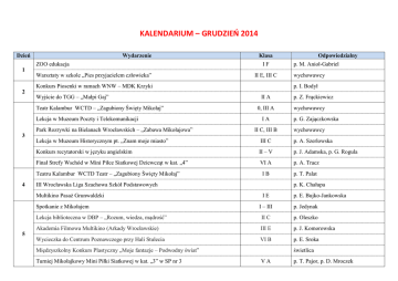 KALENDARIUM – GRUDZIEŃ 2014 Dzień Wydarzenie ZOO edukacja 1 Warsztaty w szkole „Pies przyjacielem człowieka” Klasa IF II E, III C Konkurs Piosenki w ramach WNW – MDK Krzyki 2 Wyjście do TGG – „Małpi Gaj” Teatr Kalambur WCTD – „Zagubiony Święty Mikołaj” Lekcja w Muzeum Poczty i Telekomunikacji Park Rozrywki na Bielanach Wrocławskich – „Zabawa Mikołajowa” 3 p. M. Anioł-Gabriel wychowawcy p. I. Bodył II A 0, III A IA II C, III B p. Z. Frąckiewicz wychowawcy p. G. Zajączkowska wychowawcy Lekcja w Muzeum Historycznym pt. „Znam moje miasto” III C p. A. Szerlowska Konkurs recytatorski w języku angielskim II – V p. J. Adamska, p. G. Rogula Finał Strefy Wschód w Mini Piłce Siatkowej Dziewcząt w kat. „4” VI A p. A. Tracz IB p. T. Palat Teatru Kalambur WCTD Teatr – „Zagubiony Święty Mikołaj” 4 Odpowiedzialny III Wrocławska Liga Szachowa Szkół Podstawowych Multikino Pasaż Grunwaldzki Spotkanie z Mikołajem p. K. Chałupa IE p. E. Bujko-Jankowska I – III p. Jedynak Lekcja biblioteczna w DBP – „Rozum, wiedza, mądrość” II C p. Oleszko Akademia Filmowa Multikino (Arkady Wrocławskie) III E p. J. Komorowska Wycieczka do Centrum Poznawczego przy Hali Stulecia VI B p. E. Sroka 5 Międzyszkolny Konkurs Plastyczny „Moje fantazje – Podwodny świat” Turniej Mikołajkowy Mini Piłki Siatkowej w kat. „3” w SP nr 3 świetlica VA p. T. Pajor, p. D. Mroczek Ogólnopolskie Zawody pływackie "Barbórka 2014" (Głogów) 6 Turniej „Volleymania” Dziewcząt i Chłopców w kat. „4” AWF Wrocław V E, VI E VI A n-le pływania p. A. Tracz, p. T. Pajor 7 Mikołaj w szkole – organizacja SU Wyjście do Multikina „Mikołajki” 8 Od 8 grudnia – Akcja charytatywna „Paczka świąteczna dla potrzebujących rodzin” p. A. Sawras-Nowak ID p. B. Kisiel Wyjście do Muzeum Etnograficznego IV B p. A. Kwiatkowska Finał Strefy Wschód w Mini Piłce Siatkowej Chłopców w kat. „4” VI A p. T. Pajor Dolnośląska Liga Pływacka klas IV w SP 46 VI E p. B. Urysz Wyjście do Muzeum Etnograficznego English High Flier – konkurs j. angielskiego I A, I C IV C IV – VI Konsultacje dla rodziców – półroczne propozycje ocen Wyjście do Muzeum Etnograficznego Wyjście do Muzeum Geologiczne 11 Wycieczka do fabryki bombek w Złotoryi 12 p. A. Szerlowska świetlica Teatru Kalambur WCTD Teatr – „Zagubiony Święty Mikołaj” 10 III C Kiermasz Świąteczny (od 8 do 12 grudnia) Teatru Kalambur WCTD Teatr – „Zagubiony Święty Mikołaj” 9 p. J. Molęda-Słomka wychowawcy p. G. Kostrzycka p. G. Rogula wszyscy n-le IV A kółko przyrodnicze p. Wawrzyńczuk p. I. Bodył I F, I G wychowawcy Teatru Kalambur WCTD Teatr – „Zagubiony Święty Mikołaj” II E p. B. Matysiak Wyjście do Multikina na film pt. „Dziadek do orzechów” III D p. A. Lach Lekcja biblioteczna w DBP – „Rozum, wiedza, mądrość” II B p. I. Kopaniarz Wyjście do Muzeum Etnograficznego IV D p. M. Kamińska Wyjście do Aquaparku VB p. B. Godlewska Zimowe Mistrzostwa Okręgu (Nowa Ruda) V E, VI E n-le pływania 13 Zimowe Mistrzostwa Okręgu (Nowa Ruda) V E, VI E n-le pływania 14 Turniej Mini Piłki Siatkowej Dziewcząt o Puchar Prezesa MMKS (Kłodzko) IV A, V A, VI A p. A. Tracz p. D. Mroczek 15 Koncert muzyczny z p. T. Nestorowiczem I A, I E, I F, II A-D, III B, III D wychowawcy I A, I B, I F wychowawcy Lekcja biblioteczna w CK Agora pt. „Zwyczaje świąteczne” Wyjście do Muzeum Etnograficznego 16 VI Szkolny Konkurs Sudoku klas IV – VI IV E IV – VI Konkurs kolęd i pastorałek Koncert muzyczny z p. A. Zwoźniak p. B. Urysz p. M. Kamińska świetlica 0, I B, I H wychowawcy 17 Próbny sprawdzian klas szóstych przygotowany przez CKE 18 Lekcja biblioteczna w CK Agora pt. „Zwyczaje świąteczne” I C, I E wychowawcy Wigilie klasowe 0 – VI wychowawcy Jasełka 0 – VI katecheci 19 Międzynarodowe Zawody pływackie "Świdnicka Gwiazdka” (Świdnica) Dyrektor IV E, V E, VI E Rozstrzygnięcie konkursu na najpiękniejszą zabawkę choinkową Koncert muzyczny z p. A. Zwoźniak 20 21 22 23 24 25 26 Międzynarodowe Zawody pływackie "Świdnicka Gwiazdka” (Świdnica) Zimowa przerwa świąteczna od 22 grudnia do 31 grudnia 2014 r. n-le pływania świetlica I C, I D, I G, II E, III A, III C wychowawcy IV E, V E, VI E n-le pływania 27 28 29 30 31