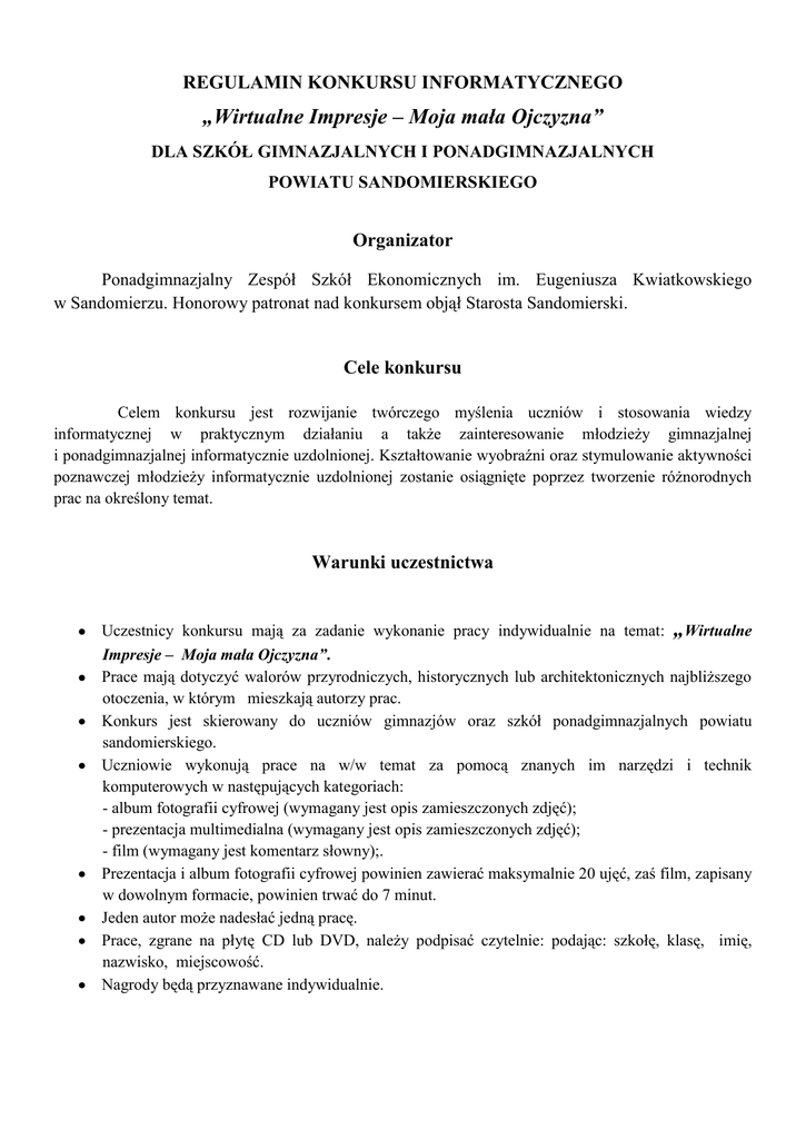 REGULAMIN KONKURSU INFORMATYCZNEGO „Wirtualne Impresje – Moja mała Ojczyzna” DLA SZKÓŁ GIMNAZJALNYCH I PONADGIMNAZJALNYCH POWIATU SANDOMIERSKIEGO Organizator Ponadgimnazjalny Zespół Szkół Ekonomicznych im. Eugeniusza Kwiatkowskiego w Sandomierzu. Honorowy patronat nad konkursem objął Starosta Sandomierski. Cele konkursu Celem konkursu jest rozwijanie twórczego myślenia uczniów i stosowania wiedzy informatycznej w praktycznym działaniu a także zainteresowanie młodzieży gimnazjalnej i ponadgimnazjalnej informatycznie uzdolnionej. Kształtowanie wyobraźni oraz stymulowanie aktywności poznawczej młodzieży informatycznie uzdolnionej zostanie osiągnięte poprzez tworzenie różnorodnych prac na określony temat. Warunki uczestnictwa Uczestnicy konkursu mają za zadanie wykonanie pracy indywidualnie na temat: „Wirtualne Impresje – Moja mała Ojczyzna”. Prace mają dotyczyć walorów przyrodniczych, historycznych lub architektonicznych najbliższego otoczenia, w którym mieszkają autorzy prac. Konkurs jest skierowany do uczniów gimnazjów oraz szkół ponadgimnazjalnych powiatu sandomierskiego. Uczniowie wykonują prace na w/w temat za pomocą znanych im narzędzi i technik komputerowych w następujących kategoriach: - album fotografii cyfrowej (wymagany jest opis zamieszczonych zdjęć); - prezentacja multimedialna (wymagany jest opis zamieszczonych zdjęć); - film (wymagany jest komentarz słowny);. Prezentacja i album fotografii cyfrowej powinien zawierać maksymalnie 20 ujęć, zaś film, zapisany w dowolnym formacie, powinien trwać do 7 minut. Jeden autor może nadesłać jedną pracę. Prace, zgrane na płytę CD lub DVD, należy podpisać czytelnie: podając: szkołę, klasę, imię, nazwisko, miejscowość. Nagrody będą przyznawane indywidualnie. Termin i miejsce nadsyłania prac Pracę należy przesłać lub dostarczyć osobiście do 5 lutego 2016 roku, na poniższy adres: Ponadgimnazjalny Zespół Szkół Ekonomicznych im. E. Kwiatkowskiego ul. Żeromskiego 8, 27-600 Sandomierz z dopiskiem KONKURS INFORMATYCZNY „Wirtualne Impresje – Moja mała Ojczyzna”. Rozstrzygnięcie konkursu Wyłonienie zwycięzców w poszczególnych kategoriach odbędzie się w dwóch etapach: ETAP I Jury wybierze najciekawsze prace przedstawiające temat przewodni, po 3 z każdej kategorii. Reasumując do Etapu II zostanie zakwalifikowanych maksymalnie 9 prac. O wynikach uczestnicy zostaną poinformowani do 04 marca 2016 roku drogą elektroniczną lub telefoniczną. ETAP II Etap II odbędzie się dnia 12 kwietnia 2016 roku w Ponadgimnazjalnym Zespole Szkół Ekonomicznych im. E. Kwiatkowskiego w Sandomierzu. Polegał będzie na wyłonieniu zwycięzcy wśród autorów nadesłanych prac (bez względu na rodzaj kategorii) po osobistym ich zaprezentowaniu i po glosowaniu publiczności. Rozdanie nagród Laureaci miejsc I-III otrzymają dyplomy oraz cenne nagrody rzeczowe: I miejsce – Tablet; II miejsce – Słuchawki bezprzewodowe; III miejsce – Pendrive 32 GB. Pozostali uczestnicy Etapu II nagrody pocieszenia. Publikacja prac Wybrane przez jury prace umieszczone zostaną na Stronie Internetowej Ponadgimnazjalnego Zespołu Szkół Ekonomicznych im. E. Kwiatkowskiego w Sandomierzu oraz na stronie Starostwa Powiatowego w Sandomierzu. Uwagi dodatkowe • • • • Prace niezgodne z regulaminem nie będą brane pod uwagę. Rozstrzygnięcie jury jest ostateczne (od werdyktu nie przysługuje odwołanie). Osoby nagrodzone i wyróżnione zostaną powiadomione osobiście o miejscu i godzinie uroczystego rozdania nagród. Wszelkie sprawy nieuwzględnione w regulaminie rozstrzyga Organizator. Kontakt Osoby do kontaktu – w przypadku pytań odnośnie konkursu: Sylwia Frańczak – [email protected] Teresa Zasadni – [email protected]