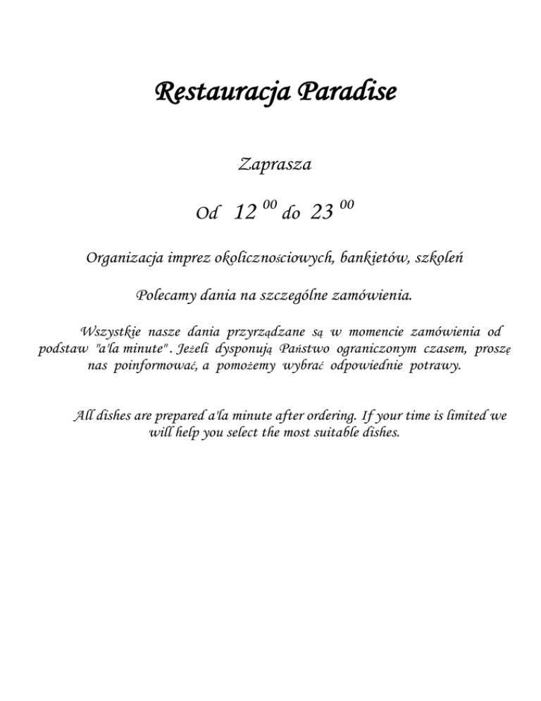 Restauracja Paradise Zaprasza Od 12 00 do 23 00 Organizacja imprez okolicznościowych, bankietów, szkoleń Polecamy dania na szczególne zamówienia. Wszystkie nasze dania przyrządzane są w momencie zamówienia od podstaw "a'la minute" . Jeżeli dysponują Państwo ograniczonym czasem, proszę nas poinformować, a pomożemy wybrać odpowiednie potrawy. All dishes are prepared a'la minute after ordering. If your time is limited we will help you select the most suitable dishes. Szef Kuchni poleca: 1. Polewka staropolska na serwatce z jagnięciną i kluseczkami scypionymi. 350 ml/50g 12 zł 2. Carpaccio z polędwicy wołowej z tartym oscypkiem i kaparami. 3. 4. 100g Aromatyzowany filet z kaczki pieczony na różowo podany z sosem figowym, sałatką ziemniaczaną i czerwoną kapustą. 24zł 40 zł Sernik na zimno z malinami i sorbetem z mango. 10 zł A może coś na zimno? 1. Tatar po polsku. 100 g/70g 21 zł 2. Śledź po japońsku groszkiem posypany. 100 g/70g 9 zł 3. Roladka z łososia wędzonego w asyście suszonych pomidorów i oliwek. 100 g 12zł 4. Śledzik klasyczny po węgiersku lub w śmietanie 100 g/50g 8 zł 5. Mozarella z pomidorami skropiona aromatyczną oliwą bazyliową i oprószona oregano. 120 g 14 zł Trochę cieplej. Camembert panierowany w bułce z orzechami na sałatce z marynowaną gruszką i żurawiną. 120 g 2. Oscypek grillowany z boczkiem na chrupiącej sałacie podany z emulsją malinowo – balsamiczną. 120 g 3. Rydze duszone na maśle z cebulką. 200g 1. 13 zł 14 zł 21zł Zupy ~ 300 ml ~ 1. Złocisty rosół z perliczki z makaronem. 7 zł 2. Barszcz czerwony z drożdżowym pierożkiem. 8 zł 3. Aromatyczna zupa z grzybów leśnych z kluseczkami drobiowymi. 12 zł 4.Zalewajka z ziemniakami i kiełbasą na zakwasie. 5 zł 5.Kołduny staropolskie w barszczu lub rosole. 8 zł 6. Zupa kokosowa z grillowanym łososiem aromatyzowana limonką. 14 zł ~ 400 ml ~ 7. Żurek staropolski na borowikach. 400 ml/ 50g 8. Tradycyjne flaczki wołowe. 9. Kwaśnica na wędzące z żeberkiem. 400 ml/ 100 g 9 zł 10 zł 12 zł Dania z jagnięciny i cielęciny. 1.Pieczona jagnięcina z warzywami podana z sosem tymiankowym. 140 g 2. Jagnięcina duszona w sosie słodko-kwaśnym. 3oo g 3.Cielęcina po polsku z kurkami duszonymi w śmietanie. 140g 4.Gulasz cielęcy z kaszą gryczaną. 200g/150g 30 zł 25 zł 20 zł 16 zł Dania z wołowiny. 1. Stek wołowy z tartym oscypkiem i dodatkiem chrzanu. 150g 3. Stek Szefa kuchni z jajkiem sadzonym i plastrem boczku. 150 g 3. Placek po staropolsku z gulaszem. 200 g/ 300 g 4. Pieczeń wołowa w sosie chrzanowo - musztardowym. 140 g 5. Stek wołowy po diabelsku na ostro. 150 g 42 zł 42zł 18 zł 20 zł 40 zł Dania z wieprzowiny. 1. Żeberka na plackach ziemniaczanych z tradycyjną kapustą zasmażaną z grzybami. 400 g 25 zł 2. Stek z karkówki z sosem tzatzyki. 150 g 16 zł 3. Schabowy panierowany. 150 g 10 zł 4. Polędwiczka wieprzowa z grilla na leśnym runie. 150 g 22 zł 4. Schab zapiekany z pieczarkami, serem żółtym, suszonymi pomidorami na miksie sałat. 150 g 20 zł 6. Eskalopki z polędwiczek z oscypkiem i szczypiorkiem. 150 g 20 zł 7. Golonka z warzywami w piwie duszona. wg 100g – 8 zł Dania z drobiu. 1. Filet z kurczaka grillowany z mozarellą i pomidorem. 150 g 2. Filet z kurczaka w chrupiącej panierce. 150 g 3. Filet grillowany w boczku z cebulką podany na ostrym sosie. 180 g 5. Pierś z kurczaka w cieście z pieczarkami i serem. 150g 5. Dewolay z masłem i pietruszką. 150 g 17 zł 10 zł 18 zł 15zł 12 zł Ryby. 1. Pstrąg smażony. wg 100 g - 8 zł 2. Filet z łososia grillowany na wachlarzu fasolki szparagowej. 150g 30 zł 3. Pstrąg gotowany w jarzynach. wg 100 g - 8 zł Makarony. 1. Tagietelle z rydzami i groszkiem cukrowym. 400g 18zł 2. Farfale z polędwiczką wieprzową w orientalnym sosie. 400g 16zł 3. Tagiatelle z łososiem. (łosoś, cebula, czosnek, papryka, sos śmietanowy) 400g 18zł Sałatki. 1. Sałatka z karczkiem lub polędwiczkami z kurczaka w sosie tysiąca wysp. 18 zł (mix sałat, pomidor, ogórek konserwowy, rzodkiewka) 2. Sałatka z chrupiącym kurczakiem, soczystą sałatą i dipem miodowo – majonezowym. 15 zł (mix sałat, oliwki zielone, ogórek konserwowy, kurczak panierowany) 3. Sałatka z dzikiego łososia. (mix sałat, łosoś, jajko, brokuł, oliwa truflowa, sos koperkowy) 19 zł 4. Sałatka Szefa Kuchni. (mix sałat, pieczarka, jajko, kurczak, pomidor, sos czosnkowy) 17 zł 5. Sałatka z dipem ananasowym i serem pleśniowym 15zł (mix sałat, pomidor, ogórek, czerwona cebula, sos śmietanowo ananasowy, grzanki, grillowany kurczak) Dania mączne. 1. Pierogi z mięsem i okrasą. 2. Pierogi z bryndzą. 4. Pierogi ruskie. 5. Pierogi Hrabiny Tyszkiewiczowej z kurkami i szynką. 6. Półmisek Szefa z sosem grzybowym. 10 sztuk 10 sztuk 10 sztuk 11 zł 11 zł 11 zł 10 sztuk 20 sztuk 15 zł 25 zł Dla dzieci. 1. Pomidorowa z ryżem lub makaronem. 250 ml 5 zł 2. Filecik malucha. 100 g 7 zł 3. Makaron z sosem bolognese. 200 g 12 zł 4. Paluszki z kurczaka. 120 g 10 zł 5. Pierożki z jagodami ( 6sztuk) 6 sztuk 8 zł 6. Sola w złocistej panierce. 100 g 8 zł 7. Naleśnik z polewą jagodową i gałką lodów. 1 sztuka 7 zł Desery. 1. Szarlotka na łożu jagodowym z gałką lodów i bitą śmietaną . 150 g 9 zł 2. Sernik wiedeński z konfiturą wiśniową. 150 g 9 zł 3. Lody z owocami i bitą śmietaną i listkiem świeżej mięty. 200g 10 zł 4. Naleśniki z musem truskawkowym w asyście lodów i bitej śmietany. 2 sztuki 10 zł 5. Lody w chrupiącej panierce, podane z nutką czekolady i bitej śmietany. 80g 10zł Dodatki do dań. Ziemniaki opiekane z sosem czosnkowym. 2. Frytki. 3. Ryż. 4. Puree ziemniaczane. 5. Warzywa gotowane. 6. Pieczywo. 7. Masło. 8. Chrzan. 9. Kapusta zasmażana. 10. Fasolka szparagowa na słodko lub klasycznie. 11. Kalafior w bułce. 12. Brokuły zapiekane pod beszamelem. 13. Surówka z białej kapusty. 14. Sałatka z czerwonej kapusty z aromatem octu winneg