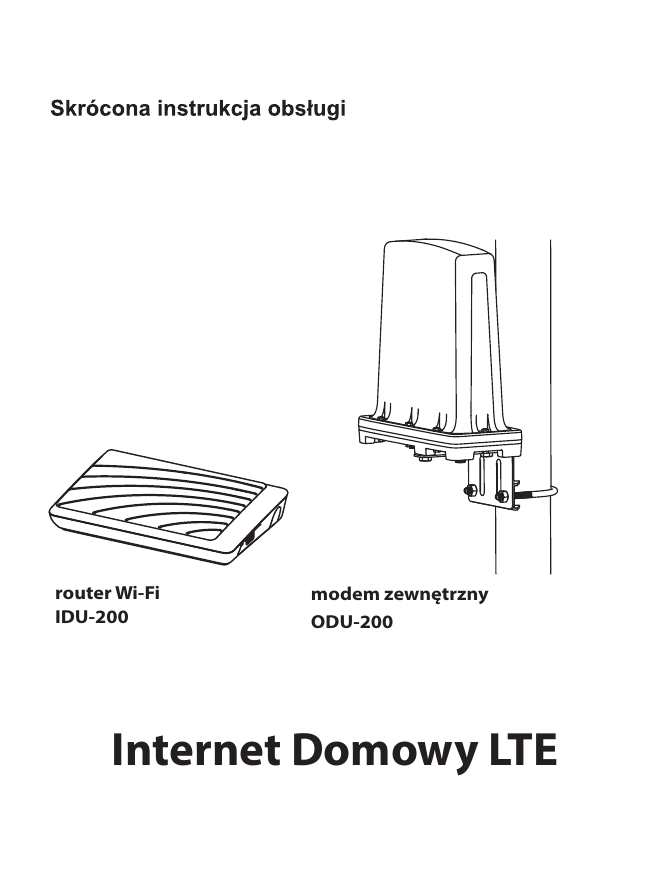router Wi-Fi IDU-200 modem zewnętrzny ODU-200 Internet Domowy LTE INFORMACJA PRAWNA Copyright © 2016 InterPhone Service Sp. z o.o. Wszystkie prawa zastrzeżone. Niniejsza publikacja, ani żadna jej część, nie może być wykorzystywana, kopiowana, tłumaczona lub używana w jakiejkolwiek innej formie i za pośrednictwem jakichkolwiek środków, zarówno elektronicznych, jak i mechanicznych bez pisemnej zgody InterPhone Service Sp. z o.o. InterPhone Service Sp. z o.o. zastrzega sobie prawo do wprowadzania poprawek do błędów w tekście oraz do aktualizacji specyfikacji bez uprzedzenia. Spis treści Wprowadzenie.......... 4 Opis urządzeń.......... 5 1. Zawartość pakietu sprzedażnego.......... 5 2. Wygląd urządzeń.......... 6 Montaż zestawu.......... 10 1. Instalacja karty SIM.......... 10 2. Schemat instalacji zestawu.......... 12 3. Zalecenia odnośnie montażu.......... 13 4. Montaż modemu zewnętrznego ODU-200 .......... 14 5. Schemat podłączenia modemu zewnętrznego ODU-200.......... 14 6. Montaż routera Wi-Fi IDU-200.......... 16 7. Schemat podłączenia routera Wi-Fi IDU-200.......... 17 Zarządzanie .......... 18 1. Podłączanie komputera.......... 18 2. Logowanie na stronę zarządzania.......... 19 3. Połączenie z Internetem.......... 20 Ważne informacje o bezpieczeństwie oraz obsłudze.......... 21 3 Wprowadzenie Zestaw do Internetu Domowego LTE to nowoczesne rozwiązanie zapewniające dostęp do szerokopasmowego Internetu LTE w lokalizacjach, gdzie dotychczas było to ograniczone. Dzięki zastosowaniu zewnętrznego modemu LTE ODU-200 i doprowadzeniu Internetu do wnętrza mieszkania poprzez kabel koncentryczny, można uzyskać znaczącą poprawę mocy odbieranego sygnału bez konieczności stosowania dodatkowych anten zewnętrznych. Do instalacji zestawu można wykorzystać istniejącą instalację antenową TV (satelitarnej bądź naziemnej) przesyłając po jednym kablu antenowym zarówno sygnał TV/SAT jak i Internet LTE. Do udostępnienia Internetu wewnątrz domu lub mieszkania służy router Wi-Fi IDU-200. Router posiada 4 porty LAN, przez co umożliwia podłączenie urządzeń zewnętrznych, takich jak dekoder STB czy komputer PC poprzez kabel Ethernet, oraz łączność Wi-Fi umożliwiając podłączenie urządzeń bezprzewodowych takich jak smartphone czy tablet. UWAGA! •Nie należy montować zestawu w przypadku posiadania instalacji antenowej z urządzeniami multi-switch. •Nie należy montować wzmacniaczy pomiędzy urządzeniami ODU i IDU. •Filtry, trójniki, gniazda antenowe z filtrami, zamontowane w instalacji antenowej i „odcinające” sygnał o częstotliwości 2,4 GHz mogą powodować nieprawidłowe działanie zestawu, lub całkowicie uniemożliwić jego działanie. •Urządzenia ODU-200 i IDU-200 nie są kompatybilne z urządzeniami IDU-100 oraz ODU-100! 4 Opis urządzeń 1. Zawartość pakietu sprzedażnego Modem zewnętrzny ODU-200 – zawartość pakietu modem zewnętrzny LTE ODU-200 śruba U-kształtna uchwyt śruby gumowa osłona złącza antenowego - 2 szt. Router Wi-Fi IDU-200 – zawartość pakietu router Wi-Fi IDU-200 zasilacz kabel Ethernet 1m 5 Narzędzia i akcesoria montażowe Uwaga. •Narzędzia i akcesoria montażowe nie są dostępne w zestawie, należy kupić je oddzielnie. Klucz nasadowy M10 Wkrętak krzyżowy 2. Wygląd urządzeń Modem zewnętrzny ODU-200 6 Kabel koncentryczny Złącza antenowe typu F 1 2 3 4 Modem zewnętrzny ODU-200 InterPhone Service Sp. z o.o. Zmontowane w Polsce 1. Zabezpieczenie gniazda karty SIM - nakrętka zabezpieczająca pod którym znajduje się gniazdo karty SIM 2. LED - dioda sygnalizacyjna LED informująca o mocy odbieranego sygnału LTE: • fioletowa – bardzo dobra moc odbieranego sygnału • niebieska – dobra moc odbieranego sygnału • zielona – średnia moc odbieranego sygnału • pomarańczowa – słaba moc odbieranego sygnału • czerwona migająca - brak sygnału 3. IDU – złącze antenowe służące do podłączenia routera Wi-Fi IDU200 za pomocą kabla koncentrycznego. 4. LNB – złącze antenowe służące do podłączenia konwertera satelitarnego lub anteny naziemnej telewizji cyfrowej za pomocą kabla koncentrycznego. 7 Router Wi-Fi IDU-200 Power WiFi Ethernet WPS ODU Power ODU Status ODU LTE Diody sygnalizacyjne LED: • Power – router jest włączony; • WiFi – jest włączony dostęp po sieci bezprzewodowej Wi-Fi; • Ethernet – podłączone zostało urządzenie zewnętrzne za pomocą kabla Ethernet; • WPS – jeśli jest niebieska to funkcja WPS jest aktywna; • ODU Power – niebieska oznacza, że ODU jest prawidłowo zasilane; • ODU Status – takie samo znaczenie jak w przypadku diody LED w ODU : • 8 • fioletowa – bardzo dobra moc odbieranego sygnału; • niebieska – dobra moc odbieranego sygnału; • zielona – średnia moc odbieranego sygnału; • pomarańczowa – słaba moc odbieranego sygnału; • czerwona migająca - brak sygnału; ODU LTE – niebieska oznacza, że połączenie LTE jest aktywne; Jeśli ODU Power i ODU LTE nie świecą a ODU Status mruga na czerwono to oznacza, że nie ma komunikacji pomiędzy ODU i IDU. 1 2 3 4 5 6 7 1. WPS – przycisk aktywujący połączenie WPS; 2. ODU RST – przycisk restartu ODU, wciśnięty przez: - około 5 sekund, to reset prądowy (krótkie odłączenie zasilania); Power - ponad 10 sekund, to reset urządzenia do ustawień fabrycznych; WiFi 3. RST – przycisk restartu IDU, wciśnięty przez: Ethernet - około 5 sekundy, to reset prądowy (krótkie odłączenie zasilania); WPS - ponad 10 sekund, to reset urządzenia do ustawień fabrycznych; ODU Power 4. DC – gniazdo zasilacza; ODU Status 5. LAN1- LAN4 – gniazda Ethernet; ODU LTE 6. STB – złącze antenowe służące do podłączania dekodera TV satelitarnej lub TV naziemnej za pomocą kabla koncentrycznego; 7. ODU - złącze antenowe służące do podłączania zewnętrznego modemu ODU-200 za pomocą kabla koncent