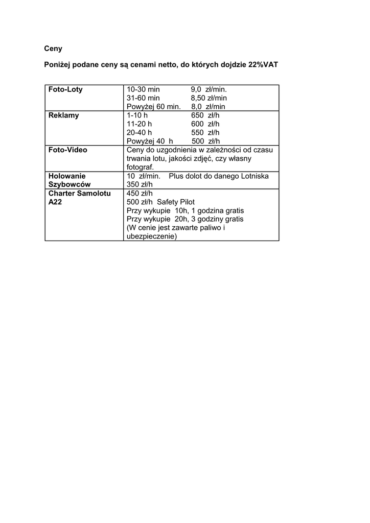 Ceny Poniżej podane ceny są cenami netto, do których dojdzie 22%VAT Foto-Loty Reklamy Foto-Video Holowanie Szybowców Charter Samolotu A22 10-30 min 9,0 zł/min. 31-60 min 8,50 zł/min Powyżej 60 min. 8,0 zł/min 1-10 h 650 zł/h 11-20 h 600 zł/h 20-40 h 550 zł/h Powyżej 40 h 500 zł/h Ceny do uzgodnienia w zależności od czasu trwania lotu, jakości zdjęć, czy własny fotograf. 10 zł/min. Plus dolot do danego Lotniska 350 zł/h 450 zł/h 500 zł/h Safety Pilot Przy wykupie 10h, 1 godzina gratis Przy wykupie 20h, 3 godziny gratis (W cenie jest zawarte paliwo i ubezpieczenie)