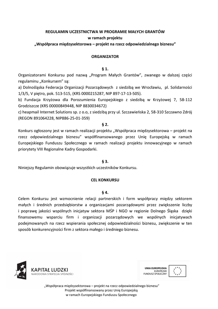 REGULAMIN UCZESTNICTWA W PROGRAMIE MAŁYCH GRANTÓW w ramach projektu „Współpraca międzysektorowa – projekt na rzecz odpowiedzialnego biznesu” ORGANIZATOR § 1. Organizatorami Konkursu pod nazwą „Program Małych Grantów”, zwanego w dalszej części regulaminu „Konkursem” są: a) Dolnośląska Federacja Organizacji Pozarządowych z siedzibą we Wrocławiu, pl. Solidarności 1/3/5, V piętro, pok. 513-515, (KRS 0000215287, NIP 897-17-13-505). b) Fundacja Krzyżowa dla Porozumienia Europejskiego z siedzibą w Krzyżowej 7, 58-112 Grodziszcze (KRS 00000849448, NIP 8830034672) c) heapmail Internet Solutions sp. z o.o, z siedzibą przy ul. Szczawieńska 2, 58-310 Szczawno Zdrój (REGON 891064228, NIP886-25-01-359) § 2. Konkurs ogłoszony jest w ramach realizacji projektu „Współpraca międzysektorowa – projekt na rzecz odpowiedzialnego biznesu” współfinansowanego przez Unię Europejską w ramach Europejskiego Funduszu Społecznego w ramach realizacji projektu innowacyjnego w ramach priorytety VIII Regionalne Kadry Gospodarki. § 3. Niniejszy Regulamin obowiązuje wszystkich uczestników Konkursu. CEL KONKURSU § 4. Celem Konkursu jest wzmocnienie relacji partnerskich i form współpracy między sektorem małych i średnich przedsiębiorstw a organizacjami pozarządowymi przez zwiększenie liczby i poprawę jakości wspólnych inicjatyw sektora MŚP i NGO w regionie Dolnego Śląska dzięki finansowemu wsparciu firm i organizacji pozarządowych we wspólnych inicjatywach podejmowanych na rzecz wspierania społecznej odpowiedzialności biznesu, zwiększenie w ten sposób konkurencyjności firm z sektora małego i średniego biznesu. „Współpraca międzysektorowa – projekt na rzecz odpowiedzialnego biznesu” Projekt współfinansowany przez Unię Europejską w ramach Europejskiego Funduszu Społecznego § 5. Istotą Konkursu jest finansowe wsparcie inicjatyw społecznych podejmowanych w partnerstwie przez przedstawicieli/lki sektora MŚP i NGO na terenie Dolnego Śląska w realizowaniu partnerskich małych projektów o charakterze społecznym, podejmowanych na rzecz zwiększenia jakości życia mieszkańców i poprawy stanu środowiska w danej społeczności lokalnej. Preferowane będą inicjatywy odpowiadające na potrzeby mieszkańców oraz przyczyniające się do zwiększenia konkurencyjności partnera biznesowego. KTO MOŻE STARAĆ SIĘ O DOTACJĘ? § 6. O dotację mogą ubiegać się Partnerstwa składające się z: małego lub średniego przedsiębiorstwa mającego swoją siedzibę i działającego na terenie Dolnego Śląska oraz instytucji pożytku publicznego działającego w myśl ustawy o działalności pożytku publicznego i wolontariacie zgodnie z art. 3 ust. 2 i 3 ustawy także mające swoją siedzibę i działające na terenie Dolnego Śląska. Instytucje te muszą zawrzeć między sobą umowę partnerską jasno poświadczająca wspólna realizację przedsięwzięcia i określającą role i podział zadań w przedmiotowym projekcie. NA JAKIE DZIAŁANIA MOŻNA OTRZYMAĆ DOTACJĘ? § 7. Wsparcie finansowe można uzyskać na projekty przewidziane do realizacji w ww partnerstwie z zakresu wspierania społecznej odpowiedzialności biznesu w społeczności lokalnej z wyłączeniem działań określanych jako CSR wewnętrzny (nastawionych na wsparcie wewnątrz firmy np. szkolenia dla pracowników danego przedsiębiorstwa). Finansowanie będzie przyznawane w szczególności na działania z następujących obszarów: a) działania z zakresu edukacji (w tym również z zakresu szeroko rozumianej edukacji obywatelskiej), b) wsparcie działań artystyczno – kulturalnych, w tym także zwiększających udział obywateli w życiu artystyczno – kulturalnym m.in. poprzez kształtowanie postaw i warunków zachęcających do aktywnego udziału w życiu społeczno – kulturalnym, zwiększających kompetencje społeczne poprzez odbiór i uczestnictwo w działaniach kulturalno-artystycznych, c) działania propagujące zdrowy i aktywny tryb życia, w tym aktywne formy wypoczynku i spędzania czasu wolnego przyczyniające się do zwiększenia aktywności dzieci i młodzieży, osób dorosłych i promowania aktywnego i zdrowego trybu życia, „Współpraca międzysektorowa – projekt na rzecz odpowiedzialnego biznesu” Projekt współfinansowany przez Unię Europejską w ramach Europejskiego Funduszu Społecznego d) rozwój nauki i współpracy międzysektorowej, w tym wspieranie zdolnych młodych naukowców i uczniów realizujących samodzielne projekty o charakterze naukowym, społecznym. § 8. Preferowane będą działania realizowane w odpowiedzi na potrzeby społeczności lokalnych i przyczyniające się do poprawy dobrostanu danego obszaru poprzez wzrost zaangażowania społecznego. § 9. Dotacja może stanowić część większego budżetu projektu zaplanowanego i przewidzianego do realizacji i stanowić źródło współfinansowania zaplanowanego działania w ww. obszarach tematycznych. CZAS TRWANIA KONKURSU § 10. Konkursu zostanie ogłoszony w I kwartale 2012 roku, a zakończyć musi się w III kwartale 2012 roku. Szczegółowy harmonogram aplikowania o środki oraz harmonogram oceny projektów zostanie opublikowany wraz z informacją o ogłoszeniu konkursu na stronie projektu www.odpowedzialnybiznes.eu, www.dfop.org.pl, www.krzyzowa.org.pl, www.hm.pl, www.ngo.pl, www.dolnoslaskie.ngo.pl. WYSOKOŚĆ DOTACJI § 11. Przyznawane zostaną granty w wysokości nieprzekraczającej 5 000 zł, a przyznana dotacja może stanowić część budżetu projektu realizowanego i finansowanego z innych źródeł. „Współpraca międzysektorowa – projekt na rzecz odpowiedzialnego biznesu” Projekt współfinansowany przez Unię Europejską w ramach Europejskiego Funduszu Społecznego PROCES PRZYZNAWANIA DOTACJI: § 12. Proces składać się będzie z dwóch etapów: Etap 1: LIST INTENCYJNY: Partnerzy składają list intencyjny, który zawierać musi następujące infor