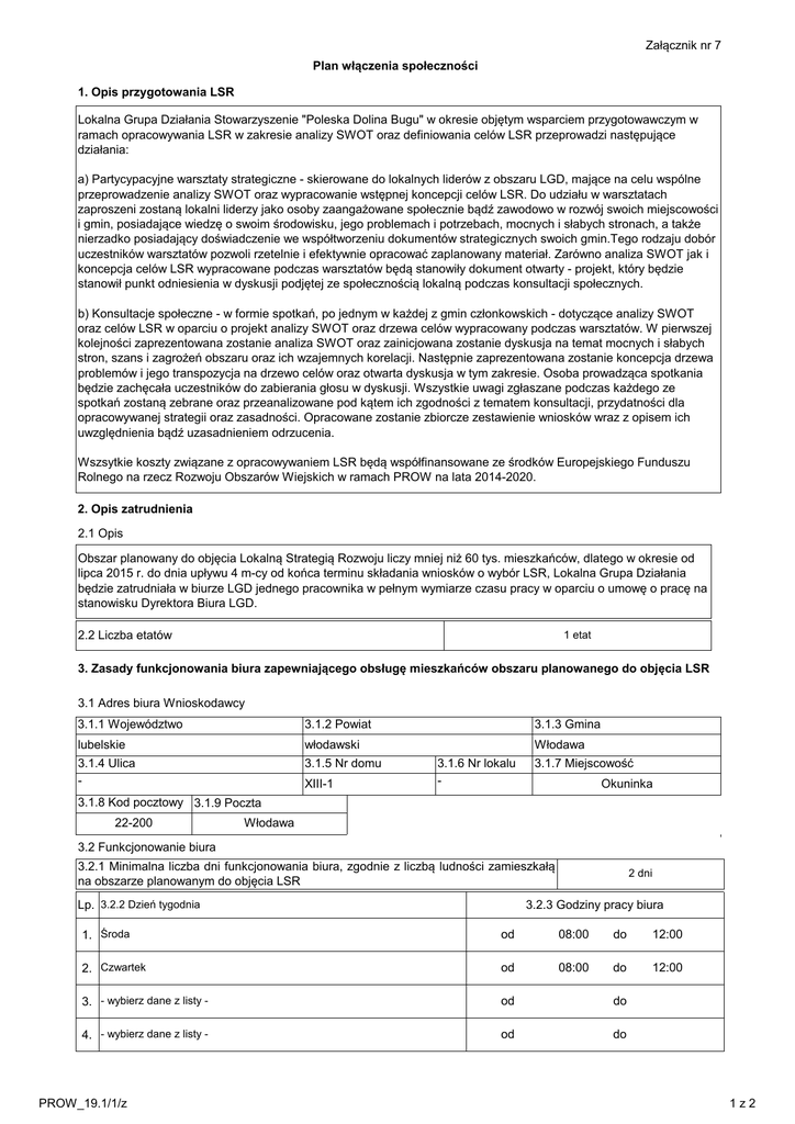 Załącznik nr 7 Plan włączenia społeczności 1. Opis przygotowania LSR Lokalna Grupa Działania Stowarzyszenie "Poleska Dolina Bugu" w okresie objętym wsparciem przygotowawczym w ramach opracowywania LSR w zakresie analizy SWOT oraz definiowania celów LSR przeprowadzi następujące działania: a) Partycypacyjne warsztaty strategiczne - skierowane do lokalnych liderów z obszaru LGD, mające na celu wspólne przeprowadzenie analizy SWOT oraz wypracowanie wstępnej koncepcji celów LSR. Do udziału w warsztatach zaproszeni zostaną lokalni liderzy jako osoby zaangażowane społecznie bądź zawodowo w rozwój swoich miejscowości i gmin, posiadające wiedzę o swoim środowisku, jego problemach i potrzebach, mocnych i słabych stronach, a także nierzadko posiadający doświadczenie we współtworzeniu dokumentów strategicznych swoich gmin.Tego rodzaju dobór uczestników warsztatów pozwoli rzetelnie i efektywnie opracować zaplanowany materiał. Zarówno analiza SWOT jak i koncepcja celów LSR wypracowane podczas warsztatów będą stanowiły dokument otwarty - projekt, który będzie stanowił punkt odniesienia w dyskusji podjętej ze społecznością lokalną podczas konsultacji społecznych. b) Konsultacje społeczne - w formie spotkań, po jednym w każdej z gmin członkowskich - dotyczące analizy SWOT oraz celów LSR w oparciu o projekt analizy SWOT oraz drzewa celów wypracowany podczas warsztatów. W pierwszej kolejności zaprezentowana zostanie analiza SWOT oraz zainicjowana zostanie dyskusja na temat mocnych i słabych stron, szans i zagrożeń obszaru oraz ich wzajemnych korelacji. Następnie zaprezentowana zostanie koncepcja drzewa problemów i jego transpozycja na drzewo celów oraz otwarta dyskusja w tym zakresie. Osoba prowadząca spotkania będzie zachęcała uczestników do zabierania głosu w dyskusji. Wszystkie uwagi zgłaszane podczas każdego ze spotkań zostaną zebrane oraz przeanalizowane pod kątem ich zgodności z tematem konsultacji, przydatności dla opracowywanej strategii oraz zasadności. Opracowane zostanie zbiorcze zestawienie wniosków wraz z opisem ich uwzględnienia bądź uzasadnieniem odrzucenia. Wszsytkie koszty związane z opracowywaniem LSR będą współfinansowane ze środków Europejskiego Funduszu Rolnego na rzecz Rozwoju Obszarów Wiejskich w ramach PROW na lata 2014-2020. 2. Opis zatrudnienia 2.1 Opis Obszar planowany do objęcia Lokalną Strategią Rozwoju liczy mniej niż 60 tys. mieszkańców, dlatego w okresie od lipca 2015 r. do dnia upływu 4 m-cy od końca terminu składania wniosków o wybór LSR, Lokalna Grupa Działania będzie zatrudniała w biurze LGD jednego pracownika w pełnym wymiarze czasu pracy w oparciu o umowę o pracę na stanowisku Dyrektora Biura LGD. 2.2 Liczba etatów 1 etat 3. Zasady funkcjonowania biura zapewniającego obsługę mieszkańców obszaru planowanego do objęcia LSR 3.1 Adres biura Wnioskodawcy 3.1.3 Gmina 3.1.2 Powiat 3.1.1 Województwo lubelskie włodawski 3.1.4 Ulica - 3.1.5 Nr domu XIII-1 Włodawa 3.1.6 Nr lokalu - 3.1.7 Miejscowość Okuninka 3.1.8 Kod pocztowy 3.1.9 Poczta 22-200 Włodawa 3.2 Funkcjonowanie biura 3.2.1 Minimalna liczba dni funkcjonowania biura, zgodnie z liczbą ludności zamieszkałą na obszarze planowanym do objęcia LSR 2 dni 3.2.3 Godziny pracy biura Lp. 3.2.2 Dzień tygodnia 1. Środa od 08:00 do 12:00 2. Czwartek od 08:00 do 12:00 3. - wybierz dane z listy - od do 4. - wybierz dane z listy - od do PROW_19.1/1/z 1z2 4. Adres strony internetowej, na potrzeby przygotowania LSR www.dolina-bugu.pl 5. Harmonogram 1. Włodawa miejska 5.3 Planowany termin spotkania 28 września 2015 r. 2. Włodawa wiejska 18 września 2015 r. 3. Ruda-Huta 21 września 2015 r. 4. Wola Uhruska 22 września 2015 r. 5. Hańsk 25 września 2015 r. 6. Hanna 15 września 2015 r. 7. Wyryki 29 września 2015 r. 8. Stary Brus 30 września 2015 r. 5.1 Nazwa gminy Lp. 5.2 Miejscowość* * jeżeli na etapie ubiegania się o przyznanie pomocy możliwe jest jej określenie Okuninka 1 5 - 0 7 - 2 miejscowość i data (dzień-miesiąc-rok) PROW_19.1/1/z 0 1 5 podpis osoby / osób reprezentujących Wnioskodawcę / pełnomocnika 2z2
