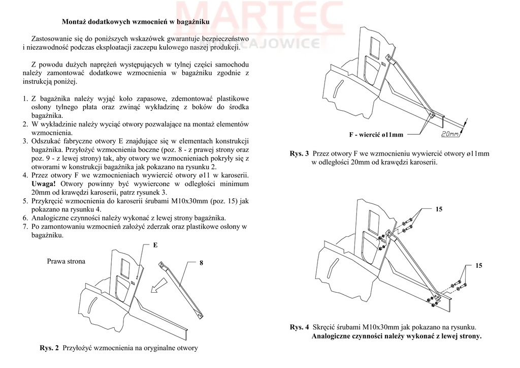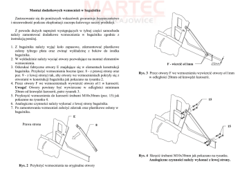MontaŜ dodatkowych wzmocnień w bagaŜniku Zastosowanie się do poniŜszych wskazówek gwarantuje bezpieczeństwo i niezawodność podczas eksploatacji zaczepu kulowego naszej produkcji. Z powodu duŜych napręŜeń występujących w tylnej części samochodu naleŜy zamontować dodatkowe wzmocnienia w bagaŜniku zgodnie z instrukcją poniŜej. 1. Z bagaŜnika naleŜy wyjąć koło zapasowe, zdemontować plastikowe osłony tylnego płata oraz zwinąć wykładzinę z boków do środka bagaŜnika. 2. W wykładzinie naleŜy wyciąć otwory pozwalające na montaŜ elementów wzmocnienia. 3. Odszukać fabryczne otwory E znajdujące się w elementach konstrukcji bagaŜnika. PrzyłoŜyć wzmocnienia boczne (poz. 8 - z prawej strony oraz poz. 9 - z lewej strony) tak, aby otwory we wzmocnieniach pokryły się z otworami w konstrukcji bagaŜnika jak pokazano na rysunku 2. 4. Przez otwory F we wzmocnieniach wywiercić otwory ø11 w karoserii. Uwaga! Otwory powinny być wywiercone w odległości minimum 20mm od krawędzi karoserii, patrz rysunek 3. 5. Przykręcić wzmocnienia do karoserii śrubami M10x30mm (poz. 15) jak pokazano na rysunku 4. 6. Analogiczne czynności naleŜy wykonać z lewej strony bagaŜnika. 7. Po zamontowaniu wzmocnień załoŜyć zderzak oraz plastikowe osłony w bagaŜniku. F - wiercić ø11mm Rys. 3 Przez otwory F we wzmocnieniu wywiercić otwory ø11mm w odległości 20mm od krawędzi karoserii. 15 E Prawa strona 8 15 Rys. 4 Skręcić śrubami M10x30mm jak pokazano na rysunku. Analogiczne czynności naleŜy wykonać z lewej strony. Rys. 2 PrzyłoŜyć wzmocnienia na oryginalne otwory INSTRUKCJA montaŜu i eksploatacji zaczepu kulowego Oznaczenie zacisku wg ISO PN 1 L 2 + 3 31 4 R 5 58R 6 54 7 58L G Łączenie przewodów Kierunkowskazy lewe Tylne światła przeciwmgłowe Masa Kierunkowskazy prawe Światła pozycyjne prawe Światła hamowania Światła pozycyjne lewe Kolejność czynności przy montaŜu 6 11 15 C 15 4 18 10 15 C 7 B 19 1 D 15 12 14 15 D 5 Rys. 1 A 14 3 13 2 Zaczep kulowy przeznaczony jest do zamontowania w samochodzie: MERCEDES 124, 4 drz., CABRIO, COUPE produkowanego od 1985 do 05.1995 r., numer katalogowy D02A i słuŜy do ciągnięcia przyczep o masie całkowitej do 1900 kg i nacisku na kulę max 75 kg. Zalecany moment skręcający dla śrub i nakrętek 8,8: M 8 - 25 Nm M 10 - 55 Nm M 12 - 85 Nm M 14 - 135 Nm 1. Zdemontować zderzak, odczepić tłumik z opasek oraz odkręcić osłonę cieplną znajdująca się nad tłumikiem. 2. Odszukać miejsca fabrycznie zapunktowane po lewej i prawej stronie podwozia a następnie wykonać otwory (poz. A i B) wiertłem ø15mm. 3. W znajdujące się po lewej i prawej stronie wnęki koła zapasowego „korytka” włoŜyć wspornik boczne (poz. 4 i 5) a następnie śrubami M12x45mm z wyposaŜenia (poz. 14) skręcić poprzez wykonane otwory (poz. A i B) z belką główną zaczepu (poz. 1), którą naleŜy przyłoŜyć od spodu samochodu. 4. Przykręcić ramię prawe (poz. 6) – w tym celu naleŜy usunąć gumową zaślepkę od spodu z podłuŜnicy w miejscu gdzie podłuŜnica wzdłuŜna styka się z podłuŜnicą poprzeczną – wsunąć ramię prawe (poz. 6) od strony bagaŜnika tak, aby otwory C wspornika poz. 4 pokryły się z otworami ramienia prawego poz. 6. Skręcić z wykorzystaniem nakładek (poz. 10 i 11). W punkcie G, przez nakładkę wywiercić otwór ø11mm, następnie skręcić śrubą M10x30mm (poz. 15) jak pokazano na rysunku 1. 5. Przykręcić ramię lewe (poz. 7) – w tym celu naleŜy usunąć gumową zaślepkę w miejscu jak po prawej stronie oraz: - przez otwory (poz. D) wspornika (poz. 5) wywiercić otwory ø11mm, - od spodu samochodu przez wywiercone otwory przykręcić ramię lewe poz. 7 śrubami M10x30mm (poz. 15), - przez pozostałe dwa otwory ramienia lewego (poz. 7) wywiercić otwory ø11mm i skręcić śrubami M10x30mm (poz. 15) jak pokazano na rysunku. 6. Zamontować osłonę cieplną, podwiesić tłumik. 7. UWAGA! Przed załoŜeniem zderzaka naleŜy zamontować wzmocnienia w bagaŜniku zgodnie z dołączoną instrukcją. 8. Do zamontowanej belki zaczepu przykręcić korpus automatu (poz. 13) śrubami M12x25mm (poz. 12) wraz z blachą pod gniazdo (poz. 3). Zamocować kulę (poz. 2) zgodnie z instrukcją dołączaną do zaczepu z końcówką szybkodemontowalną. 9. Dokręcić wszystkie śruby momentem jak podano w tabelce. 10. Podłączyć przewody z gniazdka 7- bieg. do instalacji elektrycznej zgodnie z instrukcją fabryczną samochodu (zaleca się wykonanie w ASO). 11. Uzupełnić ewentualne ubytki powłoki malarskiej zaczepu powstałe w trakcie montaŜu. OD PRODUCENTA Dziękujemy za wybór produkowanego przez naszą firmę zaczepu kulowego. Jego niezawodność została potwierdzona licznymi testami oraz opiniami zadowolonych klientów. JednakŜe niezawodność zaczepów kulowych jest zaleŜna równieŜ od prawidłowego montaŜu oraz prawidłowej eksploatacji. Z tego powodu prosimy Państwa o staranne przeczytanie niniejszej instrukcji montaŜu oraz przestrzeganie właściwych wskazówek. Zaczep naleŜy zamontować w miejscach do tego celu przeznaczonych przez producenta samochodu. UWAGA Po zamontowaniu zaczepu kulowego naleŜy uzyskać wpis w dowodzie rejestracyjnym pojazdu na "stacji kontroli pojazdów" właściwej dla miejsca zamieszkania . Samochód powinien być wyposaŜony w: -kierunkowskazy boczne, -lusterka boczne o rozstawie co najmniej szerokości przyczepy. Sprawdzać śruby mocujące zaczepu kulowego po około 1000 km przebiegu eksploatacji. Kula zaczepu musi być utrzymana w czystości i konserwowana smarem stałym. PPUH AUTO-HAK S.J. WyposaŜenie zaczepu: Produkcja Zaczepów kulowych Henryk & Zbigniew Nejman 76-200 SŁUPSK ul. Słoneczna 16K tel/fax (059) 8-414-414; 8-414-413 E-mail: [email protected] www. autohak.com.pl Zaczep kulowy bez wyposaŜenia elektrycznego Klasa: A50-X Nr kat. D02A Przeznaczony do zamontowania w samochodzie: Producent: MERCEDES Model: 124 Typ: 4 drz., C