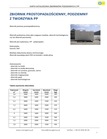 KARTA KATALOGOWA ZBIORNIKÓW PODZIEMNYCH Z PP ZBIORNIK PROSTOPADŁOŚCIENNY, PODZIEMNY Z TWORZYWA PP Zbiornik poziomy prostopadłościenny Zbiornik podziemny służy jako magazyn mediów, zbiornik technologiczny czy też zbiornik procesowy. Zbiornik jest wykonany z PP - polipropylen. Kolorystyka: Szarość, biel Możliwe dokumenty dozoru technicznego. Zbiorniki posiadają atest PZH na kontakt z woda pitną. Zastosowanie: - zbiorniki na ścieki - zbiorniki na wodę deszczową - zbiorniki na surowce, granulat, ziarno - zbiorniki na chemię - zbiorniki magazynowe - zbiorniki ppoż. - zbiorniki technologiczne Tabela wymiarów zbiorników. Pojemność 3 m 3,6 Długość (mm) 2000 Szerokość (mm) 1000 Wysokość (mm) 2000 Waga (kg) 290 5,4 3000 1000 2000 430 5,2 4000 1000 1500 410 7,2 4000 1000 2000 470 6,5 5000 1000 1500 510 9 5000 1000 2000 630 5,2 2000 2000 1500 340 7,2 2000 2000 2000 470 7,8 3000 2000 1500 450 www.maragency.pl [email protected] tel/fax: + 48 42 658 58 36 1 KARTA KATALOGOWA ZBIORNIKÓW PODZIEMNYCH Z PP 10,8 3000 2000 2000 660 10,4 4000 2000 1500 650 14,4 4000 2000 2000 770 13 5000 2000 1500 740 18 5000 2000 2000 1130 15,6 6000 2000 1500 880 21,6 6000 2000 2000 1260 9,8 3000 2500 1500 560 13,5 3000 2500 2000 630 13 4000 2500 1500 680 18 4000 2500 2000 1070 16,3 5000 2500 1500 800 22,5 5000 2500 2000 1290 19,5 6000 2500 1500 950 27 6000 2500 2000 1410 Tabela przedstawia typowe wielkości zbiorników. Praktycznie w tej technologii możliwe jest wykonanie zbiornika „na wymiar”. W szczególnych przypadkach możliwy jest montaż zbiornika na miejscu u klienta w przypadku gdy nie możliwa jest dostawa zbiornika w całości. Ceny podajemy na zapytanie email lub telefoniczne. Przy zapytaniu prosimy o podanie: - pojemności, wymiarów - medium - temperatury medium - gęstość medium - miejsca dostawy z kodem pocztowym www.maragency.pl [email protected] tel/fax: + 48 42 658 58 36 2