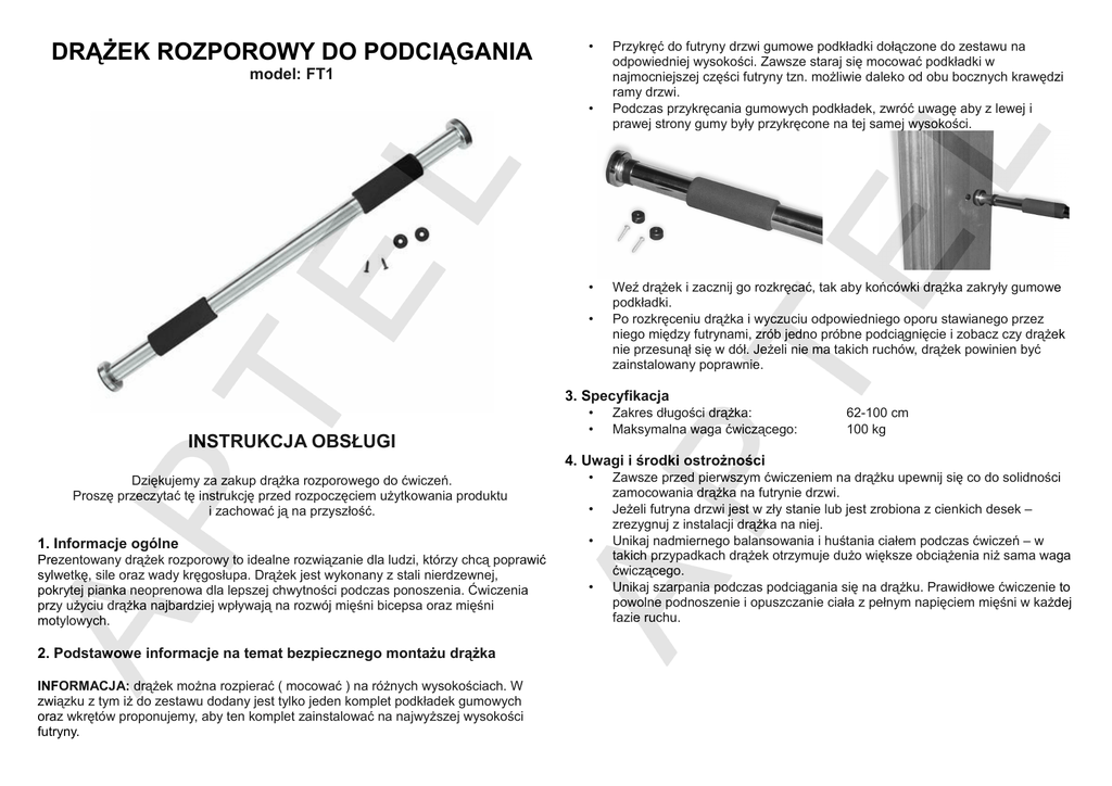 DRĄŻEK ROZPOROWY DO PODCIĄGANIA • model: FT1 • • • Przykręć do futryny drzwi gumowe podkładki dołączone do zestawu na odpowiedniej wysokości. Zawsze staraj się mocować podkładki w najmocniejszej części futryny tzn. możliwie daleko od obu bocznych krawędzi ramy drzwi. Podczas przykręcania gumowych podkładek, zwróć uwagę aby z lewej i prawej strony gumy były przykręcone na tej samej wysokości. Weź drążek i zacznij go rozkręcać, tak aby końcówki drążka zakryły gumowe podkładki. Po rozkręceniu drążka i wyczuciu odpowiedniego oporu stawianego przez niego między futrynami, zrób jedno próbne podciągnięcie i zobacz czy drążek nie przesunął się w dół. Jeżeli nie ma takich ruchów, drążek powinien być zainstalowany poprawnie. 3. Specyfikacja INSTRUKCJA OBSŁUGI • • Zakres długości drążka: Maksymalna waga ćwiczącego: 62-100 cm 100 kg 4. Uwagi i środki ostrożności Dziękujemy za zakup drążka rozporowego do ćwiczeń. Proszę przeczytać tę instrukcję przed rozpoczęciem użytkowania produktu i zachować ją na przyszłość. • • 1. Informacje ogólne • Prezentowany drążek rozporowy to idealne rozwiązanie dla ludzi, którzy chcą poprawić sylwetkę, sile oraz wady kręgosłupa. Drążek jest wykonany z stali nierdzewnej, pokrytej pianka neoprenowa dla lepszej chwytności podczas ponoszenia. Ćwiczenia przy użyciu drążka najbardziej wpływają na rozwój mięśni bicepsa oraz mięśni motylowych. • 2. Podstawowe informacje na temat bezpiecznego montażu drążka INFORMACJA: drążek można rozpierać ( mocować ) na różnych wysokościach. W związku z tym iż do zestawu dodany jest tylko jeden komplet podkładek gumowych oraz wkrętów proponujemy, aby ten komplet zainstalować na najwyższej wysokości futryny. Zawsze przed pierwszym ćwiczeniem na drążku upewnij się co do solidności zamocowania drążka na futrynie drzwi. Jeżeli futryna drzwi jest w zły stanie lub jest zrobiona z cienkich desek – zrezygnuj z instalacji drążka na niej. Unikaj nadmiernego balansowania i huśtania ciałem podczas ćwiczeń – w takich przypadkach drążek otrzymuje dużo większe obciążenia niż sama waga ćwiczącego. Unikaj szarpania podczas podciągania się na drążku. Prawidłowe ćwiczenie to powolne podnoszenie i opuszczanie ciała z pełnym napięciem mięśni w każdej fazie ruchu.