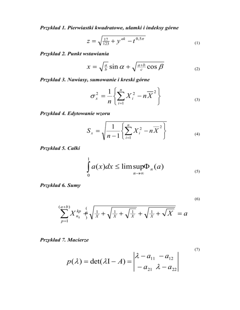 Przykład 1. Pierwiastki kwadratowe, ułamki i indeksy górne z y ak t 0,5 17 123 (1) Przykład 2. Punkt wstawiania x a b sin a b c cos (2) Przykład 3. Nawiasy, sumowanie i kreski górne 2 1 n 2 X i n X n i 1 2 x (3) Przykład 4. Edytowanie wzoru 2 1 n 2 X i n X n 1 i 1 Sx (4) Przykład 5. Całki 1 a( x)dx lim sup n 0 n (a) (5) Przykład 6. Sumy (6) ( a b ) X p 1 kp nk ( 6 ) 1 X 1 X 1 X 1 X X a Przykład 7. Macierze a11 a12 p ( ) det( A) a21 a22 (7)