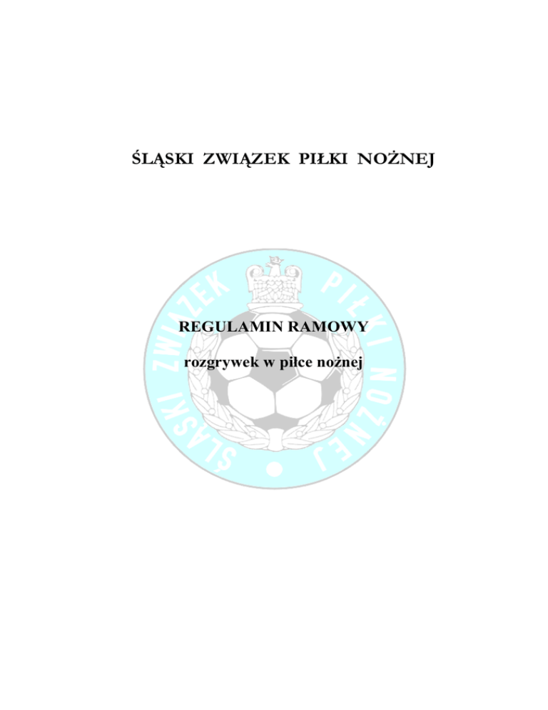 ŚLĄSKI ZWIĄZEK PIŁKI NOŻNEJ REGULAMIN RAMOWY rozgrywek w piłce nożnej ROZDZIAŁ I Postanowienia ogólne §1 Niniejszy regulamin obowiązuje wszystkich uczestników rozgrywek łącznie z osobami funkcyjnymi, klubowymi i związkowymi biorących udział w rozgrywkach mistrzowskich i o Puchar Polski organizowanych przez: 1. Śląski Związek Piłki Nożnej w Katowicach 2. Beskidzki Okręgowy Związek Piłki Nożnej w Bielsku Białej 3. Częstochowski Okręgowy Związek Piłki Nożnej w Częstochowie 4. Podokręg Śl. ZPN – Bytom 5. Podokręg Śl. ZPN – Katowice 6. Podokręg Śl. ZPN – Racibórz 7. Podokręg Śl. ZPN – Rybnik 8. Podokręg Śl. ZPN – Sosnowiec 9. Podokręg Śl. ZPN – Tychy 10. Podokręg Śl. ZPN – Zabrze 11. Podokręg Śl. ZPN – Bielsko Biała 12. Podokręg Śl. ZPN – Skoczów 13. Podokręg Śl. ZPN – Żywiec 14. Podokręg Śl. ZPN – Częstochowa 15. Podokręg Śl. ZPN – Lubliniec §2 Celem rozgrywek jest: 1. Popularyzacja piłki nożnej, organizacja współzawodnictwa sportowego jako funkcji szkoleniowo-wychowawczej w klubach województwa śląskiego oraz selekcja i promocja utalentowanych zawodników do gry w wyższych ligach i poszczególnych reprezentacjach; 2. Wyłonienie drużyn awansujących do wyższych i spadających do niższych klas rozgrywkowych; 3. Wyłonienie drużyn mistrzów województwa śląskiego w kategoriach młodzieżowych. §3 1. Kluby piłkarskie uczestniczące we współzawodnictwie sportowym mogą działać jako osoba fizyczna będąca przedsiębiorcą w rozumieniu przepisów ustawy o swobodzie działalności gospodarczej albo jako osoba prawna utworzona na podstawie przepisów zawartych w: a) Ustawie z dnia 25 czerwca 2010 o sporcie; b) Ustawie z dnia 7 kwietnia 1989 r. – prawo o stowarzyszeniach (Dz.U. z 2001 roku Nr 79 poz. 855 z późn. zmianami); c) Uchwale nr V/37 z dnia 29 września 2000 roku Zarządu PZPN o członkostwie z późn. zmianami (tekst jednolity z dnia 20 maja 2010 r. – Uchwała Nr VI/99). 2. Czasowo dopuszcza się uczestnictwo w rozgrywkach, zespołów nie będących 2 członkami Śl. ZPN a posiadających formę organizacyjną zgodną z pkt 1 lit a, b, c. §4 1. Rozgrywki prowadzone są na podstawie niniejszego regulaminu i terminarzy rozgrywek opracowanych przez Wydziały Gier Śląskiego Związku Piłki Nożnej, Okręgów i Podokręgów oraz w oparciu o: a) Statuty PZPN i Śląskiego ZPN; b) Przepisy gry w piłkę nożną; c) Uchwałę Zarządu PZPN nr IX/140 z dnia 3 i 7.07.2008 roku w sprawie organizacji rozgrywek w piłkę nożną (z późniejszymi zmianami); d) Uchwałę Zarządu PZPN nr III/39 z dnia 14.07.2006 roku w sprawie statusu zawodników, występujących w polskich klubach piłkarskich oraz zasad zmian przynależności klubowej (z późniejszymi zmianami); e) Uchwała nr 8/52 z dnia 12 lipca 2002 roku Prezydium Zarządu Polskiego Związku Piłki Nożnej dot. opłaty ryczałtowej dla klubu odstępującego za zawodników pomiędzy 23 a 28 rokiem życia; f) Uchwałę nr V/37 z dnia 29 września 2000 roku Zarządu Polskiego Związku Piłki Nożnej o członkostwie z późniejszymi zmianami (tekst jednolity) g) Regulamin Dyscyplinarny PZPN - Uchwała Walnego Zgromadzenia Sprawozdawczego PZPN z dnia 09.06.2015 r.; h) Ustawę z dnia 20.03.2009 roku o bezpieczeństwie imprez masowych (Dz. U. Nr 62, poz. 504 z późn. zm.) oraz innych właściwych powszechnie obowiązujących przepisów; i) Uchwałę nr VI/96 z dnia 19.04.2011 roku Zarządu PZPN w sprawie szczególnych zasad uzupełnienia klas rozgrywkowych w sytuacji braku uzyskania licencji przez klub; j) Uchwałę nr 13/102 z dnia 07.09.2006 roku Prezydium Zarządu PZPN w sprawie uzupełnienia składu poszczególnych klas rozgrywkowych w przypadku wycofania się drużyn lub rezygnacji z wywalczonego w sportowej rywalizacji awansu do wyższej klasy; k) Uchwałę nr VI/116 z dnia 24 czerwca 2014 roku Zarządu Polskiego Związku Piłki Nożnej w sprawie licencji trenerskich uprawniających do prowadzenia zespołów IV ligi mężczyzn, I ligi kobiet, I ligi Futsalu mężczyzn i kobiet oraz niższych lig i klas rozgrywkowych piłki nożnej seniorów, seniorek, młodzieżowych i dziecięcych; l) Uchwałę Zarządu PZPN nr VIII/197 z dnia 10 lipca 2013 roku w sprawie przyjęcia projektu unifikacji organizacji szkolenia i systemu współzawodnictwa młodzieży w Polsce; m) Uchwałę Zarządu Polskiego Związku Piłki Nożnej nr V/49 z dnia 05.04.2011 roku: „Zasady prowadzenia rozgrywek mistrzowskich seniorów III ligi i niższych klas rozgrywkowych”; n) Uchwałę Zarządu Polskiego Związku Piłki Nożnej nr VIII/121 z dnia 16.06.2011 roku z późniejszymi zmianami: „Zasady ustalania zryczałtowanego ekwiwalentu za wyszkolenie zawodnika o statusie amatora, zawodnika 3 profesjonalnego oraz zawodnika profesjonalnego, któremu klub nie zaoferował przedłużenia umowy kontraktowej”; o) Uchwałę nr VIII/191 z dnia 02.08.2012 roku Zarządu PZPN w sprawie interpretacji Uchwały nr VIII/121 z dnia 16.06.2011 - Zasady ustalenia zryczałtowanego ekwiwalentu za wyszkolenie zawodnika o statusie amatora, zawodnika profesjonalnego, któremu klub nie zaoferował przedłużenia umowy kontraktowej; p) Uchwałę nr II/12 z dnia 19 maja 2002 roku Zarządu Polskiego Związku Piłki Nożnej: „Zasady regulujące stosunki pomiędzy klubem sportowym a zawodnikiem profesjonalnym. Załącznik do typowego kontraktu o profesjonalne uprawianie piłki nożnej (umowy o pracę lub umowy cywilnoprawnej)zawartej pomiędzy zawodnikiem profesjonalnym a klubem sportowym (tekst jednolity)”; q) Uchwałą nr III/21 z dnia 26 lipca 2002 roku Zarządu PZPN „Zasady regulujące stosunki pomiędzy klubem sportowym a zawodnikiem o statusie amatora (tekst jednolity)”; r) Rozporządzenie Ministra Zdrowia z dnia 23 marca 2009 r. w sprawie zakresu koniecznych badań lekarskich, częstotliwości ich przeprowadzania oraz trybu orzekania o zdolności do uprawiania określonej dyscy