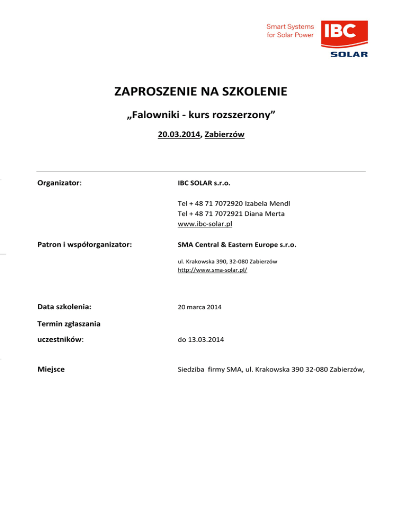 ZAPROSZENIE NA SZKOLENIE „Falowniki - kurs rozszerzony” 20.03.2014, Zabierzów Organizator: IBC SOLAR s.r.o. Tel + 48 71 7072920 Izabela Mendl Tel + 48 71 7072921 Diana Merta www.ibc-solar.pl Patron i współorganizator: SMA Central & Eastern Europe s.r.o. ul. Krakowska 390, 32-080 Zabierzów http://www.sma-solar.pl/ Data szkolenia: 20 marca 2014 Termin zgłaszania uczestników: do 13.03.2014 Miejsce Siedziba firmy SMA, ul. Krakowska 390 32-080 Zabierzów, Program szkolenia: 9:00 9:30 Prezentacja firmy SMA 9:30 10:00 Wprowadzenie do fotowoltaiki 10:00 11:00 Montowanie falowników cz. 1 11:00 11:15 Przerwa 11:15 12:15 Montowanie falowników cz. 2 12:15 13:00 Produkty SMA 13:00 13:30 Przerwa obiadowa 13:30 14:30 Produkty SMA cz. 2 14:30 15:30 Monitoring i komunikacja 15:30 16:00 Projektowanie instalacji PV Rejestracja uczestników: Prosimy o rejestrację uczestnictwa na adres mailowy: [email protected] Wymagane dane: imię i nazwisko, nazwa firma, numer telefonu i adres mailowy Cena: Bezpłatne Grupa docelowa: Szkolenie kierowane jest do wszystkich zainteresowanych, którzy zajmują się projektowaniem i montażem systemów fotowoltaicznych. ZAPRASZAMY DO UDZIAŁU
