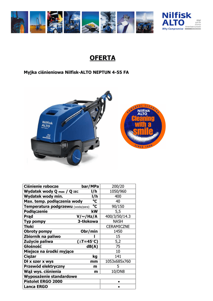 OFERTA Myjka ci nieniowa Nilfisk-ALTO NEPTUN 4-55 FA Ci nienie robocze bar/MPa Wydatek wody Q max / Q IEC l/h Wydatek wody min. l/h o Max. temp. pod czenia wody C o Temperatura podgrzewu (woda/para) C Pod czenie kW Pr d V/~/Hz/A Typ pompy 3-t okowa oki Obroty pompy Obr/min Zbiornik na paliwo l Zu ycie paliwa (∆T=45°C) no dB(A) Miejsce na rodki myj ce Ci ar kg x szer x wys mm Przewód elektryczny m wys. ci nienia m Wyposa enie standardowe Pistolet ERGO 2000 Lanca ERGO 200/20 1050/960 400 40 90/150 5,5 400/3/50/14.3 NA5H CERAMICZNE 1450 15 5,2 75 10 141 1053x685x760 5 10/DN8 • • Czytelny i funkcjonalny panel sterowniczy Wysoka si a grzewcza przy pe nym wydatku wody Bardzo wygodny dla serwisu - dotyczy przegl dów Zmi kczacz wody Miejsce na zbiornik chemii P yn antyzamar aniowy Cena katalogowa netto urz dzenia 12,010,nr. Katalogowy 107146614 Zadzwo zapytaj o cen w PROMOCJI Zalety: • Kocio EcoPower, niskie zu ycie paliwa z wysok wydajno ci grzewcz >92%, niski poziom zanieczyszcze • Silent Power, 1450 obr/min., silnik 4-biegunowy zdecydowanie redukuje poziom ha asu w porównaniu z silnikiem 2 biegunowym przed a czas pracy i ywotno pompy Nowa pompa NA5H z ceramicznymi t okami. • Quick Service, minimalne koszty przy maksymalnej atwo ci serwisowania, Redukcja czasu serwisu do 25% Nowy pistolet ERGO 2000 • Ergo System, oferuje maksymaln atwo obs ugi pistoletu, lancy, dyszy i po cze . Zdecydowanie wp ywa na atwo monta u i wymian akcesoriów. Linia Nilfisk-ALTO NEPTUNE jest przeznaczona do prac w motoryzacji, przemy le i rolnictwie. Nasze kompaktowe urz dzenia gwarantuj Klientowi maximum korzy ci. 02-830 Warszawa, ul. Mazura 18 Tel. +48 22 397 78 30 fax. +48 22 397 78 29 SPRZEDA +48 668 80 80 00 SERWIS +48 668 66 16 88 http://www.n-agroup.pl