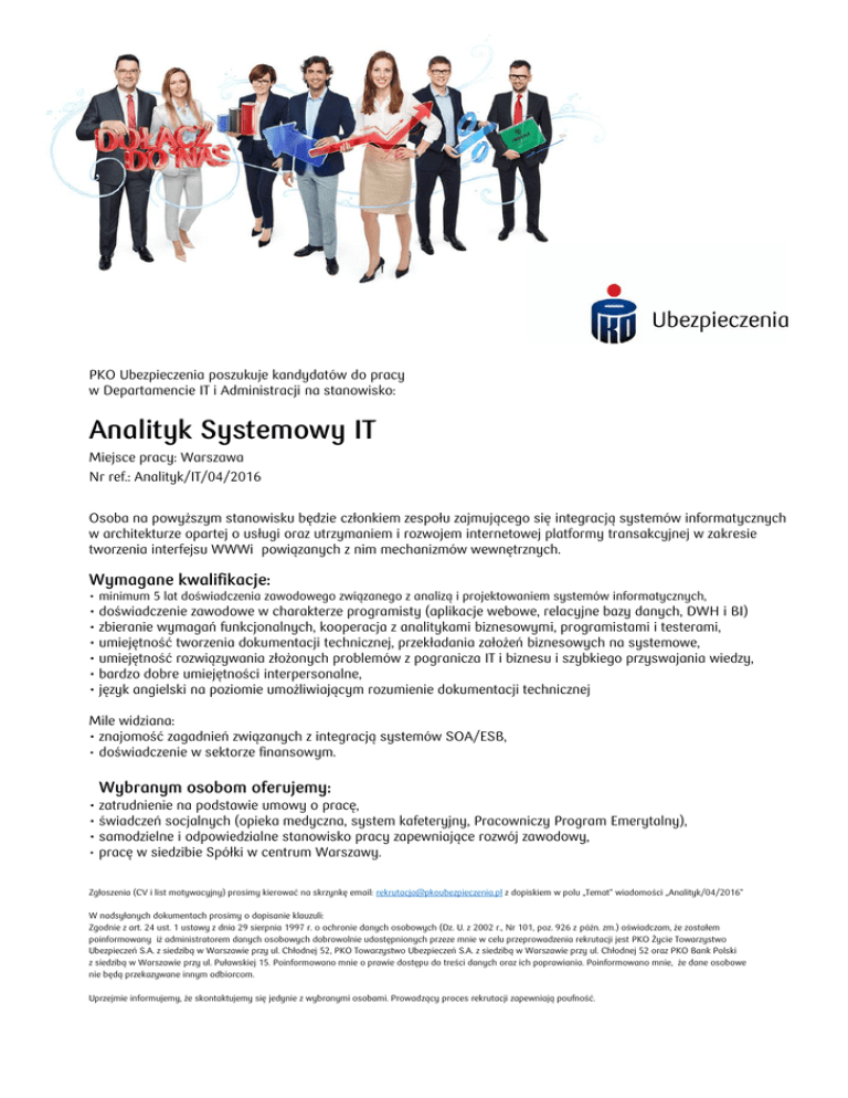 PKO Ubezpieczenia poszukuje kandydatów do pracy w Departamencie IT i Administracji na stanowisko: Analityk Systemowy IT Miejsce pracy: Warszawa Nr ref.: Analityk/IT/04/2016 Osoba na powyższym stanowisku będzie członkiem zespołu zajmującego się integracją systemów informatycznych w architekturze opartej o usługi oraz utrzymaniem i rozwojem internetowej platformy transakcyjnej w zakresie tworzenia interfejsu WWWi powiązanych z nim mechanizmów wewnętrznych. Wymagane kwalifikacje: • minimum 5 lat doświadczenia zawodowego związanego z analizą i projektowaniem systemów informatycznych, • doświadczenie zawodowe w charakterze programisty (aplikacje webowe, relacyjne bazy danych, DWH i BI) • zbieranie wymagań funkcjonalnych, kooperacja z analitykami biznesowymi, programistami i testerami, • umiejętność tworzenia dokumentacji technicznej, przekładania założeń biznesowych na systemowe, • umiejętność rozwiązywania złożonych problemów z pogranicza IT i biznesu i szybkiego przyswajania wiedzy, • bardzo dobre umiejętności interpersonalne, • język angielski na poziomie umożliwiającym rozumienie dokumentacji technicznej Mile widziana: • znajomość zagadnień związanych z integracją systemów SOA/ESB, • doświadczenie w sektorze finansowym. Wybranym osobom oferujemy: • zatrudnienie na podstawie umowy o pracę, • świadczeń socjalnych (opieka medyczna, system kafeteryjny, Pracowniczy Program Emerytalny), • samodzielne i odpowiedzialne stanowisko pracy zapewniające rozwój zawodowy, • pracę w siedzibie Spółki w centrum Warszawy. Zgłoszenia (CV i list motywacyjny) prosimy kierować na skrzynkę email: [email protected] z dopiskiem w polu „Temat” wiadomości „Analityk/04/2016” W nadsyłanych dokumentach prosimy o dopisanie klauzuli: Zgodnie z art. 24 ust. 1 ustawy z dnia 29 sierpnia 1997 r. o ochronie danych osobowych (Dz. U. z 2002 r., Nr 101, poz. 926 z późn. zm.) oświadczam, że zostałem poinformowany iż administratorem danych osobowych dobrowolnie udostępnionych przeze mnie w celu przeprowadzenia rekrutacji jest PKO Życie Towarzystwo Ubezpieczeń S.A. z siedzibą w Warszawie przy ul. Chłodnej 52, PKO Towarzystwo Ubezpieczeń S.A. z siedzibą w Warszawie przy ul. Chłodnej 52 oraz PKO Bank Polski z siedzibą w Warszawie przy ul. Puławskiej 15. Poinformowano mnie o prawie dostępu do treści danych oraz ich poprawiania. Poinformowano mnie, że dane osobowe nie będą przekazywane innym odbiorcom. Uprzejmie informujemy, że skontaktujemy się jedynie z wybranymi osobami. Prowadzący proces rekrutacji zapewniają poufność.