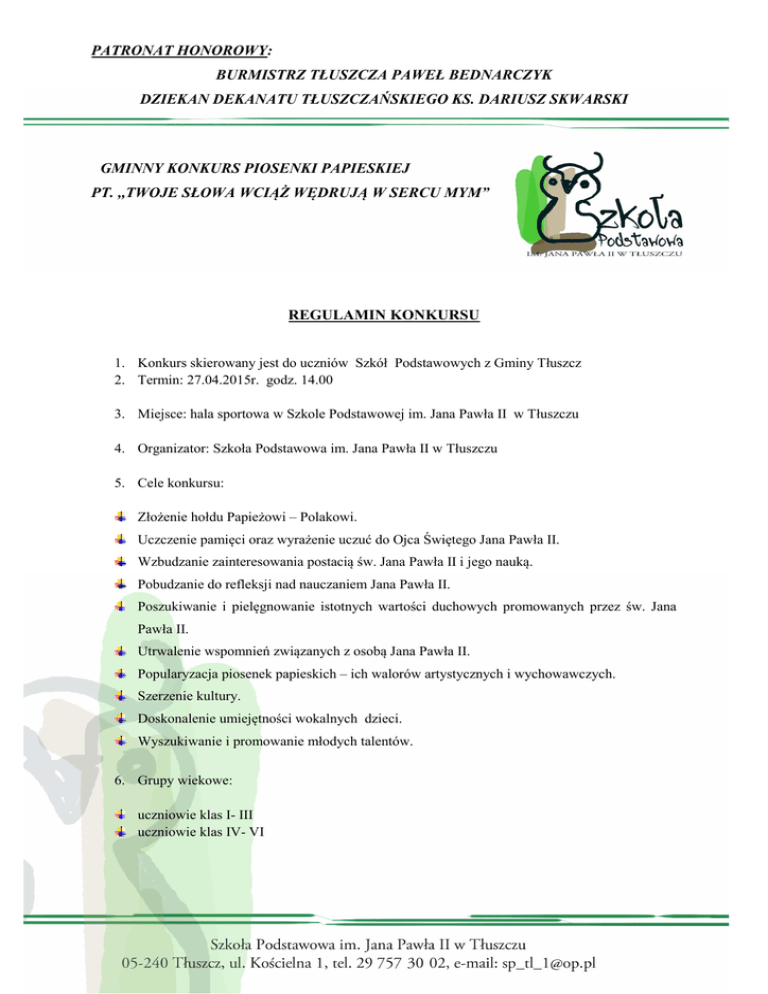 PATRONAT HONOROWY: BURMISTRZ TŁUSZCZA PAWEŁ BEDNARCZYK DZIEKAN DEKANATU TŁUSZCZAŃSKIEGO KS. DARIUSZ SKWARSKI GMINNY KONKURS PIOSENKI PAPIESKIEJ PT. ,,TWOJE SŁOWA WCIĄŻ WĘDRUJĄ W SERCU MYM” REGULAMIN KONKURSU 1. Konkurs skierowany jest do uczniów Szkół Podstawowych z Gminy Tłuszcz 2. Termin: 27.04.2015r. godz. 14.00 3. Miejsce: hala sportowa w Szkole Podstawowej im. Jana Pawła II w Tłuszczu 4. Organizator: Szkoła Podstawowa im. Jana Pawła II w Tłuszczu 5. Cele konkursu: Złożenie hołdu Papieżowi – Polakowi. Uczczenie pamięci oraz wyrażenie uczuć do Ojca Świętego Jana Pawła II. Wzbudzanie zainteresowania postacią św. Jana Pawła II i jego nauką. Pobudzanie do refleksji nad nauczaniem Jana Pawła II. Poszukiwanie i pielęgnowanie istotnych wartości duchowych promowanych przez św. Jana Pawła II. Utrwalenie wspomnień związanych z osobą Jana Pawła II. Popularyzacja piosenek papieskich – ich walorów artystycznych i wychowawczych. Szerzenie kultury. Doskonalenie umiejętności wokalnych dzieci. Wyszukiwanie i promowanie młodych talentów. 6. Grupy wiekowe: uczniowie klas I- III uczniowie klas IV- VI PATRONAT HONOROWY: BURMISTRZ TŁUSZCZA PAWEŁ BEDNARCZYK DZIEKAN DEKANATU TŁUSZCZAŃSKIEGO KS. DARIUSZ SKWARSKI 7. Założenia organizacyjne: Ilość uczestników ze szkół jest zależna od liczby dzieci w szkole. Szkołę liczącą do 200-u uczniów reprezentuje 1 uczestnik z każdej kategorii. Szkołę liczącą powyżej 200 dzieci reprezentuje po 2 uczestników z każdej kategorii, powyżej 400 - 3, a powyżej 600 – 4 uczestników z każdej kategorii. Każdy uczestnik -solista, zaprezentuje jeden utwór dotyczący św. Jana Pawła II lub wartości, których nauczał. Wykonanie może być z akompaniamentem, podkładem muzycznym lub a capella (akompaniament i podkład muzyczny nie podlegają ocenie). Uczestnicy wylosują kolejność występu. Jako pierwsi wystąpią uczniowie klas I- III, a po krótkiej przerwie uczestnicy z klas IV- VI. Organizator zapewnia nagłośnienie. 8. Ocenie niezależnego jury będą podlegały: czystość wykonanego utworu, dobór repertuaru do wieku i umiejętności dziecka, wrażenia artystyczne. 9. Dla laureatów z każdej kategorii wiekowej są przewidziane nagrody. Ogłoszenie wyników i rozdanie nagród nastąpi tego samego dnia tj. 27.04.2015r. 10. Zgłoszenia i podkłady muzyczne w formacie mp3 należy przesyłać na adres e- mail: [email protected] w nieprzekraczalnym terminie do 17.04.2015r. 11. Zgłoszenie uczestnictwa w konkursie jest jednoznaczne z przyjęciem warunków niniejszego regulaminu. 12. Sprawy nie ujęte w regulaminie oraz sporne decyzje rozstrzyga ostatecznie organizator. 13. Organizator zastrzega sobie prawo do robienia zdjęć i nagrywania oraz publikowania ich na stronie szkoły. 14. Załączniki tj. regulamin i karty zgłoszeń są dostępne na stronie szkoły www.sptluszcz.pl Wszelkie pytania proszę kierować do p. Grażyny Dąbrowskiej- Rudzińskiej pod nr tel. 692 500 655