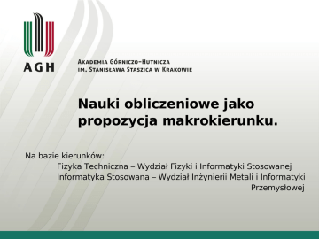 Nauki obliczeniowe jako propozycja makrokierunku. Na bazie kierunków: Fizyka Techniczna – Wydział Fizyki i Informatyki Stosowanej Informatyka Stosowana – Wydział Inżynierii Metali i Informatyki Przemysłowej Szkic • • • • • • • Motywacja Makrokierunek - wymagania Obszar kształcenia Dyscyplina nauki Doświadczenia na świecie Doświadczenia w Polsce Koncepcja makrokierunku Motywacja • Przykład: – Raport z 2009 roku: “International Assessment of Research and Development in Simulation-Based Engineering and Science” – Napisany przez panel ekspertów na zlecenie agencji rządowych USA (NSF, NASA, DOE, NIH, NIST, DOD) – Na podstawie doświadczeń amerykańskich i wizyt w kilkunastu ośrodkach na całym świecie Motywacja “Education and training of the next generation of computational scientists and engineers proved to be the number one concern at nearly all of the sites visited by the panel...” “There was grave concern, universally voiced at every site in every country including the United States, that today’s computational science and engineering students are illprepared to create and innovate the next generation of codes and algorithms...” Motywacja “Nearly universally,the panel found concern that students use codes primarily as black boxes, with only a very small fraction of students learning proper algorithm and software development... “ “Students receive no real training in software engineering for sustainable codes, and little training if any in uncertainty quantification, validation and verification, risk assessment or decision making, which is critical for multiscale simulations that bridge the gap from atoms to enterprise... “ Motywacja • Nauka i inżynieria oparte o modelowanie komputerowe stają się powszechne i konieczne • Brakuje specjalistów do kontynuacji postępu osiągniętego dotychczas • W wielu krajach mówi się o potrzebie kształcenia nowej generacji specjalistów z dziedziny stosowania symulacji komputerowych w nauce i inżynierii Motywacja • Pojawiają się nowe wyzwania – symulacje wielkiej skali – problemy wieloskalowe i sprzężone (multi-physics) – symulacje w warunkach niepewności i ryzyka – nowe architektury procesorów – wirtualna rzeczywistość – globalne zasoby obliczeniowe Motywacja • Studenci-absolwenci uczelni technicznych w Polsce są słabo przygotowani do kreatywnej i innowacyjnej pracy z programami symulacyjnymi. • Nie ma praktycznie kształcenia elitarnej grupy absolwentów, potrafiących programować, nie efektownie tylko efektywnie Makrokierunek - wymagania • Makrokierunek – obszar kształcenia stanowiący połączenie kierunków studiów o podobnych standardach • Kwalifikacje absolwenta – uwzględniające kwalifikacje kierunków składowych • Treści kształcenia uwzględniające ramowe treści kształcenia kierunków skłądowych • Nazwa – odpowiadająca obszarowi kształcenia Obszar kształcenia • Scientific computing • Computational science and engineering • Simulation based engineering and science • Informatyka stosowana • Obliczenia naukowo-techniczne • Nauki obliczeniowe • Symulacje w nauce i technice • Inżynieria obliczeniowa Obszar kształcenia • Wiedza: – matematyka: analiza, algebra, rachunek prawdopodobieństwa, statystyka – nauki przyrodnicze: fizyka, chemia, biologia – nauki techniczne: mechanika, inżynieria materiałowa, elektronika – ekonomia i finanse – informatyka: algorytmy i struktury danych, architektury komputerów Obszar kształcenia • Umiejętności: – tworzenie modeli matematycznych – projektowanie systemów informatycznych – programowanie – analiza algorytmów i metod numerycznych – konfiguracja sprzętu i oprogramowania – analiza i prezentacja wyników Dyscyplina nauki • Computational Science and Engineering • Nauki obliczeniowe • Nauka o obliczeniach Nauki Obliczeniowe 14 Przedmioty nauczania • Przedmioty matematyczne – analiza numeryczna – numeryczna algebra liniowa – optymalizacja – badania operacyjne – równania różniczkowe zwyczajne i cząstkowe – analiza funkcjonalna – rachunek prawdopodobieństwa – statystyka Przedmioty nauczania • Przedmioty informatyczne – programowanie i inżynieria oprogramowania – algorytmy i struktury danych – algorytmy i obliczenia równoległe – grafika i wizualizacja komputerowa – obliczenia wysokiej wydajności – sztuczna inteligencja – architektury systemów komputerowych – sieci komputerowe – bazy danych Przedmioty nauczania • Przykładowe dziedziny zastosowań – naukowe: fizyka, chemia, biologia, nauki o ziemi, astrofizyka – inżynierskie: mechanika, aerodynamika, inżynieria elektryczna, inżynieria jądrowa, inżynieria materiałowa,metalurgia, robotyka – ekonomiczne: finanse, statystyka Doświadczenia na świecie • Możliwości: – specjalności obliczeniowe w ramach studiów na kierunkach tradycyjnych: matematycznych, informatycznych lub w ramach dziedzin zastosowań – kształcenie na studiach drugiego i trzeciego stopnia na kierunkach poświęconych obliczeniom naukowo-technicznym – kształcenie na studiach pierwszego stopnia Doświadczenia na świecie • Obliczenia naukowo-techniczne jako specjalności w ramach kierunków tradycyjnych: – matematyka: stosowana i/lub obliczeniowa – informatyka: stosowana? – dziedziny zastosowań: fizyka obliczeniowa, chemia obliczeniowa, bioinformatyka, ekonomia obliczeniowa, mechanika obliczeniowa Doświadczenia na świecie • Program po-licencjacki CS&E w Uniwersytecie Purdue – od 1995, obecnie ok. 80 studentów – międzywydziałowy program, 17 wydziałów (oprócz typowych także np. Agronomy, Food Science, Pharmacy Practice) – dyplom w ramach wydziału przyjmującego ze specjalnością (mniejszą, minor) „Computational Science and Engineering” – zarządzanie poprzez komisję z udziałem przedstawicieli wydziałów, finansowanie z