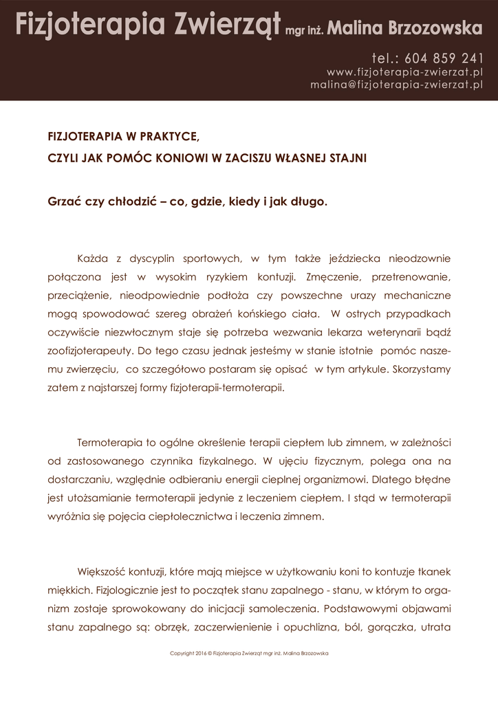 FIZJOTERAPIA W PRAKTYCE, CZYLI JAK POMÓC KONIOWI W ZACISZU WŁASNEJ STAJNI Grzać czy chłodzić – co, gdzie, kiedy i jak długo. Każda z dyscyplin sportowych, w tym także jeździecka nieodzownie połączona jest w wysokim ryzykiem kontuzji. Zmęczenie, przetrenowanie, przeciążenie, nieodpowiednie podłoża czy powszechne urazy mechaniczne mogą spowodować szereg obrażeń końskiego ciała. W ostrych przypadkach oczywiście niezwłocznym staje się potrzeba wezwania lekarza weterynarii bądź zoofizjoterapeuty. Do tego czasu jednak jesteśmy w stanie istotnie pomóc naszemu zwierzęciu, co szczegółowo postaram się opisać w tym artykule. Skorzystamy zatem z najstarszej formy fizjoterapii-termoterapii. Termoterapia to ogólne określenie terapii ciepłem lub zimnem, w zależności od zastosowanego czynnika fizykalnego. W ujęciu fizycznym, polega ona na dostarczaniu, względnie odbieraniu energii cieplnej organizmowi. Dlatego błędne jest utożsamianie termoterapii jedynie z leczeniem ciepłem. I stąd w termoterapii wyróżnia się pojęcia ciepłolecznictwa i leczenia zimnem. Większość kontuzji, które mają miejsce w użytkowaniu koni to kontuzje tkanek miękkich. Fizjologicznie jest to początek stanu zapalnego - stanu, w którym to organizm zostaje sprowokowany do inicjacji samoleczenia. Podstawowymi objawami stanu zapalnego są: obrzęk, zaczerwienienie i opuchlizna, ból, gorączka, utrata Copyright 2016 © Fizjoterapia Zwierząt mgr inż. Malina Brzozowska funkcji danej tkanki. Działania te mają spowodować usunięcie czynnika wywołującego zapalenie. Niestety jednak dość często bywa tak, że działanie tego systemu wymyka się spod kontroli i obrzęk nabiera takich rozmiarów, że stanowi rodzaj bariery, zamiast tłoczni świeżej krwi, dostarczającej tlenu i substancji odżywczych do kontuzjowanego miejsca. Taka nieodżywiona tkanka będzie miała tendencję do zwłókniania się i zabliźnienia , co w konsekwencji nie będzie korzystnie wpływało na jej funkcjonalność. Pierwszy etap kontuzji przebiega w ciągu 24h od urazu. Charakteryzuje się podwyższoną ciepłotą ciała w miejscu kontuzji, obrzękiem, bolesnością, a także często przerwaniem ciągłości skóry połączonym z krwawieniem lub wysiękiem. W tym przypadku stosujemy terapię zimnem. Ma ono spowodować zmniejszenie ciśnienia krwi w naczyniach krwionośnych, obniżyć temperaturę tkanek, obrzęk i zadziałać przeciwbólowo. chłodzących: glinki, Na wcierki, rynku znajdziemy kriożele, żel-pady, całą zimne gamę produktów opatrunki, spray'e chłodzące. Możemy zastosować również lód, zimną wodę czy najzwyklejszą mrożonkę z lodówki. Im silniejszy stan zapalny, obrzęk i ból stosujemy zimniejszą substancję. Np: po wytężonym wysiłku możemy zastosować wyłącznie glinkę, natomiast w przypadku silnego urazu mechanicznego odpowiedniejszym okaże się lód lub zamrożony żel-pad. Czas przyłożenia nie powinien przekraczać 15 - 20min, po tym czasie może dojść do ekstremalnego wychłodzenia tkanek, a w konsekwencji do ich martwicy. Możemy zatem stosować przerwy w okładach, np. co 1,5-2h. Polecam zawczasu przygotowywać sobie zmrożone żel-pady i przechowywać je np. w lodówce, tak aby w awaryjnej sytuacji nie zostać zaskoczonym. Jeżeli jednak nie mamy dostępu do wymienionych pomocy możemy po prostu posiłkować się kąpielą w rzece, zlaniem kontuzjowanego miejsca strumieniem zimnej wody z węża lub przyłożeniem butelki z lodowatą wodą. Copyright 2016 © Fizjoterapia Zwierząt mgr inż. Malina Brzozowska Następnym etapem jaki przechodzi kontuzjowane miejsce jest stan przejściowy, w którym to opuchlizna i ból zmniejszają się. W tym etapie, trwającym ok. 2-3 doby stosujemy na przemian okłady zimne i ciepłe. Okłady zimne trwające max 10min, następnie okłady ciepłe na max 5min. Obserwujemy czy opuchlizna nie powiększa się, jeśli tak, wracamy do okładów zimnych. Naprzemienne stosowanie ciepła i zimna ma na celu „przepłukanie naczyń”. Z jednej strony działamy zimnem i obniżamy obrzęk i bolesność następnie przykładamy ciepło, które podwyższa ciśnienie w naczyniach, odżywia komórki i odprowadza metabolity i CO2. Po upływie 3 doby stan zapalny przechodzi w fazę tzw. chroniczną, inaczej przewlekłą. Opuchlizna, obrzęk i bolesność w większości powinny już zaniknąć. Możemy zatem pokusić się o stosowanie mniej ingerencyjnych środków rozgrzewających, np. wcierki czy maści. Zaletą tych produktów jest też to, że często zawierają substancje lecznicze przyspieszające leczenie. Tutaj stosować możemy także okłady parafinowe lub peloidowe (borowinowe). Parafina podczas zabiegu zastygając przechodzi w stan stały. Jej cechą charakterystyczną jest duża pojemność cieplna i małe przewodnictwo, co pozwala jej długo utrzymywać ciepło. W trakcie stosowania okładów parafinowych, ciepło przenika głęboko do tkanek, podwyższając w znacznym stopniu ich temperaturę. Okłady z borowiny także fantastycznie działają termicznie na tkanki oraz powodują wzrost pocenia się i wydalenia z organizmu zbędnych produktów przemiany materii, posiadają kwasy huminowe, garbniki, żywice, woski, białka i cukry, które dodatkowo mają działanie rozluźniające, ściągające, przeciwzapalne. Pamiętamy jednak, że kiedy objawy nie mijają, koniecznie zgłośmy się do specjalisty. Zasady opisane wyżej mogą stać się nieocenione do momentu przyjazdu lekarza weterynarii lub zoofizjoterapeuty. W celu usprawnienia kuracji dodatkowo mogą oni zalecić terapię ultradźwiękami, magnetoterapię, światłolecznictwo i oczywiście masaże. Copyright 2016 © Fizjoterapia Zwierząt mgr inż. Malina Brzozowska Wskazania do terapii zimnem: - choroby narządu ruchu (stłuczenia, krwiaki i urazy tkanek miękkich bezpośrednio po urazie do 2-3 dni, obrzęki po złamaniach i zwichnięciach we wczesnym okresie, ostr