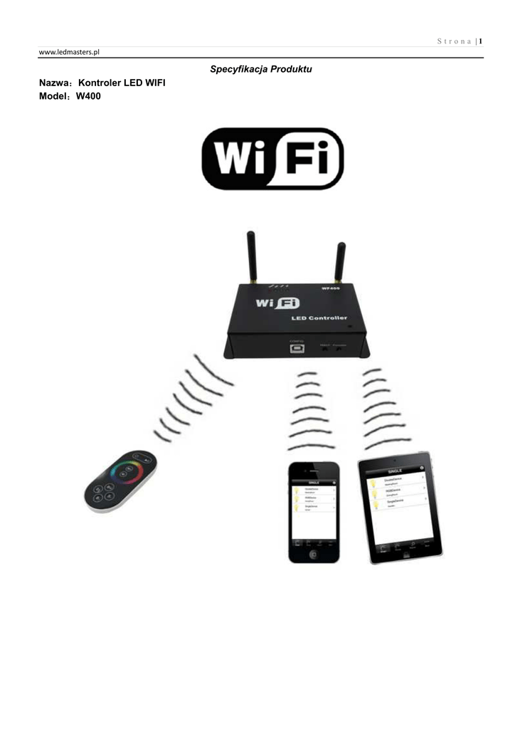 S t r o n a |1 www.ledmasters.pl Specyfikacja Produktu Nazwa:Kontroler LED WIFI Model:W400 S t r o n a |2 www.ledmasters.pl I. Opis Produktu 1. Zawartość opakowania NR. Nazwa Opis 1 Kontroler WF400 2 Dysk Kontroler odpowiedzialny za odbiór sygnału WiFi oraz kontrolę nad urządzeniami LED. Oprogramowanie, instrukcje EN, CN 3 Instrukcja Instrukcja obsługi urządzenia EN 4 Przewód USB Przewód do podłączenia z komputerem 5. Pilot radiowy Umożliwia sterowanie kontrolerem WIFI 6 Baterie Baterie zasilające pilot radiowy kontrolera WIFI 2. Kontroler WF400 WF400 jest kolejnym urządzeniem z rodziny WiFi. Opracowany technologicznie od podstaw, WF400 jest kontrolerem bardziej wydajnym, łatwiejszym w użytkowaniu oraz zarządzaniu infrastrukturą oświetleniową. W stosunku do poprzednich modeli poprawiono konfigurację połączenia sieciowego z dostępem do Internetu. Zmianie uległa również aplikacja Touch Home, która wraz z urządzeniem WF400 daje możliwość sterowania centralnego oświetleniem LED. Oprogramowanie zostało uzupełnione o wiele dodatkowych funkcji, które umożliwia optymalizację pracy pozwalając na inteligentne sterowanie oświetleniem. To wszystko sprawia, że urządzenie jest bardzo zaawansowane technologicznie. Stosowanie technologii WiFi, jest coraz bardziej powszechne, staje się coraz łatwiejsze w obsłudze dając poczucie komfortu, bezpieczeństwa oraz co ważniejsze pozwala na zarządzanie inteligentne oświetleniem. II. Parametry techniczne 1. Oprogramowanie 1.1 Parametry oprogramowania: 1. Nazwa: Touch Home 2. System: iOS, Android (iphone, ipad), urządzenie musi być wyposażone w funkcję WiFi. 3. Język: Angielski 4. Kategoria: komunikacja 5. Aplikacja darmowa. S t r o n a |3 www.ledmasters.pl 1.2 Konfiguracja kontrolera / oprogramowanie 1. Nazwa: WiFi Manager 2. System operacyjny: Win 7/Windows Vista/Win2003/WinXP/Win2000 3. Język: Angielski 4. Kategoria: Komunikacja (USB) 5. Aplikacja darmowa 2. Parametry techniczne kontrolera 1. Napięcie wejściowe: DC 5-24V 2. Temperatura pracy: -20-60 C 3. Pobór mocy: 1.6W 4. Wyjście: 3 kanały (wspólna anoda), Max. 4A/kanał z zabezpieczeniem prądowym. 5. Wymiary opakowania (dł. X szer. X wys.): 215 X 165 X 55 (mm) 6. Wymiary urządzenia (dł. X szer. X wys.): 107 X 65 X 30(mm) 7. Waga kontrolera: 340g 8. Waga pilota: 85g 9. Waga brutto: 460g 10.Obsługiwane protokoły: 802.11b/g DSSS(-5dBm) , 802.11b CCK (-10dBm) , 802.11g OFDM(-15dBm) 3. Parametry techniczne pilota: 1. 2. 3. 4. 5. 6. 7. 8. Temperatura pracy:-20-60 C Zasilanie, bateria: AAA*3 Napięcie zasilania: 1.5V*3 Pobór mocy w trakcie czuwania: 0.015mW Pobór prądu w trakcie czuwania: 3uA Pobór prądu podczas pracy: 200uA Zasięg urządzenia: do 30m Czas pracy podczas spoczynku: 6 miesięcy S t r o n a |4 www.ledmasters.pl III. Instrukcja użytkowania Właściwe użytkowanie kontrolera WF400 obejmuje następujące czynności: Krok 1:Rozpoznanie i identyfikacja interfejsów sterownika: Zapoznać się z funkcją interfejsu kontrolera, jego podstawy używania i okablowania. Zapoznaj się z instrukcją kontrolera. Krok 2: Konfigurowanie kontrolera Za pomocą WiFi Manager, można konfigurować różne parametry kontrolera: nazwę, lokalizacja sieci, itd., które ułatwiają użytkownikowi rozpoznanie urządzenia i kontrolę. Patrz instrukcja WiFi Manager. Krok 3: Instalacja kontrolera Zapoznać się ze specyfiką okablowania kontrolera oraz wymogami instalacji. Patrz instrukcja kontrolera. Krok 4: Pilot Opisuje wykorzystanie oraz funkcje pilota dotykowego. Patrz instrukcja pilota. Krok 5: Kontrola za pomocą urządzenia mobilnego. Opisuje sterowanie za pomocą urządzenia mobilnego. Patrz instrukcja Touch Home. 1. Opis interfejsu kontrolera 1.1 Opis stanu wskaźników Nr. 1 2 3 4 Wskaźnik Power WiFi Link RF Opis funkcji Wskaźnik zasilania, widoczne podczas pracy. Wskaźnik sygnału WiFi Wskaźnik połączenia z urządzeniem mobilnym. Wskaźnik połączenia z pilotem dotykowym. S t r o n a |5 www.ledmasters.pl Power: Świecący się wskaźnik zasilania oznacza prawidłowe napięcie zasilające. WiFi: Wskaźnik migający powoli oznacza prawidłowe połączenie do sieci, w przeciwnym razie miga szybko. Link: Wskaźnik miga po połączeniu z urządzeniem mobilnym, w przeciwnym razie wskaźnik jest wyłączony RF: Wskaźnik połączenia z pilotem dotykowym, w przeciwnym razie wskaźnik jest wyłączony. 1.2 Opis interfejsu 1. CONFIG Interfejs komunikacyjny do połączenia z komputerem za pomocą oprogramowania WiFi Manager. Służy do konfiguracji parametrów kontrolera, trybu pracy, sieci WiFi, nazwy urządzenia, lokalizacji urządzenia, typu wyjścia, odczytania nr seryjnego urządzenia, itd. 2. Match Przycisk służy do sparowania kontrolera z pilotem dotykowym, Należy użyć tego przycisku podczas pierwszego użycia pilota lub kiedy pilot został wymieniony na inny. 3. Function Przełącznik trybu pracy (krótkie naciśnięcie na czas 1s): przełączanie pomiędzy zaprogramowanym trybem kontrolera. ON/OFF (długie naciśniecie na czas 3s) : Włączenie/wyłączenie kontrolera. S t r o n a |6 www.ledmasters.pl 4. Input/ Output (INPUT) Wejście: V+: biegun dodatni zasilania wejściowego V-: biegun ujemny zasilania wejściowego (OUTPUT) Wyjście: V+: Biegun dodatni napięcia wyjściowego CH1: kanał wyjściowy 1 (RGB: R; CT: C; DIM: CH1) CH2: kanał wyjściowy 2 (RGB: G; CT: W; DIM: CH2) CH3: kanał wyjściowy 3 (RGB: B; CT: -; DIM: CH3) 5. ANT ANT: Antena WIFI. RF: Antena pilota dotykowego. 2. Instrukcja instalacji WiFi Manager 1. Opis Oprogramowanie konfiguracyjne WiFi Manager służy do podłączenie kontrolera z komputerem za pomocą złącza USB, używany głównie do zmiany konfiguracji sieci, modyfikowaniu właściwości urządzenia, nazwy kontrolera, zmiany sieci WiFi, informacji o kontrolerze, itd. 2. Instrukcja 2.1 Instalacja WiFi Manager Załączoną do zestawu płytę włóż do napędu i uruchom plik “WiFiManager.exe” aby zainsta