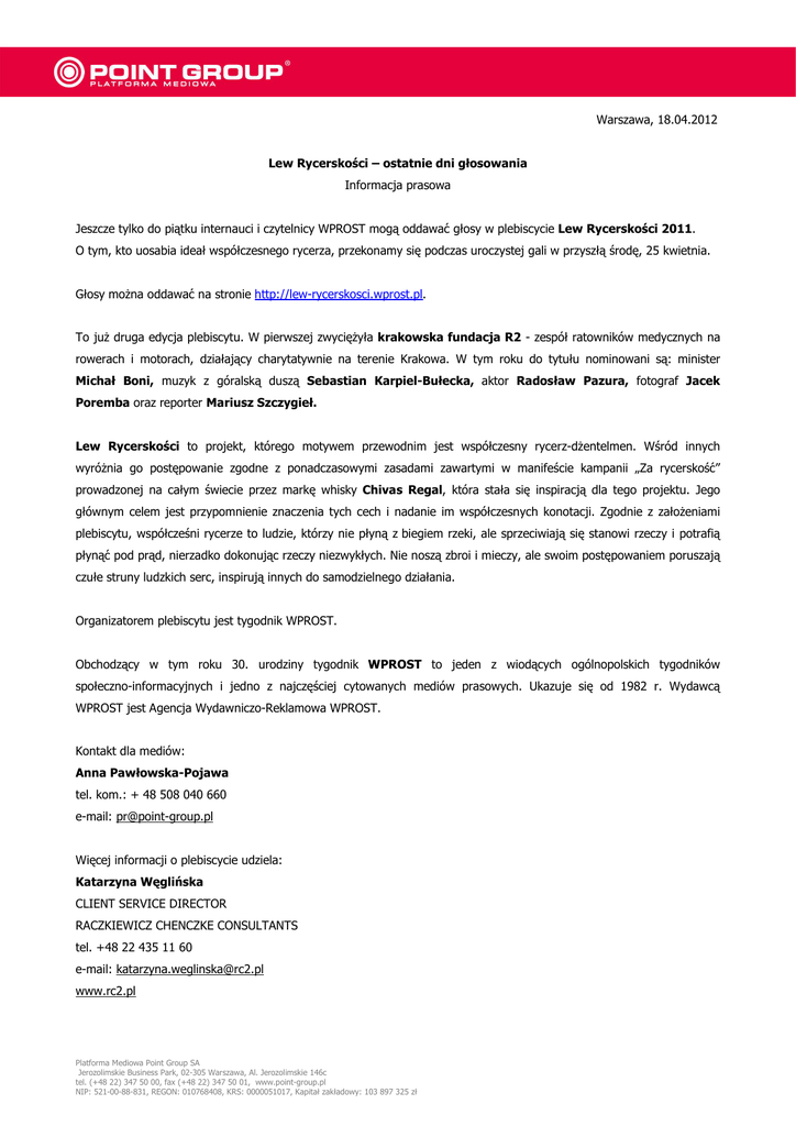 Warszawa, 18.04.2012 Lew Rycerskości – ostatnie dni głosowania Informacja prasowa Jeszcze tylko do piątku internauci i czytelnicy WPROST mogą oddawać głosy w plebiscycie Lew Rycerskości 2011. O tym, kto uosabia ideał współczesnego rycerza, przekonamy się podczas uroczystej gali w przyszłą środę, 25 kwietnia. Głosy można oddawać na stronie http://lew-rycerskosci.wprost.pl. To już druga edycja plebiscytu. W pierwszej zwyciężyła krakowska fundacja R2 - zespół ratowników medycznych na rowerach i motorach, działający charytatywnie na terenie Krakowa. W tym roku do tytułu nominowani są: minister Michał Boni, muzyk z góralską duszą Sebastian Karpiel-Bułecka, aktor Radosław Pazura, fotograf Jacek Poremba oraz reporter Mariusz Szczygieł. Lew Rycerskości to projekt, którego motywem przewodnim jest współczesny rycerz-dżentelmen. Wśród innych wyróżnia go postępowanie zgodne z ponadczasowymi zasadami zawartymi w manifeście kampanii „Za rycerskość” prowadzonej na całym świecie przez markę whisky Chivas Regal, która stała się inspiracją dla tego projektu. Jego głównym celem jest przypomnienie znaczenia tych cech i nadanie im współczesnych konotacji. Zgodnie z założeniami plebiscytu, współcześni rycerze to ludzie, którzy nie płyną z biegiem rzeki, ale sprzeciwiają się stanowi rzeczy i potrafią płynąć pod prąd, nierzadko dokonując rzeczy niezwykłych. Nie noszą zbroi i mieczy, ale swoim postępowaniem poruszają czułe struny ludzkich serc, inspirują innych do samodzielnego działania. Organizatorem plebiscytu jest tygodnik WPROST. Obchodzący w tym roku 30. urodziny tygodnik WPROST to jeden z wiodących ogólnopolskich tygodników społeczno-informacyjnych i jedno z najczęściej cytowanych mediów prasowych. Ukazuje się od 1982 r. Wydawcą WPROST jest Agencja Wydawniczo-Reklamowa WPROST. Kontakt dla mediów: Anna Pawłowska-Pojawa tel. kom.: + 48 508 040 660 e-mail: [email protected] Więcej informacji o plebiscycie udziela: Katarzyna Węglińska CLIENT SERVICE DIRECTOR RACZKIEWICZ CHENCZKE CONSULTANTS tel. +48 22 435 11 60 e-mail: [email protected] www.rc2.pl Platforma Mediowa Point Group SA Jerozolimskie Business Park, 02-305 Warszawa, Al. Jerozolimskie 146c tel. (+48 22) 347 50 00, fax (+48 22) 347 50 01, www.point-group.pl NIP: 521-00-88-831, REGON: 010768408, KRS: 0000051017, Kapitał zakładowy: 103 897 325 zł