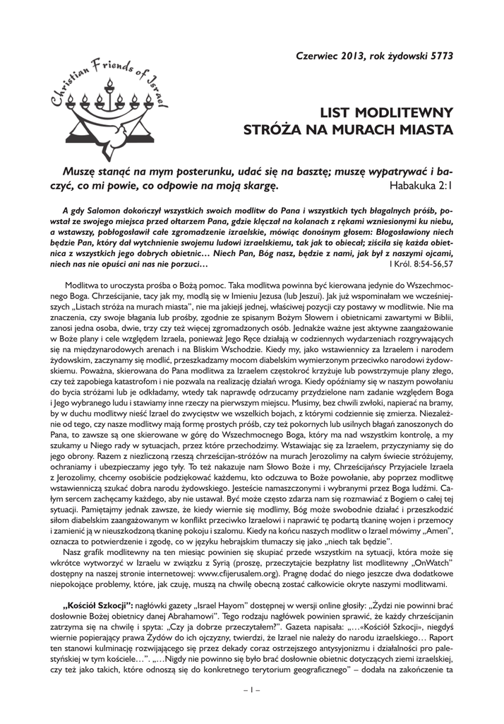 Czerwiec 2013, rok żydowski 5773 LIST MODLITEWNY STRÓŻA NA MURACH MIASTA Muszę stanąć na mym posterunku, udać się na basztę; muszę wypatrywać i baczyć, co mi powie, co odpowie na moją skargę. Habakuka 2:1 A gdy Salomon dokończył wszystkich swoich modlitw do Pana i wszystkich tych błagalnych próśb, powstał ze swojego miejsca przed ołtarzem Pana, gdzie klęczał na kolanach z rękami wzniesionymi ku niebu, a wstawszy, pobłogosławił całe zgromadzenie izraelskie, mówiąc donośnym głosem: Błogosławiony niech będzie Pan, który dał wytchnienie swojemu ludowi izraelskiemu, tak jak to obiecał; ziściła się każda obietnica z wszystkich jego dobrych obietnic… Niech Pan, Bóg nasz, będzie z nami, jak był z naszymi ojcami, niech nas nie opuści ani nas nie porzuci… I Król. 8:54-56,57 Modlitwa to uroczysta prośba o Bożą pomoc. Taka modlitwa powinna być kierowana jedynie do Wszechmocnego Boga. Chrześcijanie, tacy jak my, modlą się w Imieniu Jezusa (lub Jeszui). Jak już wspominałam we wcześniejszych „Listach stróża na murach miasta”, nie ma jakiejś jednej, właściwej pozycji czy postawy w modlitwie. Nie ma znaczenia, czy swoje błagania lub prośby, zgodnie ze spisanym Bożym Słowem i obietnicami zawartymi w Biblii, zanosi jedna osoba, dwie, trzy czy też więcej zgromadzonych osób. Jednakże ważne jest aktywne zaangażowanie w Boże plany i cele względem Izraela, ponieważ Jego Ręce działają w codziennych wydarzeniach rozgrywających się na międzynarodowych arenach i na Bliskim Wschodzie. Kiedy my, jako wstawiennicy za Izraelem i narodem żydowskim, zaczynamy się modlić, przeszkadzamy mocom diabelskim wymierzonym przeciwko narodowi żydowskiemu. Poważna, skierowana do Pana modlitwa za Izraelem częstokroć krzyżuje lub powstrzymuje plany złego, czy też zapobiega katastrofom i nie pozwala na realizację działań wroga. Kiedy opóźniamy się w naszym powołaniu do bycia stróżami lub je odkładamy, wtedy tak naprawdę odrzucamy przydzielone nam zadanie względem Boga i Jego wybranego ludu i stawiamy inne rzeczy na pierwszym miejscu. Musimy, bez chwili zwłoki, napierać na bramy, by w duchu modlitwy nieść Izrael do zwycięstw we wszelkich bojach, z którymi codziennie się zmierza. Niezależnie od tego, czy nasze modlitwy mają formę prostych próśb, czy też pokornych lub usilnych błagań zanoszonych do Pana, to zawsze są one skierowane w górę do Wszechmocnego Boga, który ma nad wszystkim kontrolę, a my szukamy u Niego rady w sytuacjach, przez które przechodzimy. Wstawiając się za Izraelem, przyczyniamy się do jego obrony. Razem z niezliczoną rzeszą chrześcijan-stróżów na murach Jerozolimy na całym świecie stróżujemy, ochraniamy i ubezpieczamy jego tyły. To też nakazuje nam Słowo Boże i my, Chrześcijańscy Przyjaciele Izraela z Jerozolimy, chcemy osobiście podziękować każdemu, kto odczuwa to Boże powołanie, aby poprzez modlitwę wstawienniczą szukać dobra narodu żydowskiego. Jesteście namaszczonymi i wybranymi przez Boga ludźmi. Całym sercem zachęcamy każdego, aby nie ustawał. Być może często zdarza nam się rozmawiać z Bogiem o całej tej sytuacji. Pamiętajmy jednak zawsze, że kiedy wiernie się modlimy, Bóg może swobodnie działać i przeszkodzić siłom diabelskim zaangażowanym w konflikt przeciwko Izraelowi i naprawić tę podartą tkaninę wojen i przemocy i zamienić ją w nieuszkodzoną tkaninę pokoju i szalomu. Kiedy na końcu naszych modlitw o Izrael mówimy „Amen”, oznacza to potwierdzenie i zgodę, co w języku hebrajskim tłumaczy się jako „niech tak będzie”. Nasz grafik modlitewny na ten miesiąc powinien się skupiać przede wszystkim na sytuacji, która może się wkrótce wytworzyć w Izraelu w związku z Syrią (proszę, przeczytajcie bezpłatny list modlitewny „OnWatch” dostępny na naszej stronie internetowej: www.cfijerusalem.org). Pragnę dodać do niego jeszcze dwa dodatkowe niepokojące problemy, które, jak czuję, muszą na chwilę obecną zostać całkowicie okryte naszymi modlitwami. „Kościół Szkocji”: nagłówki gazety „Israel Hayom” dostępnej w wersji online głosiły: „Żydzi nie powinni brać dosłownie Bożej obietnicy danej Abrahamowi”. Tego rodzaju nagłówek powinien sprawić, że każdy chrześcijanin zatrzyma się na chwilę i spyta: „Czy ja dobrze przeczytałem?”. Gazeta napisała: „…«Kościół Szkocji», niegdyś wiernie popierający prawa Żydów do ich ojczyzny, twierdzi, że Izrael nie należy do narodu izraelskiego… Raport ten stanowi kulminację rozwijającego się przez dekady coraz ostrzejszego antysyjonizmu i działalności pro palestyńskiej w tym kościele…”. „…Nigdy nie powinno się było brać dosłownie obietnic dotyczących ziemi izraelskiej, czy też jako takich, które odnoszą się do konkretnego terytorium geograficznego” – dodała na zakończenie ta –1– gazeta. „«Ziemia obiecana», o której czytamy w Biblii, nie odnosi się do miejsca, lecz stanowi metaforę tego, jak rzeczy powinny się mieć wśród ludu Bożego. Tę «ziemię obiecaną» można znaleźć, czy też stworzyć gdziekolwiek”. Jeżeli taka postawa zostanie przyjęta przez roczne walne zgromadzenie, może stać się oficjalną polityką „Kościoła Szkocji”… Według tego raportu, Nowy Testament zawiera „skrajną reinterpretację” pojęć takich jak „Izrael, świątynia, Jerozolima” i „ziemia”. Jonathan Arkush oświadczył: „Okazało się, że dokument ten wydany został bez żadnej konsultacji ze szkocką lub narodową społecznością żydowską… Jest to tendencyjny i świadczący o niewiedzy dokument wydany pod przykrywką twierdzenia teologicznego. „Kościół Szkocji” sam sobie wyrządził głęboką szkodę wydając taki dokument, nie zważając przy tym na zaufanie, szacunek i dialog – wartości, na których powinny opierać się relacje międzywyznaniowe