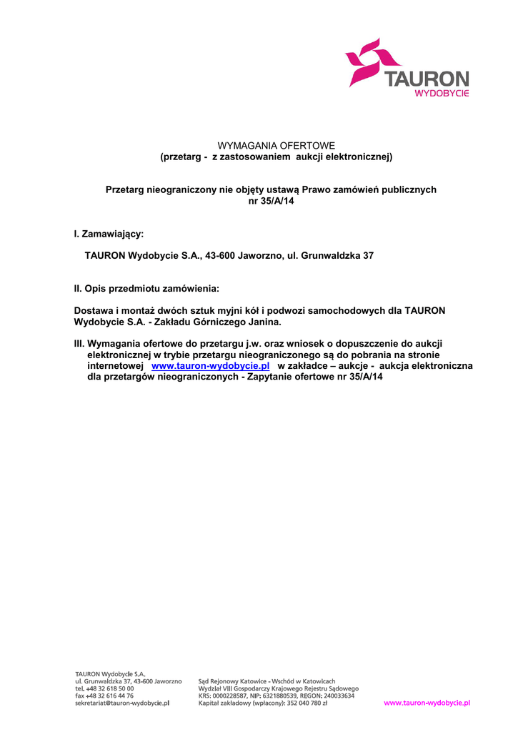 WYMAGANIA OFERTOWE (przetarg - z zastosowaniem aukcji elektronicznej) Przetarg nieograniczony nie objęty ustawą Prawo zamówień publicznych nr 35/A/14 I. Zamawiający: TAURON Wydobycie S.A., 43-600 Jaworzno, ul. Grunwaldzka 37 II. Opis przedmiotu zamówienia: Dostawa i montaż dwóch sztuk myjni kół i podwozi samochodowych dla TAURON Wydobycie S.A. - Zakładu Górniczego Janina. III. Wymagania ofertowe do przetargu j.w. oraz wniosek o dopuszczenie do aukcji elektronicznej w trybie przetargu nieograniczonego są do pobrania na stronie internetowej www.tauron-wydobycie.pl w zakładce – aukcje - aukcja elektroniczna dla przetargów nieograniczonych - Zapytanie ofertowe nr 35/A/14