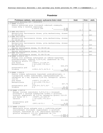 Kosztorys kanalizacji deszczowej i muru oporowego przy drodze powiatowej Nr 1788K w m.Sosnowice strona nr: v1.1 Przedmiar Podstawa nakładu, opis pozycji, wyliczenie ilości robót Ilość Krot. Jedn. 1 Kanalizacja deszczowa CPV - 45232130-2 1.1 KNNR 1/111/1 Roboty pomiarowe przy liniowych robotach ziemnych, trasa dróg w terenie równinnym 0.520+0.160 = 0.68 0.68 1.2 KNR 201/101/1 Mechaniczne karczowanie drzew, piłą mechaniczną, drzewo Fi·10-15·cm 1.3 KNR 201/101/2 Mechaniczne karczowanie drzew, piłą mechaniczną, drzewo Fi·16-25·cm 1.4 KNR 201/101/3 Mechaniczne karczowanie drzew, piłą mechaniczną, drzewo Fi·26-35·cm 1.5 KNR 201/102/4 Ręczne karczowanie drzew, Fi·36-45·cm 1.6 KNR 201/102/5 Ręczne karczowanie drzew, Fi·46-55·cm 1.7 KNR 201/102/7 Ręczne karczowanie drzew, Fi·66-75·cm 1.8 KNNR 1/210/3 (2) Wykopy oraz przekopy wykonywane na odkład koparkami podsiębiernymi, koparka 0,25-0,60, głębokość do 3·m, kategoria gruntu III-IV pod kanał ((932*1.1)+(29.5* mechanicznie 1.4)+(105.7*0.5))* 0,5 = 559.675 poszerzenia pod studnię ((39+1.5)*1.6)*0.5 = 32.4 592.075 1.9 KNNR 1/202/6 Roboty ziemne wykonywane koparkami podsiębiernymi, z transportem urobku samochodami samowyładowczymi na odległość do 1·km, koparka 0,40 m3, kategoria gruntu III-IV pod kanał ((932*1.1)+(29.5* mechanicznie 1.4)+(105.7*0.5))* 0,4 = 447.74 poszerzenia pod ((39.0+1.5)*1.6)* studnie 0.4 = 25.92 473.66 1.10 KNNR 1/307/4 Wykopy liniowe szerokości 0,8-2,5·m o ścianach pionowych z ręcznym wydobyciem urobku w gruntach suchych, głębokości do 3,0·m, kategoria gruntu III-IV pod kanał 10 % ((932*1.1)+(29.5* ręcznie 1.4)+(105.7*0.5))* 0,1 = 111.935 poszerzenia pod studnie (39*1.6)*0.1 = 6.24 118.175 1.11 KNNR 1/313/4 Umocnienie ścian wykopów wraz z rozbiórką palami szalunkowymi stalowymi (wypraskami) w gruntach suchych, szerokość do 1·m, umocnienie ażurowe w gruncie kategorii III-IV, głębokość do 3·m 680*1.48 = 1 006.4 1 006.4 ~0.7 km 8 szt 5 szt 4 szt 3 szt 5 szt 1 szt ~592.1 m3 ~473.7 m3 ~118.2 m3 ~1 006 m2 1 Kosztorys kanalizacji deszczowej i muru oporowego przy drodze powiatowej Nr 1788K w m.Sosnowice strona nr: v1.1 Podstawa nakładu, opis pozycji, wyliczenie ilości robót 1.12 KNNR 1/313/8 Umocnienie ścian wykopów wraz z rozbiórką palami szalunkowymi stalowymi (wypraskami) w gruntach suchych, dodatek za każdy dalszy rozpoczęty 1·m szerokości wykopu, umocnienie ażurowe w gruncie kategorii III-IV, głębokość do 3·m 1006 = 1 006.0 1 006.0 1.13 KNNR 4/1411/2 Podłoża pod kanały i obiekty z materiałów sypkich, grubość 15·cm pod kanał 315 651*0,5*0,15 = 48.825 pod kanał 500 29.5*0.7*0.15 = 3.0975 51.9225 1.14 KNNR 4/1308/5 Kanały z rur typu PVC - U SN8 łączone na wcisk, Fi·315·mm 518.5+151.5-19 = 651.0 651.0 1.15 KNNR 4/1308/7 Kanały z rur typu PVC - U SN10 łączone na wcisk, Fi·500·mm 10.5+19 = 29.5 29.5 1.16 KNNR 5/113/2 Rury ochronne, PVC-U 160 mm 1.5+1.5+1.5+1.5+ 1.5 = 7.5 7.5 1.17 KNNR 4/1413/1 (1) Studnie rewizyjne z kręgów betonowych w gotowym wykopie, Fi·1000·mm, głębokość 3·m 24+1 = 25.0 25.0 1.18 KNNR 4/1413/2 Studnie rewizyjne z kręgów betonowych w gotowym wykopie, Fi·1000·mm, za każde 0,5·m różnicy głębokości 41+24+2 = 67.0 67.0 1.19 KNNR 4/1423/2 Kominy włazowe z kręgów betonowych, Fi·1000·mm 24+1 = 25.0 25.0 1.20 KNR 228/501/9 (1) Obsypka rurociągu kruszywem dowiezionym, piasek kanał 315 651*1,1*0,65-651* 3,14*0,315*0,315 = 262.635209 kanał 500 29.5*1.4*0.8529.5*3.14*0.5*0.5 = 11.9475 274.582709 1.21 KNNR 1/318/2 Zasypywanie wykopów szerokości 0,8-2,5·m o ścianach pionowych, głębokość do 1,5·m, kategoria gruntu III-IV wykop całkowity / kanał + studnie / 1184 = 1 184.0 wyrównanie terenu do rzędnej projektowanej 89.3 = 89.3 minus = podłoża pod kanał -51.9 = -51.9 obsybka kanału -274.6 = -274.6 kanał -(651*3.14*0.3* 0.3)+(29.5*3.14* 0.5*0.5) = -160.8151 studnie -(25*(3,14*0,9* 0,9*1,45)) = -92.19825 693.78665 Ilość Krot. Jedn. ~1 006 m2 ~51.9 m3 ~651 m ~29.5 m ~7.5 m ~25 szt ~67 -1.00 0.5 m ~25 m ~274.6 m3 ~693.8 m3 2 Kosztorys kanalizacji deszczowej i muru oporowego przy drodze powiatowej Nr 1788K w m.Sosnowice strona nr: v1.1 Podstawa nakładu, opis pozycji, wyliczenie ilości robót 1.22 KNNR 1/202/6 Roboty ziemne wykonywane koparkami podsiębiernymi, z transportem urobku samochodami samowyładowczymi na odległość do 1·km, koparka 0,40 m3, kategoria gruntu III-IV - odwóz nadmiaru ziemi wykopy-materiał odwieziony w czasie 1184+89.3-473.7wykopów-zasyp 693.8 = 105.8 105.8 1.23 KNR 201/205/1 Roboty ziemne koparkami podsiębiernymi z transportem urobku samochodami samowyładowczymi do 1·km, koparka 0,15·m3, grunt kategorii I-II 20*1,5 = 30.0 30.0 1.24 KNR 211/404/1 (2) Wykonanie podsypek, grubość 5·cm, wykonanie z brzegu, pospółka 15*2.4 = 36.0 36.0 1.25 KNR 211/411/1 Wykonanie ubezpieczenia płytami ażurowymi typu "Krata" o wymiarach 90x60x10·cm (0,6+0,9*2)*15 = 36.0 36.0 1.26 KNR 211/524/2 Wbijanie kołków Fi·4-6·cm, głębokość wbicia 0,80·m, grunt kategorii III 64*2 = 128.0 128.0 1.28 KNR 231/204/3 Nawierzchnie z tłucznia kamiennego, warstwa dolna z tłucznia, grubość warstwy po uwałowaniu 10·cm uzupełnienie ubytków pobocza 670*0.3 = 201.0 201.0 1.29 KNNR 1/503/5 Plantowanie (obrobienie na czysto), skarpy i korona nasypów, kategoria gruntu I-III 1.5*690 = 1 035.0 1 035.0 Ilość Krot. Jedn. ~105.8 m3 ~30.0 m3 ~36.0 m2 ~36.0 m2 ~128.0 szt ~201.0 m2 ~1 035.0 m2 3 Kosztorys kanalizacji deszczowej i muru oporowego przy drodze powiatowej Nr 1788K w m.Sosnowice strona nr: v1.1 Podstawa nakładu, opis pozycji, wyliczenie ilości robót Ilość Krot. Jedn. 2 Przekroczenia zjazdów CPV - 45232130-2 2.1 KNNR 5/721/1 Cięcie nawierzchni mechanicznie, z mas mineralno-asfaltowych, głębokość 5·cm (8*2)+(9*2) = 34.0 34.0 2.2 KNNR 5/721/2 Cięcie nawierzchni mechanicznie, z mas mineralno-asfaltowych, dodatek za każdy następny 1·cm głębokości (ponad 5) 2.