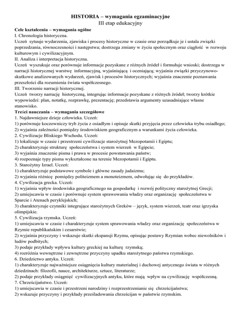 HISTORIA – wymagania egzaminacyjne III etap edukacyjny Cele kształcenia – wymagania ogólne I. Chronologia historyczna. Uczeń sytuuje wydarzenia, zjawiska i procesy historyczne w czasie oraz porządkuje je i ustala związki poprzedzania, równoczesności i następstwa; dostrzega zmiany w życiu społecznym oraz ciągłość w rozwoju kulturowym i cywilizacyjnym. II. Analiza i interpretacja historyczna. Uczeń wyszukuje oraz porównuje informacje pozyskane z różnych źródeł i formułuje wnioski; dostrzega w narracji historycznej warstwę informacyjną, wyjaśniającą i oceniającą; wyjaśnia związki przyczynowoskutkowe analizowanych wydarzeń, zjawisk i procesów historycznych; wyjaśnia znaczenie poznawania przeszłości dla rozumienia świata współczesnego. III. Tworzenie narracji historycznej. Uczeń tworzy narrację historyczną, integrując informacje pozyskane z różnych źródeł; tworzy krótkie wypowiedzi: plan, notatkę, rozprawkę, prezentację; przedstawia argumenty uzasadniające własne stanowisko. Treści nauczania – wymagania szczegółowe 1. Najdawniejsze dzieje człowieka. Uczeń: 1) porównuje koczowniczy tryb życia z osiadłym i opisuje skutki przyjęcia przez człowieka trybu osiadłego; 2) wyjaśnia zależności pomiędzy środowiskiem geograficznym a warunkami życia człowieka. 2. Cywilizacje Bliskiego Wschodu. Uczeń: 1) lokalizuje w czasie i przestrzeni cywilizacje starożytnej Mezopotamii i Egiptu; 2) charakteryzuje strukturę społeczeństwa i system wierzeń w Egipcie; 3) wyjaśnia znaczenie pisma i prawa w procesie powstawania państw; 4) rozpoznaje typy pisma wykształcone na terenie Mezopotamii i Egiptu. 3. Starożytny Izrael. Uczeń: 1) charakteryzuje podstawowe symbole i główne zasady judaizmu; 2) wyjaśnia różnicę pomiędzy politeizmem a monoteizmem, odwołując się do przykładów. 4. Cywilizacja grecka. Uczeń: 1) wyjaśnia wpływ środowiska geograficznego na gospodarkę i rozwój polityczny starożytnej Grecji; 2) umiejscawia w czasie i porównuje system sprawowania władzy oraz organizację społeczeństwa w Sparcie i Atenach peryklejskich; 3) charakteryzuje czynniki integrujące starożytnych Greków – język, system wierzeń, teatr oraz igrzyska olimpijskie. 5. Cywilizacja rzymska. Uczeń: 1) umiejscawia w czasie i charakteryzuje system sprawowania władzy oraz organizację społeczeństwa w Rzymie republikańskim i cesarstwie; 2) wyjaśnia przyczyny i wskazuje skutki ekspansji Rzymu, opisując postawy Rzymian wobec niewolników i ludów podbitych; 3) podaje przykłady wpływu kultury greckiej na kulturę rzymską; 4) rozróżnia wewnętrzne i zewnętrzne przyczyny upadku starożytnego państwa rzymskiego. 6. Dziedzictwo antyku. Uczeń: 1) charakteryzuje najważniejsze osiągnięcia kultury materialnej i duchowej antycznego świata w różnych dziedzinach: filozofii, nauce, architekturze, sztuce, literaturze; 2) podaje przykłady osiągnięć cywilizacyjnych antyku, które mają wpływ na cywilizację współczesną. 7. Chrześcijaństwo. Uczeń: 1) umiejscawia w czasie i przestrzeni narodziny i rozprzestrzenianie się chrześcijaństwa; 2) wskazuje przyczyny i przykłady prześladowania chrześcijan w państwie rzymskim. 8. Arabowie i świat islamski. Uczeń: 1) umiejscawia w czasie i przestrzeni kierunki i zasięg podbojów arabskich; 2) opisuje podstawowe zasady i symbole islamu; 3) wyjaśnia rolę Arabów w przekazywaniu dorobku kulturowego pomiędzy Wschodem a Zachodem. 9. Początki cywilizacji zachodniego chrześcijaństwa. Uczeń: 1) umiejscawia w czasie i przestrzeni monarchię Karola Wielkiego, Państwo Kościelne oraz Cesarstwo w Europie Zachodniej; 2) charakteryzuje działalność Karola Wielkiego i wyjaśnia, na czym polegał renesans karoliński; 3) charakteryzuje główne idee uniwersalnego cesarstwa Ottona III; 4) opisuje relacje pomiędzy władzą cesarską a papieską w X-XI w. 10. Bizancjum i Kościół wschodni. Uczeń: 1) lokalizuje w czasie i przestrzeni cesarstwo bizantyjskie; 2) charakteryzuje rolę Bizancjum jako kontynuatora cesarstwa rzymskiego i rozpoznaje osiągnięcia kultury bizantyjskiej (prawo, architektura, sztuka); 3) wyjaśnia przyczyny i skutki rozłamu w Kościele w XI w. 11. Społeczeństwo średniowiecznej Europy. Uczeń: 1) rozpoznaje typowe instytucje systemu lennego; 2) wyjaśnia pojęcie stanu i charakteryzuje podziały społeczne w średniowieczu; 3) charakteryzuje funkcje gospodarcze, polityczne i kulturowe miast w średniowieczu. 12. Kultura materialna i duchowa łacińskiej Europy. Uczeń: 1) wyjaśnia kulturotwórczą rolę Kościoła w dziedzinie nauki, architektury, sztuki i życia codziennego średniowiecznego społeczeństwa; 2) porównuje główne elementy kultury rycerskiej i kultury miejskiej; 3) rozpoznaje zabytki kultury średniowiecza, wskazując różnice pomiędzy stylem romańskim a stylem gotyckim, z uwzględnieniem przykładów z własnego regionu. 13. Polska pierwszych Piastów. Uczeń: 1) sytuuje w czasie i przestrzeni państwo pierwszych Piastów; 2) wskazuje, na przykładzie państwa pierwszych Piastów, charakterystyczne cechy monarchii patrymonialnej; 3) wyjaśnia okoliczności przyjęcia chrztu przez Piastów oraz następstwa kulturowe, społeczne i polityczne chrystianizacji Polski; 4) ocenia dokonania pierwszych Piastów w dziedzinie polityki, gospodarki i kultury. 14. Polska dzielnicowa i zjednoczona. Uczeń: 1) sytuuje w czasie i przestrzeni Polskę okresu rozbicia dzielnicowego; 2) opisuje postanowienia statutu Bolesława Krzywoustego; 3) porządkuje i sytuuje w czasie najważniejsze wydarzenia związane z relacjami polsko-krzyżackimi w epoce Piastów; 4) opisuje zmiany społeczno-gospodarcze w epoce rozbicia dzielnicowego i dostrzega związki pomiędzy rozwojem ruchu osadniczego a ożywieniem gospodarczym; 5) ocenia dokonania Kazimierza Wielkiego w dziedzinie polityki wewnętrznej (system obronny, urbanizacja kraju, prawo, nauka) oraz w polityce