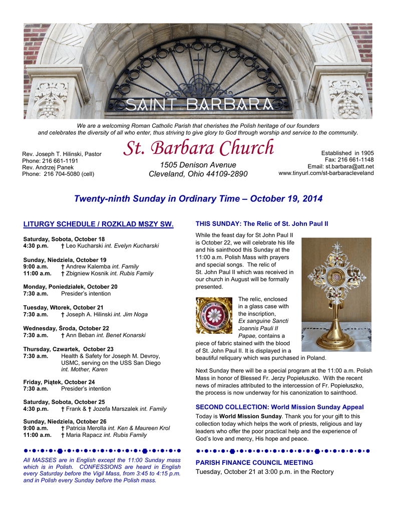 We are a welcoming Roman Catholic Parish that cherishes the Polish heritage of our founders and celebrates the diversity of all who enter, thus striving to give glory to God through worship and service to the community. Rev. Joseph T. Hilinski, Pastor Phone: 216 661-1191 Rev. Andrzej Panek Phone: 216 704-5080 (cell) St. Barbara Church 1505 Denison Avenue Cleveland, Ohio 44109-2890 Established in 1905 Fax: 216 661-1148 Email: [email protected] www.tinyurl.com/st-barbaracleveland Twenty-ninth Sunday in Ordinary Time – October 19, 2014 LITURGY SCHEDULE / ROZKLAD MSZY SW. Saturday, Sobota, October 18 4:30 p.m. † Leo Kucharski int. Evelyn Kucharski Sunday, Niedziela, October 19 9:00 a.m. † Andrew Kalemba int. Family 11:00 a.m. † Zbigniew Kosnik int. Rubis Family Monday, Poniedziałek, October 20 7:30 a.m. Presider’s intention Tuesday, Wtorek, October 21 7:30 a.m. † Joseph A. Hilinski int. Jim Noga Wednesday, Środa, October 22 7:30 a.m. † Ann Beban int. Benet Konarski Thursday, Czwartek, October 23 7:30 a.m. Health & Safety for Joseph M. Devroy, USMC, serving on the USS San Diego int. Mother, Karen THIS SUNDAY: The Relic of St. John Paul II While the feast day for St John Paul II is October 22, we will celebrate his life and his sainthood this Sunday at the 11:00 a.m. Polish Mass with prayers and special songs. The relic of St. John Paul II which was received in our church in August will be formally presented. The relic, enclosed in a glass case with the inscription, Ex sanguine Sancti Joannis Pauli II Papae, contains a piece of fabric stained with the blood of St. John Paul II. It is displayed in a beautiful reliquary which was purchased in Poland. Friday, Piątek, October 24 7:30 a.m. Presider’s intention Next Sunday there will be a special program at the 11:00 a.m. Polish Mass in honor of Blessed Fr. Jerzy Popiełuszko. With the recent news of miracles attributed to the intercession of Fr. Popiełuszko, the process is now underway for his canonization to sainthood. Saturday, Sobota, October 25 4:30 p.m. † Frank & † Jozefa Marszalek int. Family SECOND COLLECTION: World Mission Sunday Appeal Sunday, Niedziela, October 26 9:00 a.m. † Patricia Merolla int. Ken & Maureen Krol 11:00 a.m. † Maria Rapacz int. Rubis Family Today is World Mission Sunday. Thank you for your gift to this collection today which helps the work of priests, religious and lay leaders who offer the poor practical help and the experience of God’s love and mercy, His hope and peace. All MASSES are in English except the 11:00 Sunday mass which is in Polish. CONFESSIONS are heard in English every Saturday before the Vigil Mass, from 3:45 to 4:15 p.m. and in Polish every Sunday before the Polish mass. PARISH FINANCE COUNCIL MEETING Tuesday, October 21 at 3:00 p.m. in the Rectory OD KS. ANDRZEJA … Prayer List Please pray for our parishioners who are ill and all who are in need of our prayers: Henry Arslanian, Phyllis Bobko Loretta Budzinski, Donna Cuevas, Donald Friedl Irene Heruminek, Eleanor Hodel Dorothy Noga, Kelli Shea, Doris Wojton Dora Wotowiec, Jeanette Woznicki Share Your Blessings An Update from the Social Concerns Committee We have received a letter from the Brookside Center acknowledging our contributions for September. We donated approximately $380 worth of food which helped 856 families. Our $80 worth of school supplies helped 197 children. September marked the end of our year-long Share Your Blessings partnership with Brookside. As we wrap up the year, we will be presenting a summary of our activities and a look at our plans for the year to come. Thank you for generously Sharing Your Blessings with others! THE COUNT IS IN … We counted the people present at all of the masses for the weekends of October 5 and 12 to get an average. Our average weekend total attendance was 168. This was a little higher than last year’s average of 160. Our current number of registered households is 179 (292 individually registered parishioners.) This is a good time to remind anyone who has not registered to please do so. There are forms available on the table at the side entrance (parking lot entrance) or ask one of the ushers for a copy. MODLITWA O WYPROSZENIE LASK ZA WSTAWIENNICTWEM SW.JANA PAWLA II Swiety Janie Pawle II, za Twoim posrednictwem prosze o laski dla mnie I moich bliskich. Wierze w moc mojej modlitwy I w Twoja zbawienna pomoc. Wypros mi u Boga Wszechmogacego laski o ktore pokornie prosze… / nalezy wymienic prosby / Upros mi tez dar umocnienia mojej wiary,nadzie I milosci. Panie Jezu Chryste,Ty obiecales,ze jesli o cokolwiek w Twoje Imie poprosimy, to otrzymamy. Dlatego I ja, Panie, pelen ufnosci, prosze Cie o potrzebne mi laski, za wstawiennictwem sw. Jana Pawla II. Wysluchaj mnie, Panie! Amen. MODLITWA W INTENCJI KANONIZACJI KS. JERZEGO POPIELUSZKI Boze, zrodlo wszelkiego dobra,dziekuje Ci, ze w swojej milosci obdarzyles blogoslawionego ks. Jerzego godnoscia kaplanstwa. Poslales Go, aby gorliwie glosil Twoje slowo, szafowal swietymi sakramentami, meznie dzialal w Twoje imie i zawsze byl blisko kazdego czlowieka wzywajac do przebaczenia, jednosci I pokoju. Ty obdarzyles Go laska meczenstwa, przez co upodobnil sie do Chrystusa na drodze krzyzowej. Uwielbiamy i dziekujemy Tobie Panie, za ten wielki dar dla Kosciola, szczegolnie za to, ze uczyniles Go posrednikiem w rozdawnictwie lask. W swoim nieskonczonym milosierdziu racz zaliczyc Go w poczet swietych, a mnie za Jego wstawiennictwem udziel laski…/ wymienic laske jakiej potrzebuje / o ktora z ufnoscia Ciebie prosze. Przez Chrystusa Pana naszego . 3x – Chwala Ojcu… Blogoslawiony Ks. Jerzy – modl sie za name PRAYER FOR THE INTERCESSION OF ST. JOHN PAUL II The generosity of our Parishioners & Friends has brought St. Barbara Church the following: Collection Oct. 11-12 - $1,554 (87 envelopes) Maintenance Fund - $325 (15 envelopes) Thank you! Dziękuję bardzo! O Blessed Trinity, we thank you for having graced the Church with Saint John 