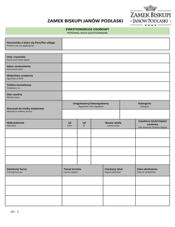 ZAMEK BISKUPI JANÓW PODLASKI KWESTIONARIUSZ OSOBOWY PERSONAL DATA QUESTIONNAIRE Stanowisko o które się Pani/Pan ubiega Position you are applying for Imię i nazwisko Name and Family Name Adres zamieszkania Permanent adres Wiek/Data urodzenia Age/Date of birth Telefon kontaktowy Telephone no Stan cywilny Marital status Uregulowany/nieuregulowny Katergoria Regulated / Not regulated Category Stosunek do służby wojskowej Attitude to military service Wykształcenie Education od od Nazwa szkoły from to School name Uzyskany tytuł/stopień naukowy Title obtainde /Science degree Szkolenia/ kursy Temat kursów Uzyskany tytuł Data ukończenia Traning/Courses Course subject Degree obtained Date of completion str. 1 KWESTIONARIUSZ OSOBOWY PERSONAL DATA QUESTIONNAIRE Znajomość języków obcych Knowledge of foreign languages Język Language 4 - swobodna z bardzo nielicznymi błędami 3 - dość swobodna ale z błędami 2 - możliwość komunikacji z licznymi błędami 1 - podstawowa / bierna 4 - fluent with few mistakes 3 - quite fluent with mistakes 2- communicative but with many mistakes 1 - bacis/passive W mowie W piśmie W czytaniu Certyfikat - nazwa Speaking Writing Reading Certificate – name Systemy operacyjne Edytor teksów Text editors Arkusze kalkulacyjne Baza danych Spread sheets Data base Operation systems Znajomość obsługi komputera Computer skills Inne umiejętności Other skills Przebieg kariery zawodowej Work Experience * proszę podać w kolejności od aktulanego do pierwszego miejsca zatrudnienia (w odwrotnej kolejności chronologicznej), przedstawiając stanowiska zajmowane w firmie, jak i (ewentualnie) w innych zakładach pracy * specify your work places in chronological order (from present to the first one) and positions held both within the same and previous companies Okres zatrudnienia od - do Nazwa zakładu pracy Stanowisko Zakres obowiązków Employment period from - to Name of work place Position held Range of duties str. 2 Powód i tryb rozwiąznia stosunku pracy Reason of finishing KWESTIONARIUSZ OSOBOWY PERSONAL DATA QUESTIONNAIRE Zainteresowania/Hobby Interests/hobby W jakim systemie mógłby Pan/Pani podjąć pracę? Na zmiany W porze nocnej On shifts At night W soboty i święta Saturdays and holidays W systemie 12 godzinnym 12- hours shifts (* proszę zaznaczyć krzyżykiem właściwe opcje) In what kind of system can you work? (* please indicate possible option with a cross) Proszę określić minimalny poziom wynagrodzenia, jakiego Pan/Pani oczekuje (brutto) Please, indicate the minimum salary you expect (gross) Od kiedy jest Pan/Pani w stanie rozpocząć pracę? (proszę podać ewentualny okres wypowiedzenia w obecnym miejscu pracy) When are you able to start working? ( please indicate possible period of notice) Imię i nazwisko osoby udzielającej referencji / stanowisko – nazwa firmy Referencje References Numer telefonu Name and family name of person giving references Telephone no Dziekujęmy za wypełnienie kwestionariusza Thank you very much for completing the questionnaire Hotel zastrzega rozpatrywanie tylko kwestionariuszy, które są kompletnie wypełnione. Hotel zastrzega sobie prawo do kontaktu z wybranymi kandydatami. Wyrażam zgodę na przetwarzanie moich danych osobowych zawartych w mojej ofercie dla potrzeb niezbędnych do realizacji procesu rekrutacji przez.........................................................................................( zgodnie z Ustawą z dnia 29.08.1997 o ochronie danych osobowych D.U. nr 133 pozycja 883). I give my assent to process my personal data included it the application which will be indispensable in process of recruitment executed by ......................................................................................( in accordance with the Law on Personal Data Protection D.U. Nr 133 item 883) from 29.08.1997. ……………………………………………………………………………………… (Data i podpis kandydata) (Date and candidate's signature) Wypełniony kwestionariusz prosimy przesłać na DWA adresy : [email protected] , [email protected] Oferty pracy poszukiwanych pracowników będą pojawiać się również na stronie : www.facebook.com/zamekjanowpodlaski str. 3 str. 4