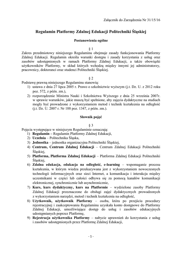Załącznik do Zarządzenia Nr 31/15/16 Regulamin Platformy Zdalnej Edukacji Politechniki Śląskiej Postanowienia ogólne §1 Zakres przedmiotowy niniejszego Regulaminu obejmuje zasady funkcjonowania Platformy Zdalnej Edukacji. Regulamin określa warunki dostępu i zasady korzystania z usług oraz zasobów udostępnionych w ramach Platformy Zdalnej Edukacji, a także obowiązki użytkowników Platformy, w skład których wchodzą między innymi jej administratorzy, pracownicy, doktoranci oraz studenci Politechniki Śląskiej. §2 Podstawę prawną niniejszego Regulaminu stanowią: 1) ustawa z dnia 27 lipca 2005 r. Prawo o szkolnictwie wyższym (j.t. Dz. U. z 2012 roku poz. 572, z późn. zm.), 2) rozporządzenie Ministra Nauki i Szkolnictwa Wyższego z dnia 25 września 2007r. w sprawie warunków, jakie muszą być spełnione, aby zajęcia dydaktyczne na studiach mogły być prowadzone z wykorzystaniem metod i technik kształcenia na odległość (j.t. Dz. U. 2007 r. Nr 188 poz. 1347, z późn. zm.). Słownik pojęć §3 Pojęcia występujące w niniejszym Regulaminie oznaczają: 1) Regulamin – Regulamin Platformy Zdalnej Edukacji, 2) Uczelnia – Politechnika Śląska, 3) Jednostka – jednostka organizacyjna Politechniki Śląskiej, 4) Centrum, Centrum Zdalnej Edukacji – Centrum Zdalnej Edukacji Politechniki Śląskiej, 5) Platforma, Platforma Zdalnej Edukacji – Platforma Zdalnej Edukacji Politechniki Śląskiej, 6) Zdalna edukacja, edukacja na odległość, e-learning – wspomaganie procesu kształcenia, w którym wiedza przekazywana jest z wykorzystaniem nowoczesnych technologii informacyjnych oraz sieci Internet, a komunikacja i interakcja między uczestnikami w części lub całości odbywa się za pomocą kanałów komunikacji elektronicznej, synchronicznie lub asynchronicznie, 7) Kurs, kurs dydaktyczny, kurs na Platformie – wydzielone zasoby Platformy Zdalnej Edukacji przeznaczone do obsługi zajęć dydaktycznych prowadzonych z wykorzystaniem narzędzi, metod i technik kształcenia na odległość, 8) Użytkownik, użytkownik Platformy – osoba, która po przejściu procedury rejestracyjnej i zaakceptowaniu Regulaminu uzyskała konto dostępowe do Platformy Zdalnej Edukacji, umożliwiające dostęp do usług i zasobów edukacyjnych udostępnianych poprzez Platformę, 9) Rejestracja użytkownika Platformy – nabycie uprawnień do korzystania z usług i zasobów udostępnionych przez Platformę Zdalnej Edukacji, -1- 10) Konto, konto dostępowe – wpis w bazie danych Platformy, zawierający podstawowe informacje o Użytkowniku (tzn. nazwę użytkownika, hasło dostępowe oraz podstawowe dane tworzące profil użytkownika), potwierdzający rejestrację użytkownika i nabycie uprawnień do korzystania z usług i zasobów udostępnionych przez Platformę Zdalnej Edukacji, 11) Administrator platformy – osoba uprawniona przez Centrum do zarządzania wszystkimi zasobami Platformy Zdalnej Edukacji, 12) Administrator lokalny – osoba wyznaczona przez kierownika jednostki oraz uprawniona przez Centrum do zarządzania fragmentem zasobów Platformy Zdalnej Edukacji przydzielonym danej jednostce, 13) Administrator kursu – osoba uprawniona przez administratora platformy lub administratora lokalnego do administrowania i zarządzania wybranym kursem dydaktycznym udostępnionym przez Platformę Zdalnej Edukacji, którego zwykle jest autorem. Platforma Zdalnej Edukacji §4 1. Platforma Zdalnej Edukacji to system informatyczny wspomagający i umożliwiający prowadzenie zajęć dydaktycznych z wykorzystaniem metod i technik kształcenia na odległość. 2. Operatorem Platformy Zdalnej Edukacji jest Centrum Zdalnej Edukacji, sprawujące nadzór techniczny nad jej funkcjonowaniem. 3. Szczegółowe zasady funkcjonowania i warunki korzystania z Platformy Zdalnej Edukacji określa Centrum w utworzonym do tego celu Regulaminie. Jednostki korzystające z Platformy Zdalnej Edukacji §5 1. Centrum Zdalnej Edukacji świadczy usługi w dziedzinie zdalnej edukacji innym jednostkom organizacyjnym Uczelni, za pośrednictwem Platformy Zdalnej Edukacji. 2. Kierownik jednostki może powołać swojego pełnomocnika ds. zdalnej edukacji, którego zadaniem będzie prowadzenie i koordynacja wszelkich spraw związanych z przygotowaniem, wprowadzaniem i funkcjonowaniem kształcenia zdalnego prowadzonego przez daną jednostkę. 3. Kierownik jednostki zainteresowanej korzystaniem z usług świadczonych przez Platformę Zdalnej Edukacji może wystąpić z wnioskiem do Centrum o udostępnienie zasobów Platformy na potrzeby prowadzonych przez jednostkę zajęć dydaktycznych, z wykorzystaniem metod i technik kształcenia na odległość. 4. We wniosku kierownik jednostki wskazuje osobę oddelegowaną do pełnienia roli administratora lokalnego przydzielonych jednostce zasobów Platformy. 5. Jeśli nie ma formalnych przeszkód, Centrum przygotowuje wymagane zasoby Platformy przeznaczone dla danej jednostki, a gdy ten proces zostanie zakończony, informuje kierownika jednostki o przyznanych i udostępnionych jednostce zasobach Platformy. 6. Centrum organizuje szkolenie dla nowo powołanego administratora lokalnego. 7. Po pozytywnym zaliczeniu szkolenia, administrator Platformy na polecenie dyrektora Centrum oddelegowuje część uprawnień administratorowi lokalnemu umożliwiającą -2- samodzielne zarządzanie przydzielonymi jednostce zasobami Platformy Zdalnej Edukacji. 1. 2. 3. 4. 5. §6 Od momentu przekazania uprawnień administrator lokalny przejmuje pełną odpowiedzialność za funkcjonowanie przydzielonych jednostce zasobów Platformy. Administrator lokalny może udostępnić swoje uprawnienia do zarządzania przydzielonymi jednostce zasobami Platformy innym osobom, tylko i wyłącznie za zgodą dyrektora Centrum, na wniosek kierownika jednostki. Do głównych zadań administratora lokalnego należy: 1) rejestracja nowych użytkowników, 2) zakładanie nowych kursów dydaktycznych, 3) nadawanie uprawni