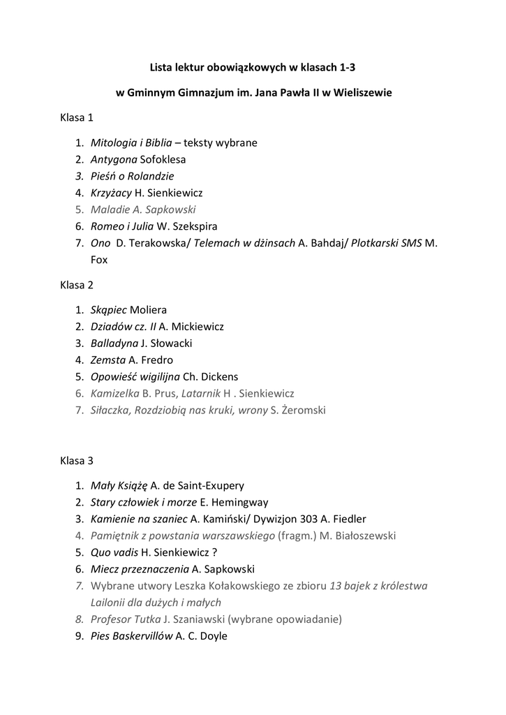 Lista lektur obowiązkowych w klasach 1-3 w Gminnym Gimnazjum im. Jana Pawła II w Wieliszewie Klasa 1 1. 2. 3. 4. 5. 6. 7. Mitologia i Biblia – teksty wybrane Antygona Sofoklesa Pieśń o Rolandzie Krzyżacy H. Sienkiewicz Maladie A. Sapkowski Romeo i Julia W. Szekspira Ono D. Terakowska/ Telemach w dżinsach A. Bahdaj/ Plotkarski SMS M. Fox Klasa 2 1. 2. 3. 4. 5. 6. 7. Skąpiec Moliera Dziadów cz. II A. Mickiewicz Balladyna J. Słowacki Zemsta A. Fredro Opowieść wigilijna Ch. Dickens Kamizelka B. Prus, Latarnik H . Sienkiewicz Siłaczka, Rozdziobią nas kruki, wrony S. Żeromski Klasa 3 1. 2. 3. 4. 5. 6. 7. Mały Książę A. de Saint-Exupery Stary człowiek i morze E. Hemingway Kamienie na szaniec A. Kamiński/ Dywizjon 303 A. Fiedler Pamiętnik z powstania warszawskiego (fragm.) M. Białoszewski Quo vadis H. Sienkiewicz ? Miecz przeznaczenia A. Sapkowski Wybrane utwory Leszka Kołakowskiego ze zbioru 13 bajek z królestwa Lailonii dla dużych i małych 8. Profesor Tutka J. Szaniawski (wybrane opowiadanie) 9. Pies Baskervillów A. C. Doyle