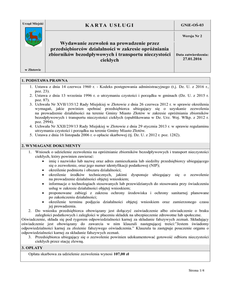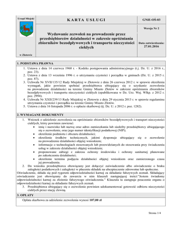 Urząd Miejski K A R TA U S Ł U G I GNiE-OŚ-03 Wersja Nr 2 Wydawanie zezwoleń na prowadzenie przez przedsiębiorców działalności w zakresie opróżniania zbiorników bezodpływowych i transportu nieczystości ciekłych Data zatwierdzenia: 27.01.2016 w Złotowie 1. PODSTAWA PRAWNA 1. Ustawa z dnia 14 czerwca 1960 r. - Kodeks postępowania administracyjnego (t.j. Dz. U. z 2016 r., poz. 23). 2. Ustawa z dnia 13 września 1996 r. o utrzymaniu czystości i porządku w gminach (Dz. U. z 2015 r. poz. 87). 3. Uchwała Nr XVII/135/12 Rady Miejskiej w Złotowie z dnia 26 czerwca 2012 r. w sprawie określenia wymagań, jakie powinien spełniać przedsiębiorca ubiegający się o uzyskanie zezwolenia na prowadzenie działalności na terenie Gminy Miasto Złotów w zakresie opróżniania zbiorników bezodpływowych i transportu nieczystości ciekłych (opublikowana w Dz. Urz. Woj. Wlkp. z 2012 r. poz. 2994). 4. Uchwała Nr XXII/239/13 Rady Miejskiej w Złotowie z dnia 29 stycznia 2013 r. w sprawie regulaminu utrzymania czystości i porządku na terenie Gminy Miasto Złotów. 5. Ustawa z dnia 16 listopada 2006 r. o opłacie skarbowej (tj. Dz. U. z 2012 r. poz. 1282). 2. WYMAGANE DOKUMENTY 1. Wniosek o udzielenie zezwolenia na opróżnianie zbiorników bezodpływowych i transport nieczystości ciekłych, który powinien zawierać: imię i nazwisko lub nazwę oraz adres zamieszkania lub siedziby przedsiębiorcy ubiegającego się o zezwolenie, oraz jego numer identyfikacji podatkowej (NIP); określenie podmiotu i obszaru działalności; określenie środków technicznych, jakimi dysponuje ubiegający się o zezwolenie na prowadzenie działalności objętej wnioskiem; informacje o technologiach stosowanych lub przewidzianych do stosowania przy świadczeniu usług w zakresie działalności objętej wnioskiem; proponowane zabiegi z zakresu ochrony środowiska i ochrony sanitarnej planowane po zakończeniu działalności; określenie terminu podjęcia działalności objętej wnioskiem oraz zamierzonego czasu jej prowadzenia. 2. Do wniosku przedsiębiorca obowiązany jest dołączyć zaświadczenie albo oświadczenie o braku zaległości podatkowych i zaległości w płaceniu składek na ubezpieczenie zdrowotne lub społeczne. Oświadczenie, składa się pod rygorem odpowiedzialności karnej za składanie fałszywych zeznań. Składający oświadczenie jest obowiązany do zawarcia w nim klauzuli następującej treści:”Jestem świadomy odpowiedzialności karnej za złożenie fałszywego oświadczenia.” Klauzula ta zastępuje pouczenie organu o odpowiedzialności karnej za składanie fałszywych zeznań. 3. Przedsiębiorca ubiegający się o zezwolenie powinien udokumentować gotowość odbioru nieczystości ciekłych przez stację zlewną. 3. OPŁATY Opłata skarbowa za udzielenie zezwolenia wynosi 107,00 zł Strona 1/4 Urząd Miejski K A R TA U S Ł U G I GNiE-OŚ-03 Wersja Nr 2 Wydawanie zezwoleń na prowadzenie przez przedsiębiorców działalności w zakresie opróżniania zbiorników bezodpływowych i transportu nieczystości ciekłych Data zatwierdzenia: 27.01.2016 w Złotowie 53,50 zł – opłata skarbowa za kontynuację działalności lub rozszerzenie warunków udzielonego zezwolenia(tj. 50% stawki określonej od wpisu). Opłata skarbowa pobierana jest także w przypadku ewentualnego pisemnego upoważnienia (pełnomocnictwa) udzielnego osobie działającej w imieniu właściciela nieruchomości zgodnie z ustawą z dnia 16 listopada 2006 r. o opłacie skarbowej – od złożenia dokumentu stwierdzającego udzielenie pełnomocnictwa lub prokury albo jego odpisu, wypisu lub kopii – 17,00 zł Opłatę skarbową należy wnieść z chwilą złożenia wniosku. Opłatę należy wnieść: bezpośrednio w kasie Urzędu Miejskiego w Złotowie w godzinach: poniedziałek od 8:00 do 15:00 od wtorku do czwartku od 8:00 do 14:00 piątek od 8:00 do 13:00 bezpośrednio w Spółdzielczym Banku Ludowym w Złotowie, al. Piasta 46 w godzinach: od poniedziałku do piątku od 8:15 do 15:30 we wtorek od 8:15 do 16:00 bezpośrednio w Spółdzielczym Banku Ludowym Filia w Złotowie, al. Mickiewicza 24 w godzinach: od poniedziałku do piątku od 9:15 do 17:00 bezpośrednio w Spółdzielczym Banku Ludowym w Złotowie Punkt kasowy, ul. Dworzaczka 4 w godzinach: od poniedziałku do piątku od 9:30 do 17:00 bądź przelewem na rachunek bankowy w Spółdzielczym Banku Ludowym w Złotowie o numerze: 96 8941 0006 0016 4975 2000 0010 W przypadku wnoszenia opłaty na rachunek bankowy urzędu, w tytule przelewu należy określić czynność podlegającą opłacie. Zwalnia się od opłaty skarbowej: pod warunkiem wzajemności państwa obce, ich przedstawicielstwa dyplomatyczne, urzędy konsularne i siły zbrojne, międzynarodowe organizacje i instytucje oraz ich oddziały i przedstawicielstwa, korzystające na podstawie ustaw, umów lub powszechnie uznanych zwyczajów międzynarodowych z przywilejów i immunitetów, a także członków ich personelu i inne osoby zrównane z nimi, jeżeli nie są one obywatelami polskimi i nie maja miejsca stałego pobytu na terytorium Rzeczypospolitej Polskiej, jednostki budżetowe, jednostki samorządu terytorialnego, organizacje pożytku publicznego, jeżeli składają podania, występują z wnioskiem o dokonanie czynności urzędowej lub z wnioskiem o wydanie zaświadczenia lub zezwolenia, bądź wystawiają dokumenty – wyłącznie w związku z nieodpłatną działalnością pożytku publicznego w rozumieniu Strona 2/4 Urząd Miejski K A R TA U S Ł U G I GNiE-OŚ-03 Wersja Nr 2 Wydawanie zezwoleń na prowadzenie przez przedsiębiorców działalności w zakresie opróżniania zbiorników bezodpływowych i transportu nieczystości ciekłych Data zatwierdzenia: 27.01.2016 w Złotowie przepisów, o działalności pożytku publicznego i o wolontariacie, osoby, które dokonując zgłoszenia lub składając wniosek o dokonanie czynności urzędowej albo wniosek o wydanie zaświadczenia lub zez