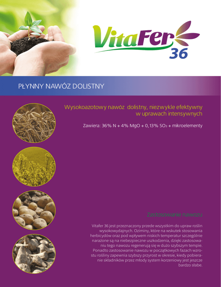 PŁYNNY NAWÓZ DOLISTNY Wysokoazotowy nawóz dolistny, niezwykle efektywny w uprawach intensywnych Zawiera: 36% N + 4% MgO + 0,13% SO3 + mikroelementy Zastosowanie nawozu Vitafer 36 jest przeznaczony przede wszystkim do upraw roślin wysokowydajnych. Oziminy, które na wskutek stosowania herbicydów oraz pod wpływem niskich temperatur szczególnie narażone są na niebezpieczne uszkodzenia, dzięki zastosowaniu tego nawozu regenerują się w dużo szybszym tempie. Ponadto zastosowanie nawozu w początkowych fazach wzrostu rośliny zapewnia szybszy przyrost w okresie, kiedy pobieranie składników przez młody system korzeniowy jest jeszcze bardzo słabe. Charakterystyka działania • Natychmiastowe włączenie azotu we wszystkie procesy życiowe rośliny, dzięki wysokiej zawartości wszystkich form azotu: azotanowej, amonowej i amidowej • Intensywny wzrost masy zielonej roślin oraz ułatwiona produkcja węglowodanów (cukrów roślinnych), dzięki zawartości łatwo przyswajalnego magnezu, który jest ważnym składnikiem chlorofilu odpowiadającego za proces fotosyntezy • Efektywniejsza przemiana azotu w białko ogólne, poprawa jakości plonu oraz zwiększone działanie azotu i magnezu w roślinie, dzięki podwyższonej zawartości aktywującego fotosyntezę manganu • Poprawiona przyswajalność składników mineralnych oraz mieszalność ze środkami ochrony roślin, dzięki odczynowi zbliżonemu do obojętnego oraz systemowi buforowemu Efekty stosowania • • • • • Większa wysokość i poprawa jakości plonu Wysoki poziom produkcji cukrów, węglowodanów i białek przez rośliny Większa zawartość skrobi w bulwach ziemniaków Większa zawartość cukru w korzeniach buraków cukrowych Większa zawartość białka i glutenu w zbożach Dawki i terminy stosowania Uprawa Dawka l/ha Zboża 5 Rzepak Buraki cukrowe Kukurydza Ziemniaki Strączkowe Warzywa gruntowe 5 5 5 5 5 5 Drzewa i krzewy owocowe 5 3 – 4 zabiegi: jesienią – jeden zabieg od fazy 3 liści; wiosną – 2 – 3 zabiegi po ruszeniu wegetacji do końca fazy kłoszenia 2 zabiegi: po ruszeniu wegetacji do początku kwitnienia 3 zabiegi: od fazy 3 – 4 liści do zwarcia międzyrzędzi 1 – 2 zabiegi: w fazie 6 – 8 liści 3 zabiegi: 2 – 3 tygodnie po wschodach, w odstępach 10 – 14 dni 2 zabiegi: w okresie intensywnego wzrostu 2 – 3 zabiegi: o fazy drugiego liścia (lub 2 tygodnie po wysadzeniu) do zbiorów, w odstępach 8 – 10 dni 2 zabiegi: na początku wegetacji oraz w okresie intensywnego wzrostu MAKROELEMENTY % wagi % obj. Azot (N) całkowity, w tym Azot azotanowy (NO3) Azot amonowy (NH4) Azot amidowy (NH2) Magnez (MgO) Siarka (SO3) 27 36 5 4 18 3 0,10 7 5 24 4 0,13 MIKROELEMENTY % wagi % obj. 0,010 0,194 0,020 1,000 0,001 0,005 0,013 0,260 0,027 1,340 0,001 0,006 Bor (B) Miedź (Cu) Żelazo (Fe) Mangan (Mn) Molibden (Mo) Cynk (Zn) Mikroelementy chelatowane EDTA oraz całkowicie rozpuszczalne w wodzie. Gęstość 1,34 kg/l, pH 5,5 – 6,5 Liczba zabiegów i terminy stosowania ANTYODPAROWYWACZE HUMEKTANTY ŚRODKI SURFAKTANTY CHELATOWANIE MIESZALNOŚĆ ZWIĘKSZAJĄCE EDTA ZE ŚRODKAMI PRZYCZEPNOŚĆ OCHRONY ROŚLIN