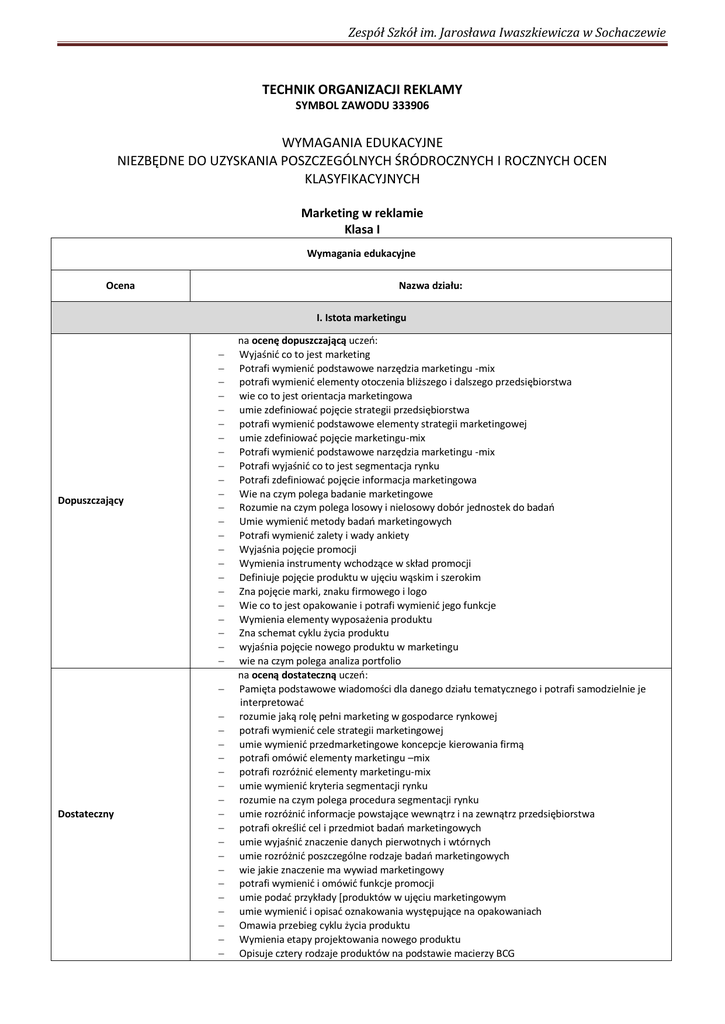 Zespół Szkół im Jarosława Iwaszkiewicza w Sochaczewie TECHNIK ORGANIZACJI REKLAMY SYMBOL ZAWODU 333906 WYMAGANIA EDUKACYJNE NIE)BĘDNE DO UZYSKANIA POS)C)EGÓLNYCH ŚRÓDROC)NYCH I ROCZNYCH OCEN KLASYFIKACYJNYCH Marketing w reklamie Klasa I Wymagania edukacyjne Ocena Nazwa I. Istota marketingu Dopus Dostateczny na W P -mix wie co to jest orientacja marketingowa -mix P P P Wie na czym polega badanie marketingowe R U P W Wymienia inst D ) W W ) uktu -mix wie na czym polega analiza portfolio na : P rketing w gospodarce rynkowej mix -mix u rozumie na czym polega procedura segmentacji rynku wie jakie znaczenie ma wywiad marketingowy Omawia przebi Wymienia etapy projektowania nowego produktu O BCG Zespół Szkół im Jarosława Iwaszkiewicza w Sochaczewie Dobry na ) interpretuje R P Wie na czym polega marketing partnerski W -mix Potrafi scharakt R O O Rozumie jaka jest istota reklamy i jej miejsce w strategii marketingowej W W R P na otoczeniem Bardzo dobry K Przeprowadza i analizuje wywiad grupowy O P P W A na pot ego produktu z BCG C wykracza II. N D na D ) W W ) wego i logo wie na czym polega analiza portfolio na : Dostateczny O Wymienia etapy projektowania nowego produktu O macierzy BCG Dobry na W R P Zespół Szkół im Jarosława Iwaszkiewicza w Sochaczewie Bardzo dobry na P P W Analizuje p BCG na C wyniki, godn wykracza W Ocenianie ucznia o specjal PPP U
