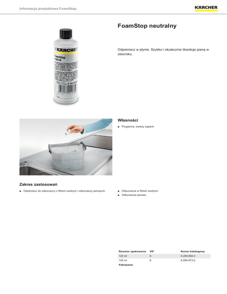 Informacja produktowa FoamStop FoamStop neutralny Odpieniacz w płynie. Szybko i skutecznie likwiduje pianę w zbiorniku. Własności ■ Przyjemny, świeży zapach. Zakres zastosowań ■ Odpieniacz do odkurzaczy z filtrem wodnym i odkurzaczy parowych ■ Odkurzacze w filtrem wodnym ■ Odkurzacze parowe. Rozmiar opakowania VE* Numer katalogowy 125 ml 6 6.290-892.0 125 ml 6 6.295-873.0 Pakowanie Informacja produktowa FoamStop Zastosowanie: Odkurzacze filtrem wodnym / Odkurzacze parowe ■ Wlać 1 zakrętkę Foamstop (2ml) do zbiornika wody ■ W przypadku intensywnej piany, można dodać jeszcze jedną nakrętkę środka Środki ostrożności: ■ Wstrząsnij przed użyciem ■ Chronić przed zamarzaniem. Ostrzeżenia i wytyczne dotycące bezpiecznego użytkowania: ■ Ostrzeżenie ■ H319 Działa drażniąco na oczy. ■ P102 Chronić przed dziećmi. ■ P280 Stosować rękawice ochronne/odzież ochronną/ochronę oczu/ ochronę twarzy. ■ P264 Dokładnie umyć po użyciu. ■ P305 + P351 + P338 W PRZYPADKU DOSTANIA SIĘ DO OCZU: Ostrożnie płukać wodą przez kilka minut. Wyjąć soczewki kontaktowe, jeżeli są i można je łatwo usunąć. Nadal płukać. ■ P337 + P313 W przypadku utrzymywania się działania drażniącego na oczy: Zasięgnąć porady/zgłosić się pod opiekę lekarza. Potrzebujesz więcej informacji? Kärcher Sp. z o.o. ul. Stawowa 138-140 31-346 Kraków Polska Tel: 801 811 234 lub 12 63 97 105 Fax: 12 63 97 111 Email: [email protected]