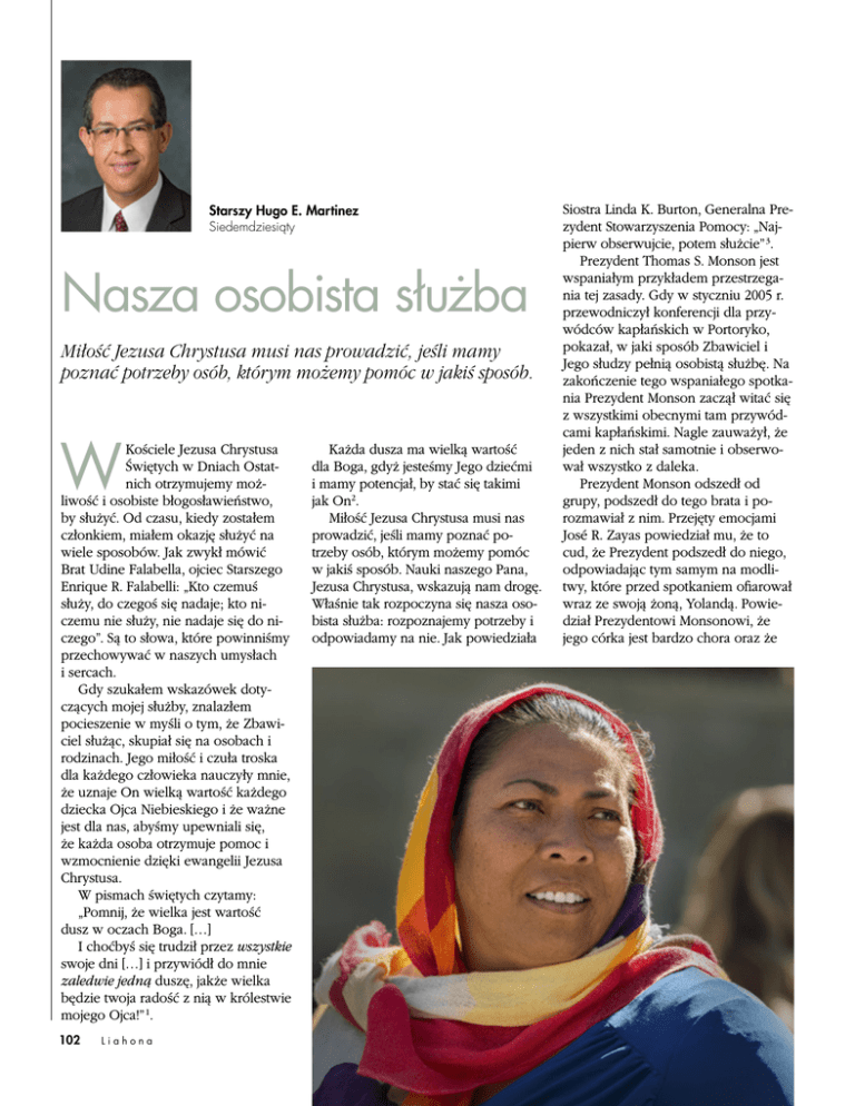 Starszy Hugo E. Martinez Siedemdziesiąty Nasza osobista służba Miłość Jezusa Chrystusa musi nas prowadzić, jeśli mamy poznać potrzeby osób, którym możemy pomóc w jakiś sposób. W Kościele Jezusa Chrystusa Świętych w Dniach Ostatnich otrzymujemy możliwość i osobiste błogosławieństwo, by służyć. Od czasu, kiedy zostałem członkiem, miałem okazję służyć na wiele sposobów. Jak zwykł mówić Brat Udine Falabella, ojciec Starszego Enrique R. Falabelli: „Kto czemuś służy, do czegoś się nadaje; kto niczemu nie służy, nie nadaje się do niczego”. Są to słowa, które powinniśmy przechowywać w naszych umysłach i sercach. Gdy szukałem wskazówek dotyczących mojej służby, znalazłem pocieszenie w myśli o tym, że Zbawiciel służąc, skupiał się na osobach i rodzinach. Jego miłość i czuła troska dla każdego człowieka nauczyły mnie, że uznaje On wielką wartość każdego dziecka Ojca Niebieskiego i że ważne jest dla nas, abyśmy upewniali się, że każda osoba otrzymuje pomoc i wzmocnienie dzięki ewangelii Jezusa Chrystusa. W pismach świętych czytamy: „Pomnij, że wielka jest wartość dusz w oczach Boga. […] I choćbyś się trudził przez wszystkie swoje dni […] i przywiódł do mnie zaledwie jedną duszę, jakże wielka będzie twoja radość z nią w królestwie mojego Ojca!” 1. 102 Liahona Każda dusza ma wielką wartość dla Boga, gdyż jesteśmy Jego dziećmi i mamy potencjał, by stać się takimi jak On2. Miłość Jezusa Chrystusa musi nas prowadzić, jeśli mamy poznać potrzeby osób, którym możemy pomóc w jakiś sposób. Nauki naszego Pana, Jezusa Chrystusa, wskazują nam drogę. Właśnie tak rozpoczyna się nasza osobista służba: rozpoznajemy potrzeby i odpowiadamy na nie. Jak powiedziała Siostra Linda K. Burton, Generalna Prezydent Stowarzyszenia Pomocy: „Najpierw obserwujcie, potem służcie” 3. Prezydent Thomas S. Monson jest wspaniałym przykładem przestrzegania tej zasady. Gdy w styczniu 2005 r. przewodniczył konferencji dla przywódców kapłańskich w Portoryko, pokazał, w jaki sposób Zbawiciel i Jego słudzy pełnią osobistą służbę. Na zakończenie tego wspaniałego spotkania Prezydent Monson zaczął witać się z wszystkimi obecnymi tam przywódcami kapłańskimi. Nagle zauważył, że jeden z nich stał samotnie i obserwował wszystko z daleka. Prezydent Monson odszedł od grupy, podszedł do tego brata i porozmawiał z nim. Przejęty emocjami José R. Zayas powiedział mu, że to cud, że Prezydent podszedł do niego, odpowiadając tym samym na modlitwy, które przed spotkaniem ofiarował wraz ze swoją żoną, Yolandą. Powiedział Prezydentowi Monsonowi, że jego córka jest bardzo chora oraz że ma ze sobą skierowany do Prezydenta list od żony. Brat Zayas powiedział żonie, że przekazanie listu nie będzie możliwe, gdyż Prezydent Monson będzie zbyt zajęty. Prezydent Monson wysłuchał historii i poprosił o list, który w ciszy przeczytał. Następnie włożył go do kieszeni marynarki i powiedział Bratu Zayas, że zajmie się ich prośbą. W ten sposób ta rodzina poczuła dotyk Pana Jezusa Chrystusa przez uczynki Jego sługi. Wierzę, że słowa Zbawiciela z przypowieści o dobrym Samarytaninie odnoszą się do nas: „Idź, i ty czyń podobnie” 4. 21 sierpnia 1998 r. huragan George uderzył w Portoryko, powodując wielkie zniszczenia. Siostrze Martinez, pięciorgu naszych dzieci i mnie udało się we własnym domu przetrwać tę wielką nawałnicę i towarzyszące jej huraganowe wiatry. Jednakże dwa tygodnie spędziliśmy bez bieżącej wody i prądu. Gdy nasze zasoby wody się wyczerpały, zdobycie nowych było utrudnione. Nigdy nie zapomnę braci, którzy służyli nam, dostarczając ten bezcenny płyn ani pełnej miłości służby sióstr. Germán Colón przyjechał do naszego domu z dużym plastikowym zbiornikiem wody na pick-upie. W następujących słowach wyjaśnił swoją motywację: „Wiem, że macie małe dzieci, które potrzebują wody”. Kilka dni później Bracia Noel Muñoz i Herminio Gómez załadowali trzy duże zbiorniki wody na samochód z platformą ładunkową. Niespodziewanie zjawili się w naszym domu i napełnili wodą pitną wszystkie dostępne butelki. Zaoferowali również tę możliwość naszym sąsiadom. Nasze modlitwy zostały wysłuchane dzięki ich osobistej służbie. W twarzach tych braci można było dostrzec miłość, jaką Jezus Chrystus ma dla nas, a ich osobista służba — innymi słowy ich posługa — wniosła do naszego życia dużo więcej niż tylko wodę pitną. Dla każdego syna i córki Boga wiedza o tym, że ludzie interesują się nimi i dbają o ich dobro, jest bardzo ważna. Świadczę wam, że Ojciec Niebieski i nasz Pan, Jezus Chrystus, znają osobiście każdego z nas. Z tego powodu zapewniają nam wszystko, czego potrzebujemy, abyśmy mieli możliwość osiągnięcia naszego boskiego potencjału. Na naszych ścieżkach stawiają ludzi, którzy nam pomagają. Gdy stajemy się narzędziami w rękach Boga Ojca i Jezusa, jesteśmy w stanie służyć i pomagać tym, których Oni wskażą nam przez objawienie. W ten sposób Pan Jezus Chrystus dotrze do wszystkich dzieci Ojca Niebieskiego. Dobry Pasterz zgromadzi wszystkie Swoje owce. Po kolei dotrze do każdej osoby, która dzięki wolnej woli dokona właściwego wyboru, gdy usłyszy głos Jego sług i przyjmie ich posługę. Wtedy poznają Jego głos i za Nim podążą. Taka osobista służba jest nieodłączną częścią dochowywania naszych przymierzy chrztu. W podobny sposób dobry przykład ucznia Jezusa Chrystusa, jaki dajemy, jest najlepszym listem polecającym dla osób, z którymi możemy podzielić się Jego ewangelią. Gdy otwieramy usta i mówimy o ewangelii Jezusa Chrystusa, stajemy się „Jego pasterskimi pomocnikami, odpowiedzialnymi za odżywianie owiec z Jego pastwiska i jagniąt z Jego stada” 5, stajemy się „[słabymi i prostymi]