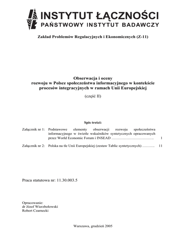 Zakład Problemów Regulacyjnych i Ekonomicznych (Z-11) Obserwacja i oceny rozwoju w Polsce społeczeństwa informacyjnego w kontekście procesów integracyjnych w ramach Unii Europejskiej (część II) Spis treści: Załącznik nr 1: Podstawowe elementy obserwacji rozwoju społeczeństwa informacyjnego w świetle wskaźników syntetycznych opracowanych przez World Economic Forum i INSEAD ……………………………. 1 Załącznik nr 2: Polska na tle Unii Europejskiej (zestaw Tablic syntetycznych) ………. 11 Praca statutowa nr: 11.30.003.5 Opracowanie: dr Józef Wierzbołowski Robert Czarnecki Warszawa, grudzień 2005 Źródło: Raporty World Economic Forum: • The Global Information Technology Report 2004/2005 • The Lisbon Reviev 2004. An Assessment of Policies and Reforms in Europe • The Global Competitiveness Report 2005/2006 © Copyright by Instytut Łączności, Warszawa 2005 Załącznik nr 1 Podstawowe elementy obserwacji rozwoju społeczeństwa informacyjnego w świetle wskaźników syntetycznych opracowanych przez World Economic Forum i INSEAD Spis treści: I. Definicje i parametry z zakresu Networked Readiness Index (NRI)...................................... 2 II. Definicje z zakresu The Lisbon Review Ranking 2004 (LRR)............................................. 6 III. Definicje wskaźników z zakresu międzynarodowej konkurencyjności............................... 8 I. Definicje i parametry z zakresu Networked Readiness Index (NRI) 1. Network Readiness Index (NRI) – wskaźnik ogólny - wskaźnik stanowiący miernik skłonności kraju do wykorzystywania możliwości rozwojowych, jakie stwarzają technologie informacyjne (ICT) 1 Network Readiness Index (NRI) – wskaźnik ogólny wyliczany jest przy uwzględnieniu trzech subindeksów, do których należą: (1) Subindeks: Environment (Stan środowiska społeczno-gospodarczego) , który służy do pomiaru, w jakim stopniu stan środowiska społeczno-gospodarczego w danym kraju sprzyja rozwojowi i wykorzystywaniu ICT. Przy ustalaniu wielkości tego subindeksu uwzględnia się: a) subindeks II rzędu: Market Environment (Stan otoczenia rynkowego) , który ma na celu oszacowanie, czy i na ile występują w kraju zasoby kapitału ludzkiego i pomocnicze rodzaje działalności gospodarczej wspierające rozwój społeczeństwa informacyjnego, w tym zwłaszcza takie czynniki, jak: • wykwalifikowana siła robocza, • zdolność finansowa gospodarki, • poziom rozwoju środowiska biznesowego, b) subindeks II rzędu: Political/Regulatory Environment (Stan środowiska politycznego i regulacyjnego), uwzględniający priorytety krajowe, tak jak znajdują swe odbicie w prowadzonej polityce i w regulacjach prawnych, wspólnie wpływających na stopę wzrostu i na kierunki rozwoju, c) subindeks II rzędu: Infrastructure Environment (Stan infrastruktury), odzwierciedlający poziom osiągalności i jakości infrastruktury zapewniającej dostęp do podstawowych zastosowań ICT w danym kraju. (2) Subindeks: Readiness (Stan gotowości do wykorzystywania ICT), obrazujący stan gotowości kraju do wykorzystywania ICT mierzony zdolnością głównych aktorów społecznych (poszczególnych mieszkańców, środowiska gospodarczego oraz administracji publicznej) do zwiększania roli ICT jako czynnika rozwoju społeczno-gospodarczego (to leverage the potential of ICT). Przy ustalaniu tego subindeksu uwzględnia się: a) subindeks II rzędu: Individual Readiness (Stan gotowości mieszkańców do wykorzystywania ICT), ilustrujący stopień gotowości mieszkańców danego kraju do wykorzystywania ICT i zwiększania znaczenia tych technologii w swym życiu, przy czym do czynników branych pod uwagę zalicza się: • poziom alfabetyzacji, • rodzaj i miejsce korzystania z Internetu, • poziom dostępu do sieci (connectivity), b) subindeks II rzędu: Business Readiness (Stan gotowości organizacji gospodarczych do wykorzystywania ICT), ilustrujący stopień gotowości podstawowych działów gospodarki 1 W świetle alternatywnej definicji NRI służy do pomiaru stopnia przygotowania kraju do współudziału w rozwoju ICT i do korzystania z tego rozwoju. 2 (a cross section of business) do uczestniczenia w działalności prowadzonej z użyciem ICT, i do odnoszenia korzyści z tej działalności (problem dotyczy nie tylko wielkich korporacji, lecz również małych i średnich przedsiębiorstw i ich skłonności do wykorzystywania ICT i do inwestowania w alfabetyzację cyfrową swych pracowników), c) subindeks II rzędu: Government Readiness (Stan gotowości ze strony władzy politycznej i administracji do wykorzystywania ICT), wskazujący na stopień gotowości aparatu władzy do wykorzystywania ICT, co znajduje swoje odbicie w: • mechanizmach podejmowania decyzji politycznych (policy-making machinery) i w wewnętrznych procesach funkcjonowania administracji rządowej 2 , • dostępności usług administracji rządowej w trybie on-line. (3) Subindeks: Usage (Stan wykorzystywania ICT), obrazujący wpływ, jaki ICT wywierają na podstawowych aktorów życia społeczno-gospodarczego, a więc indywidualnych mieszkańców, organizacje gospodarcze i administrację publiczną, przy czym oszacowaniu podlegają zmiany zachodzące w zachowaniach społecznych i stylu życia, oraz zmiany w innych czynnikach zarówno gospodarczych, jak i pozagospodarczych, na które oddziałują te technologie. Przy ustaleniu tego subindeksu uwzględnia się: a) subindeks II rzędu: Individual Usage (Stan wykorzystywania ICT przez mieszkańców), który obrazuje stopień adaptacji i wykorzystywania ICT przez poszczególnych mieszkańców danego kraju na podstawie oszacowania: • stopnia rozpowszechnienia technologii wpływających na wzrost przepływu informacji (connectivity-enchancing technologies), takich jak telefony i urządzenia zapewniające łączność internetową, • poziom wykorzystywania Internetu, • wydatki ponoszone na wykorzystywanie sieci, b) subi