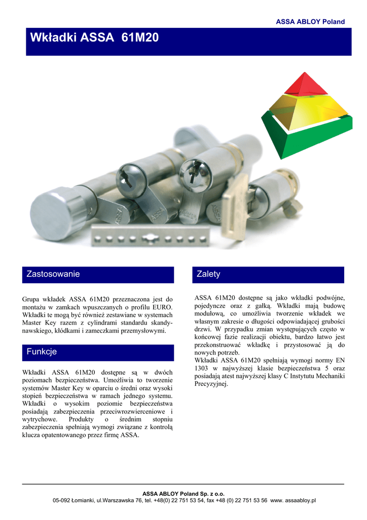 ASSA ABLOY Poland Wkładki ASSA 61M20 Zastosowanie Grupa wkładek ASSA 61M20 przeznaczona jest do montażu w zamkach wpuszczanych o profilu EURO. Wkładki te mogą być również zestawiane w systemach Master Key razem z cylindrami standardu skandynawskiego, kłódkami i zameczkami przemysłowymi. Funkcje Wkładki ASSA 61M20 dostępne są w dwóch poziomach bezpieczeństwa. Umożliwia to tworzenie systemów Master Key w oparciu o średni oraz wysoki stopień bezpieczeństwa w ramach jednego systemu. Wkładki o wysokim poziomie bezpieczeństwa posiadają zabezpieczenia przeciwrozwierceniowe i wytrychowe. Produkty o średnim stopniu zabezpieczenia spełniają wymogi związane z kontrolą klucza opatentowanego przez firmę ASSA. Zalety ASSA 61M20 dostępne są jako wkładki podwójne, pojedyncze oraz z gałką. Wkładki mają budowę modułową, co umożliwia tworzenie wkładek we własnym zakresie o długości odpowiadającej grubości drzwi. W przypadku zmian występujących często w końcowej fazie realizacji obiektu, bardzo łatwo jest przekonstruować wkładkę i przystosować ją do nowych potrzeb. Wkładki ASSA 61M20 spełniają wymogi normy EN 1303 w najwyższej klasie bezpieczeństwa 5 oraz posiadają atest najwyższej klasy C Instytutu Mechaniki Precyzyjnej. ASSA ABLOY Poland Sp. z o.o. 05-092 Łomianki, ul.Warszawska 76, tel. +48(0) 22 751 53 54, fax +48 (0) 22 751 53 56 www. assaabloy.pl ASSA ABLOY Poland Wkładki ASSA 61M20 Rodzaje wkładek Sposób doboru długości wkładki 1.Dane wkładek M20 oraz akcesoriów: a) dokonaj pomiaru grubości drzwi (A) b) dokonaj pomiaru odległości od środka zamka do zewnętrznej krawędzi drzwi (B) c) dokonaj pomiaru odległości między środkiem zamka a wewnętrzną krawędzią drzwi (C) d) dodaj grubość szyldu do odległości (B) oraz (C). Wynik to długość wkładki/wkładki z gałką Akcesoria do wkładek 61M20 XXM23 Wkładka podwójna XXM23 Wkładka pojedyncza XXM23 Wkładka pojedyncza ASSA ABLOY Poland Sp. z o.o. 05-092 Łomianki, ul.Warszawska 76, tel. +48(0) 22 751 53 54, fax +48 (0) 22 751 53 56 www. assaabloy.pl